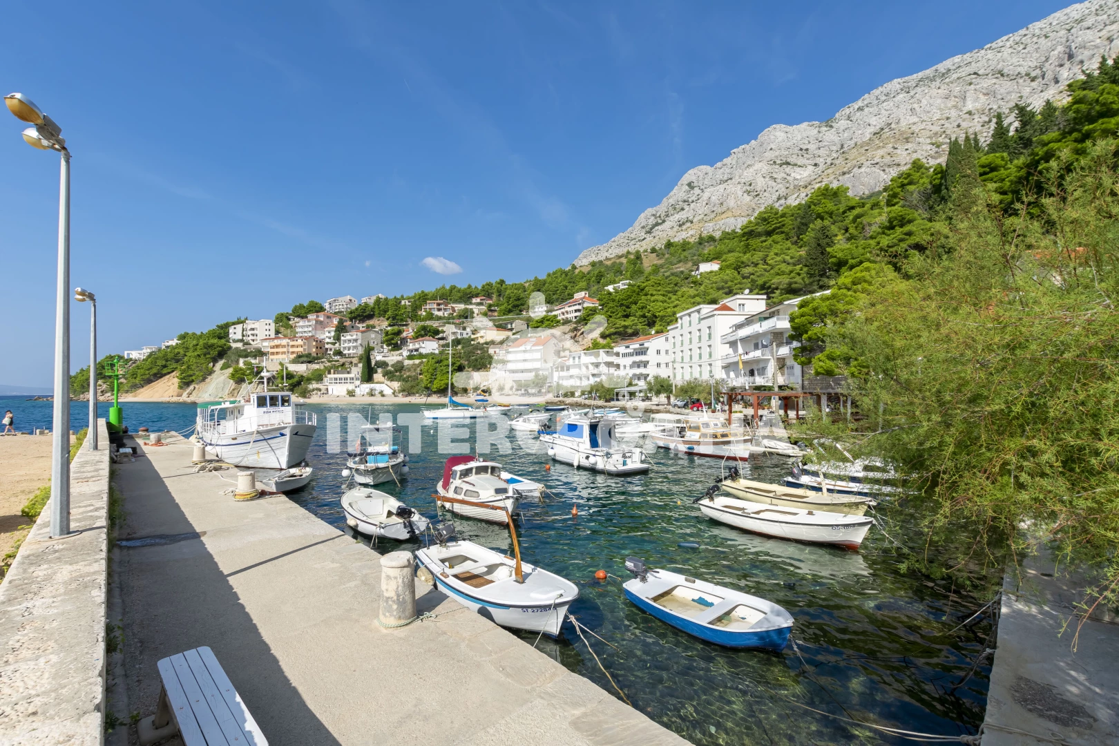Vzdálenosti: Moře a oblázková pláž 300 m (cesta se schody), centrum, obchod s potravinami, směnárna, veřejná doprava, pošta a bar 350 m, restaurace 500 m, čerpací stanice, ambulance, lékárna, přístav, potápění a banka 10 km, trajekt (Makarska) 25 km, letiště (Split) 54 km.