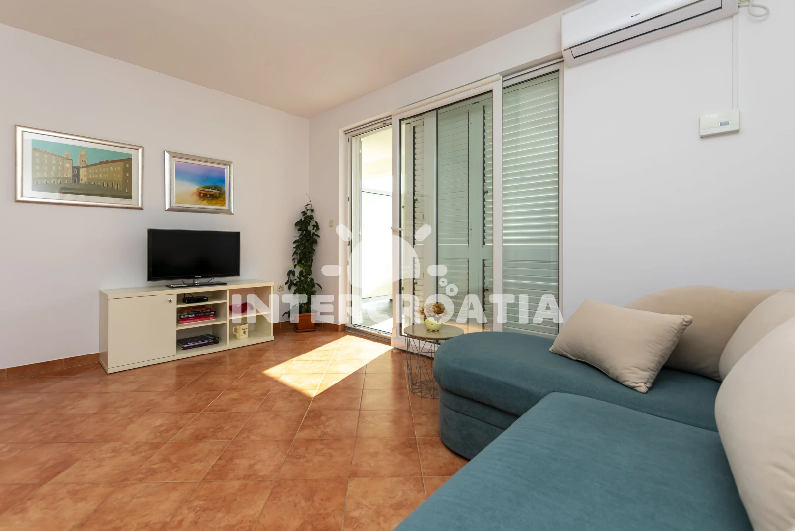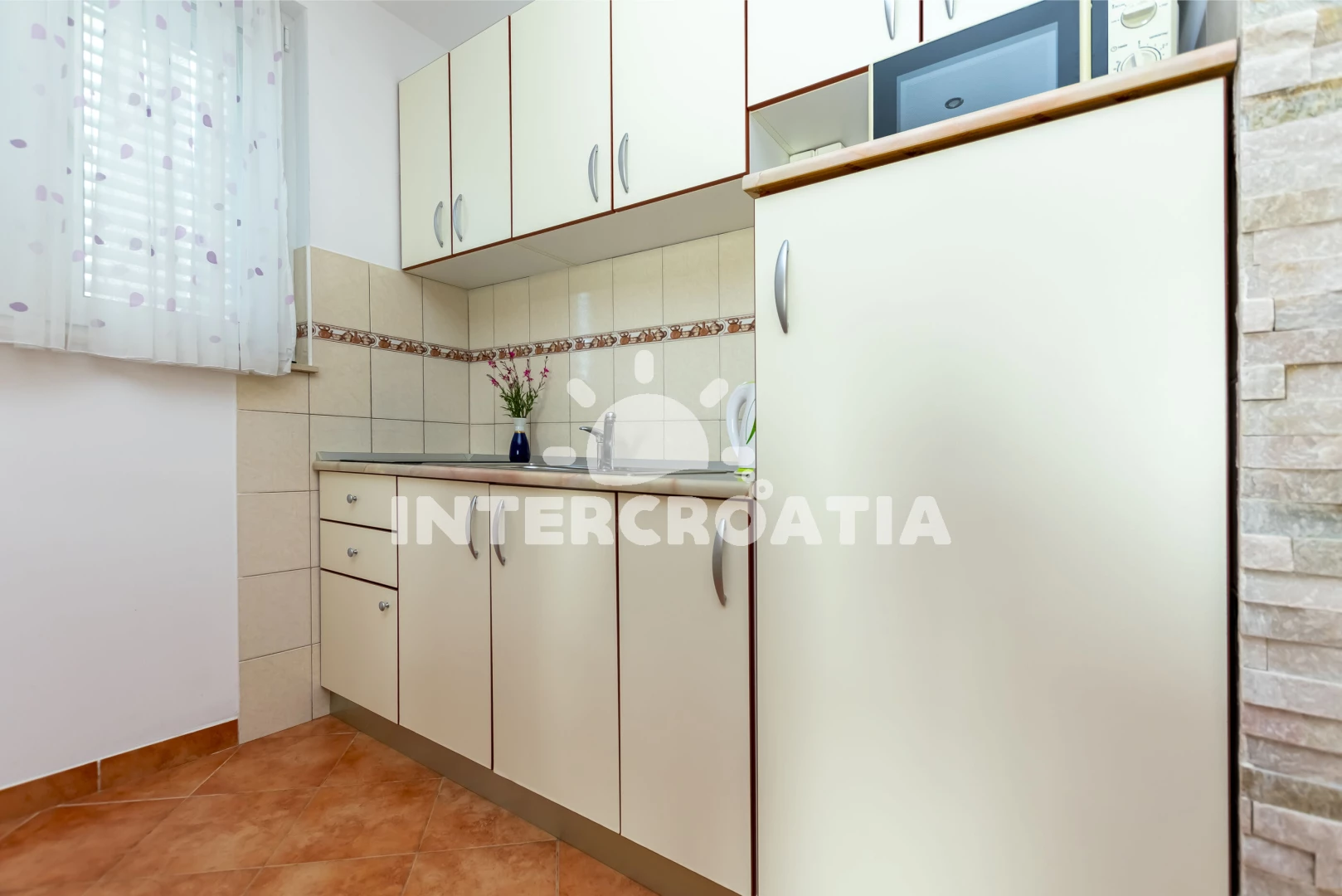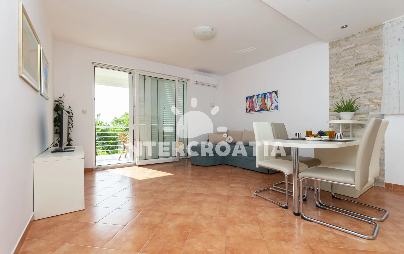 Apartmán (43 m2) s balkonem, venkovním posezením a výhledem na moře se nachází v 1. patře vily. Apartmán má 1 ložnici a je vhodný pro 2 až 3 osoby. Obývací pokoj je spojený s kuchyní. Kuchyňská linka je vybavena dvouplotýnkovým vařičem, mikrovlnnou troubou, kávovarem, nádobím a lednicí s mrazákem. Obývací pokoj s jídelním stolem, pohovkou (rozložitelná na extra lůžko pro 1 osobu), televizí, klimatizací a vstupem na balkon. Ložnice s jedním dvoulůžkem. Koupelna se sprchovým koutem, umyvadlem, fénem, pračkou a wc. Hostům je k dispozici parkování u vily zdarma.