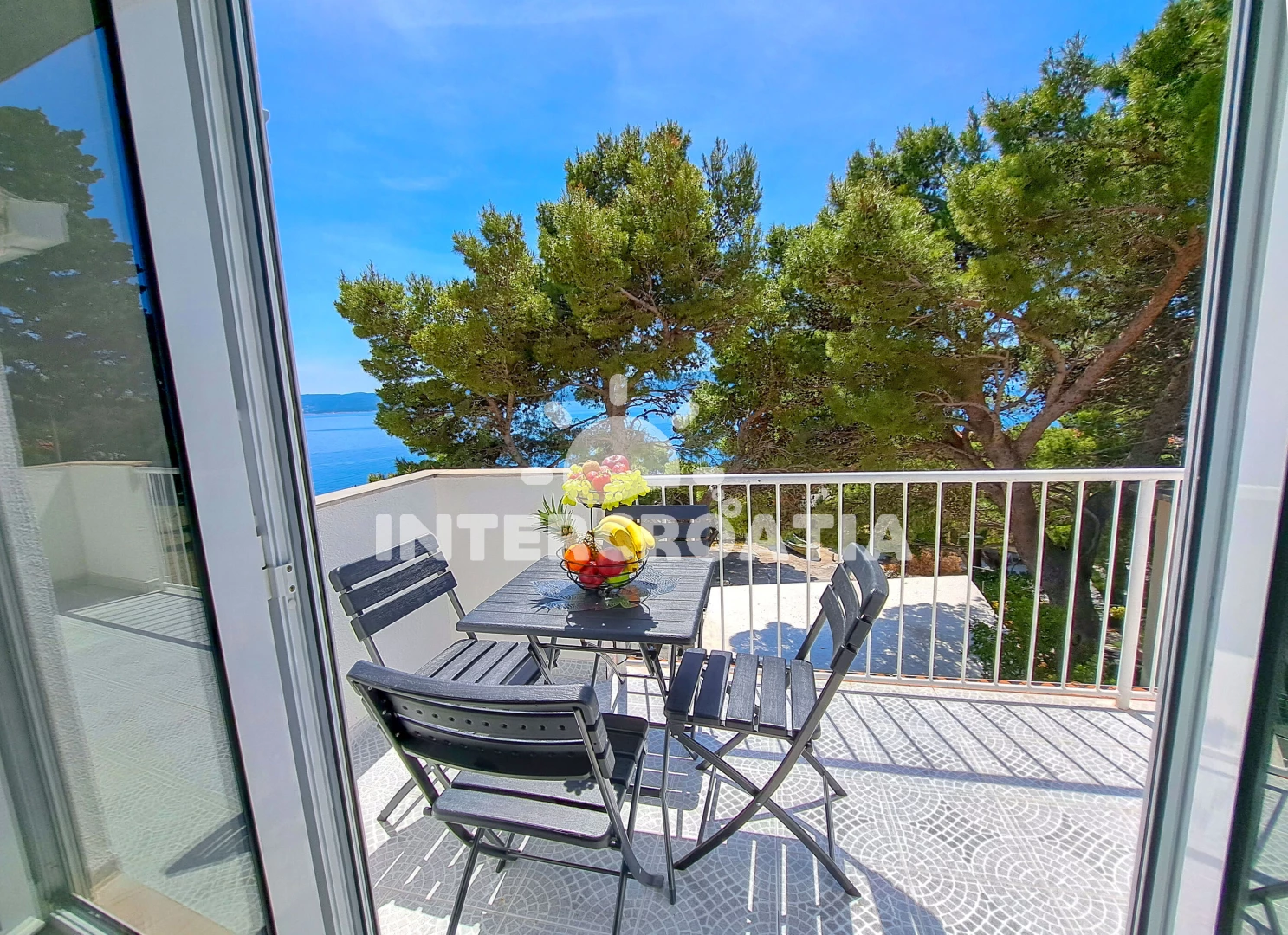 Apartmán (40 m2) s terasou, venkovním posezením a výhledem na moře se nachází ve 2. patře domu. Apartmán má 1 ložnici a je vhodný pro až 4 osoby. Obývací pokoj je spojený s kuchyní. Kuchyňská linka je vybavena dvouplotýnkovým vařičem, myčkou na nádobí, mikrovlnnou troubou, rychlovarnou konvicí, nádobím a lednicí s mrazákem. Obývací pokoj s jídelním stolem, pohovkou (rozložitelná na extra lůžko pro 2 osoby), televizí, klimatizací a vstupem na terasu. Ložnice s dvoulůžkem. Koupelna se sprchovým koutem, umyvadlem, fénem a wc. Hostům je k dispozici parkování u objektu zdarma.
