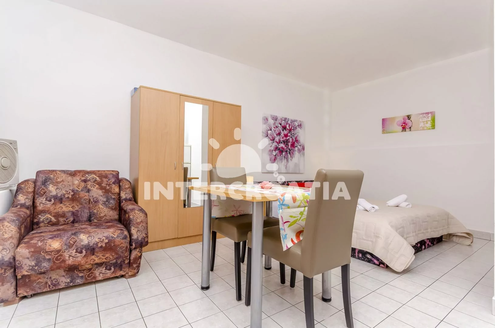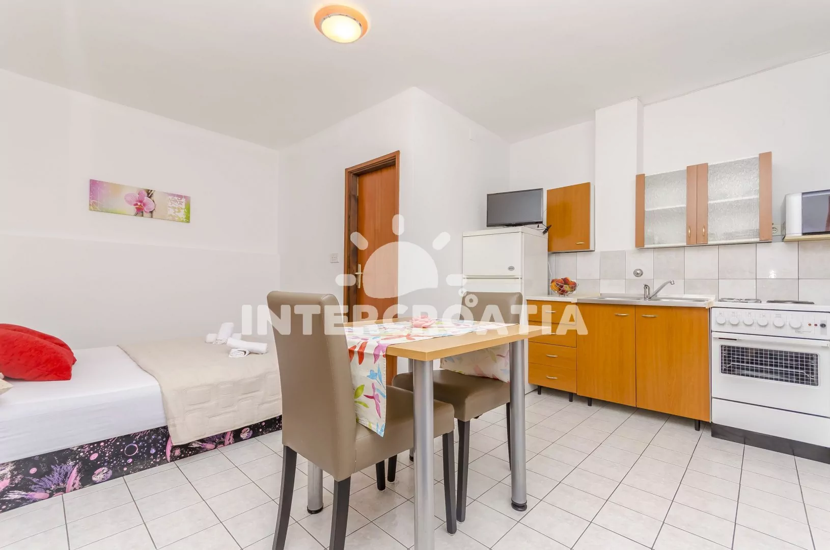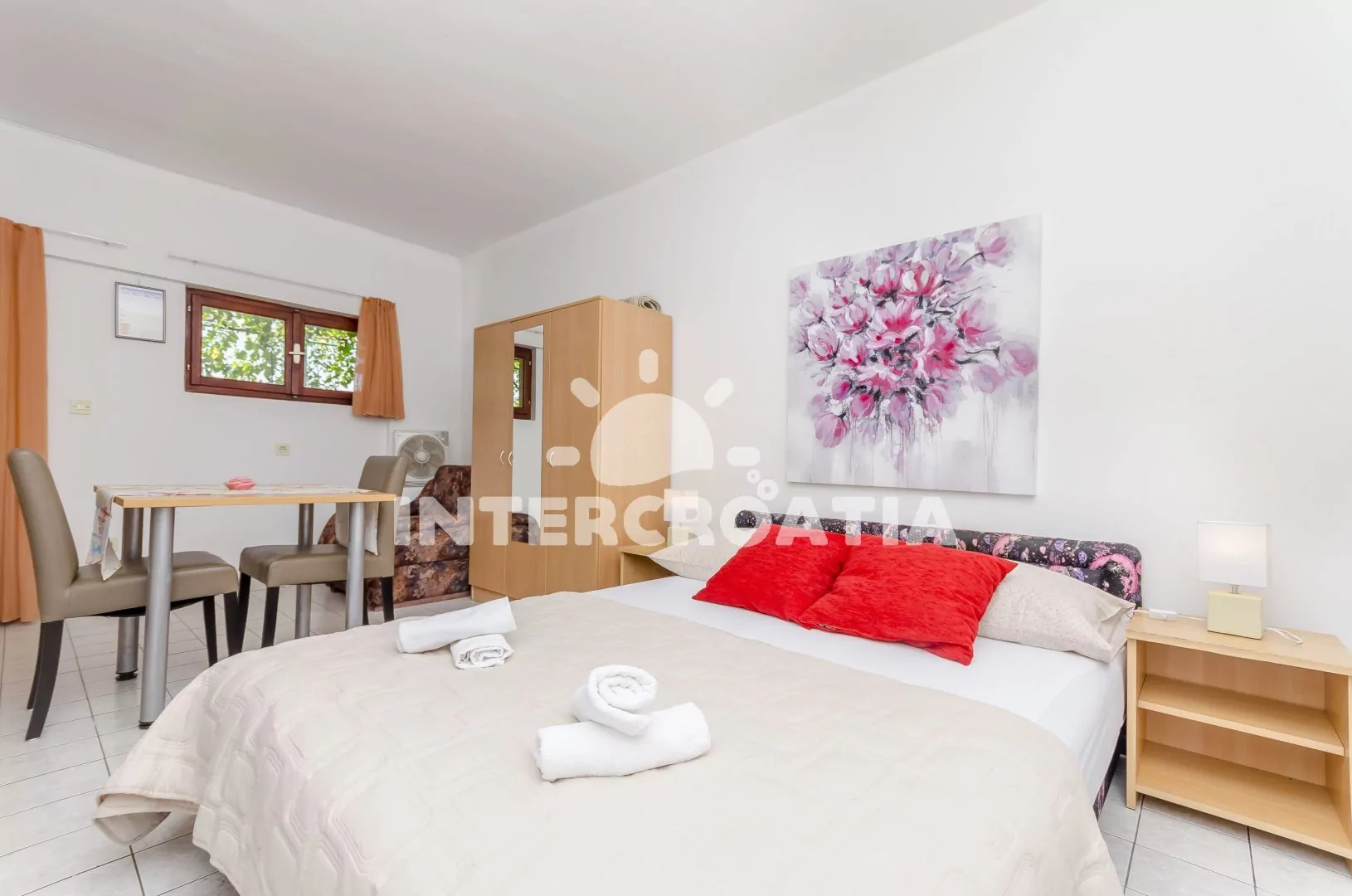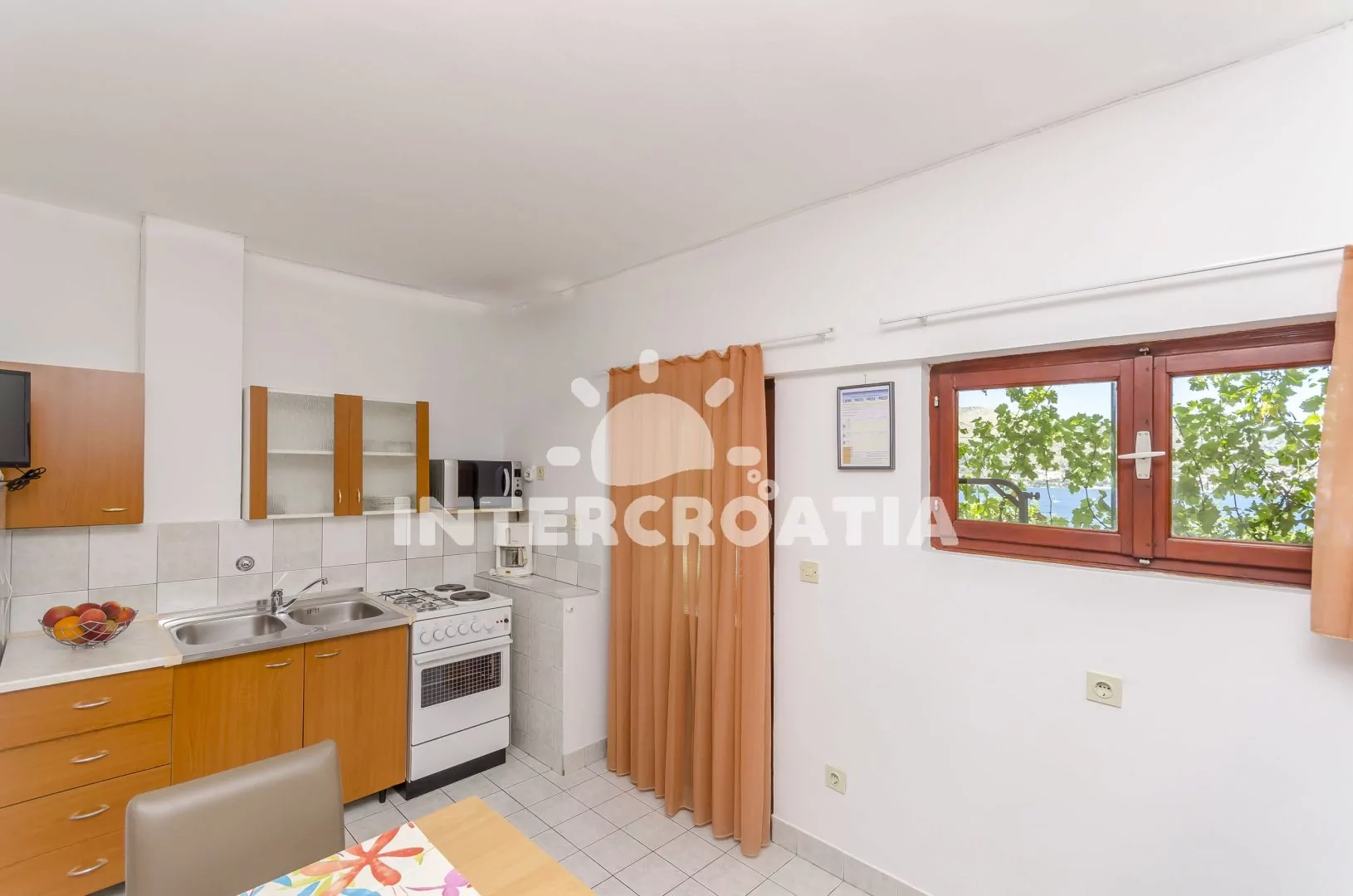 Apartmán typu studio s terasou s posezením, nacházející se v přízemí. Obývací pokoj spojený s kuchyní. Kuchyňská linka se sporákem, troubou, lednicí s mrazákem, rychlovarnou konvicí a nádobím. V obývacím pokoji dvoulůžko, jídelní stůl pro 2 osoby, křeslo a LCD televize se satelitem. Koupelna s vanou, umyvadlem a wc. Hosté mají k dispozici terasu s posezením, krásným výhledem na moře a v zahradě gril. Parkování u objektu.