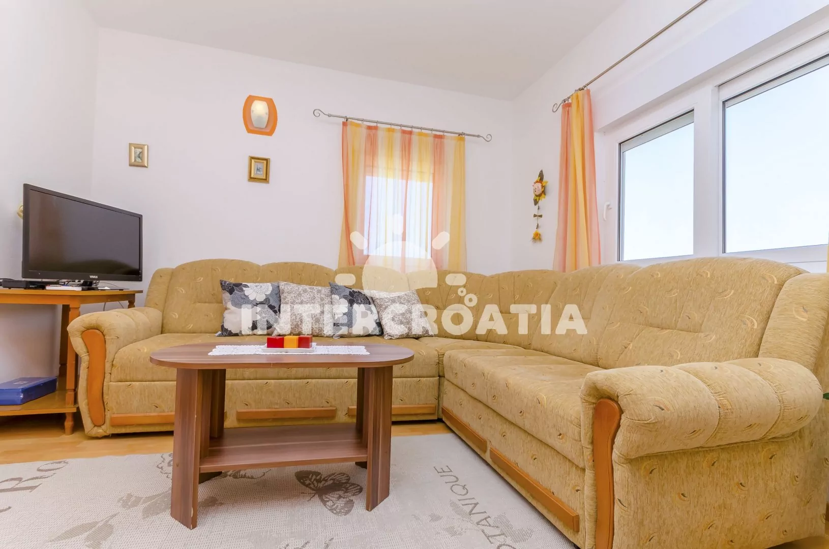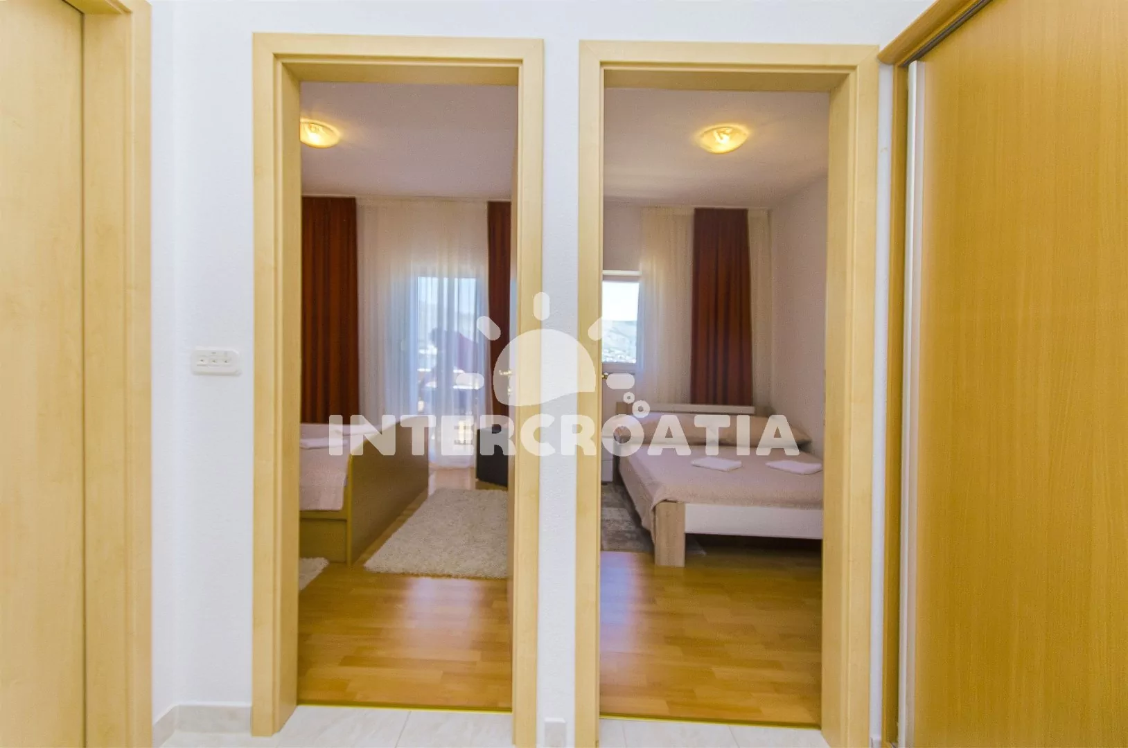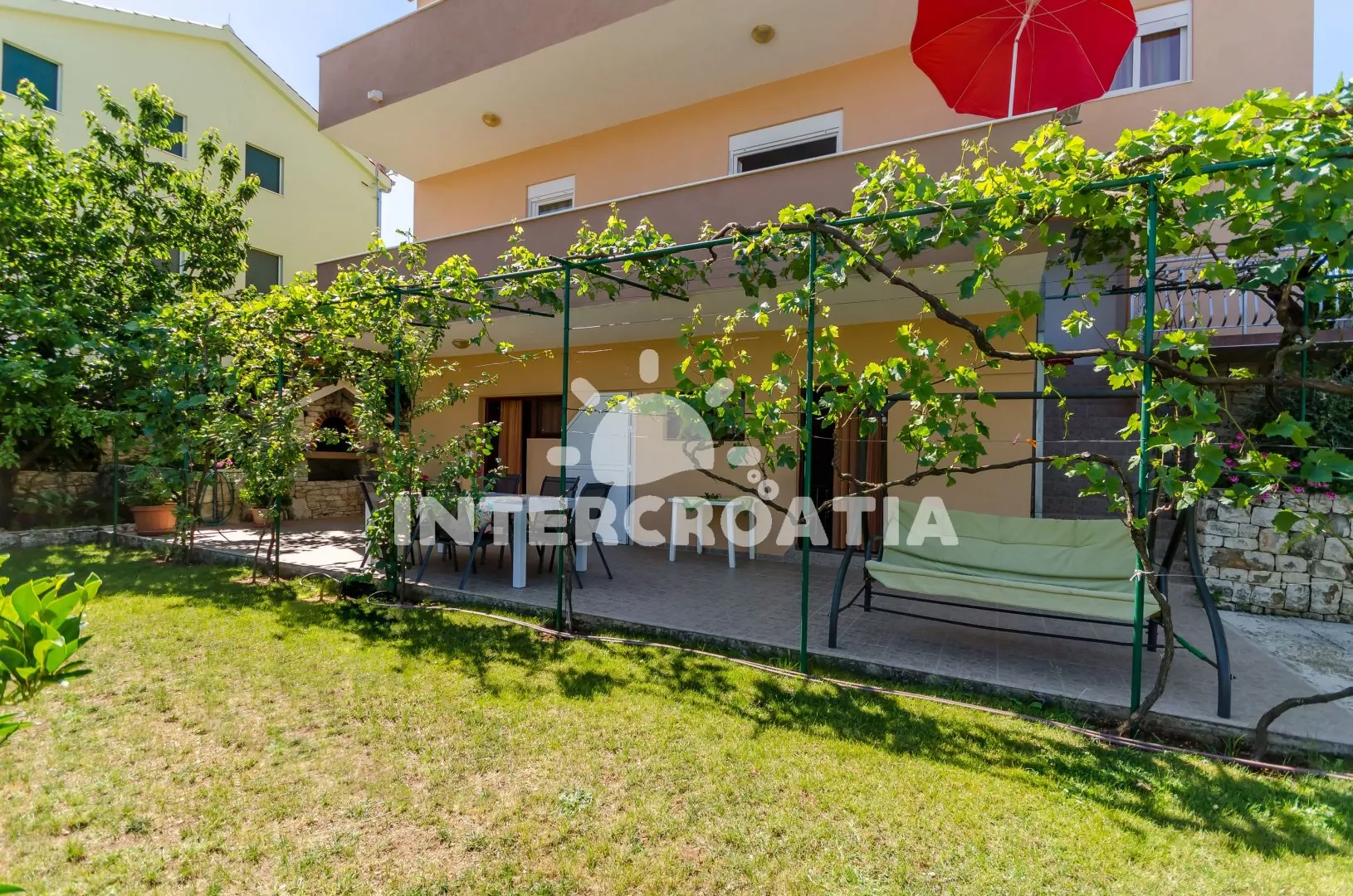 Apartmán se třemi pokoji a terasou s posezením, nacházející se v 2. patře domu. Obývací pokoj spojený s kuchyní. Kuchyňská linka se sporákem, troubou, lednicí s mrazákem, kávovarem a nádobím. V obývacím pokoji jídelní stůl pro 4 osoby, pohovka a LCD televize se satelitem. Dvě ložnice, každá s dvoulůžkem. Koupelna s vanou, umyvadlem, wc, bidetem a pračkou. Hosté mají k dispozici terasu s posezením a v zahradě gril. Parkování u objektu.