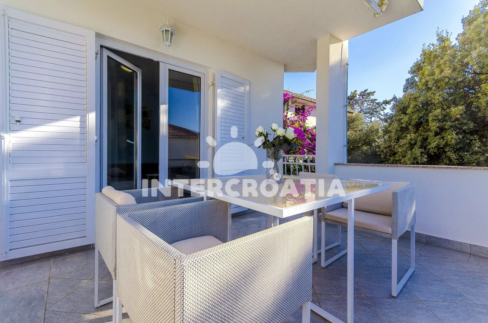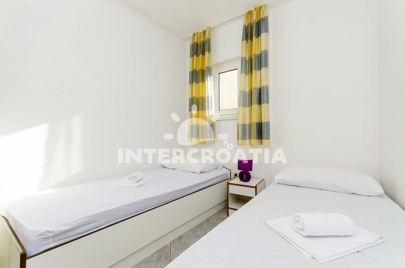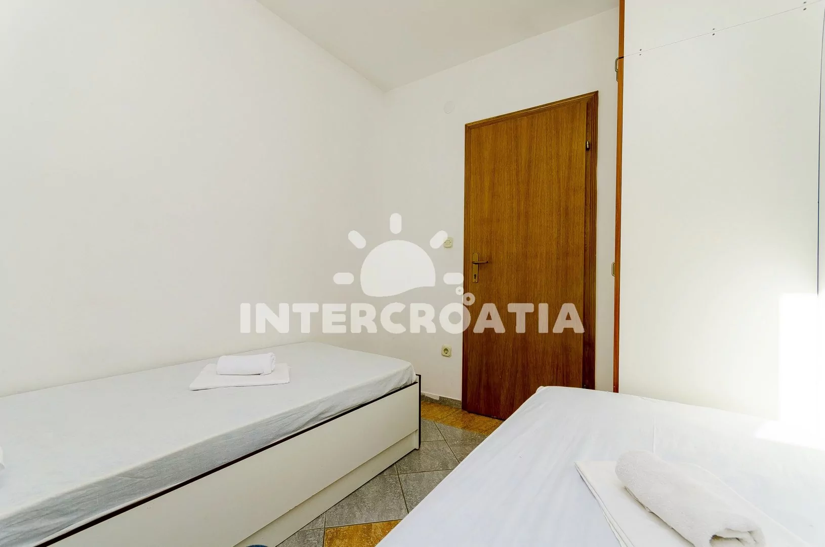 Apartmán (36 m2) s terasou a venkovním posezením se nachází v 1. patře vily. Apartmán má 2 ložnice, 2 koupelny a je vhodný pro 4 osoby. Obývací pokoj je spojený s kuchyní. Kuchyňská linka je vybavena dvouplotýnkovým vařičem, mikrovlnnou troubou, rychlovarnou konvicí, kávovarem, toustovačem, nádobím a lednicí s mrazákem. Obývací pokoj s jídelním stolem, rohovou pohovkou, televizí, klimatizací a vstupem na terasu. První ložnice s dvoulůžkem a klimatizací. Druhá ložnice s dvěma jednolůžky. Dvě koupelny se sprchovým koutem, umyvadlem a wc. Hostům je k dispozici parkování u objektu zdarma.