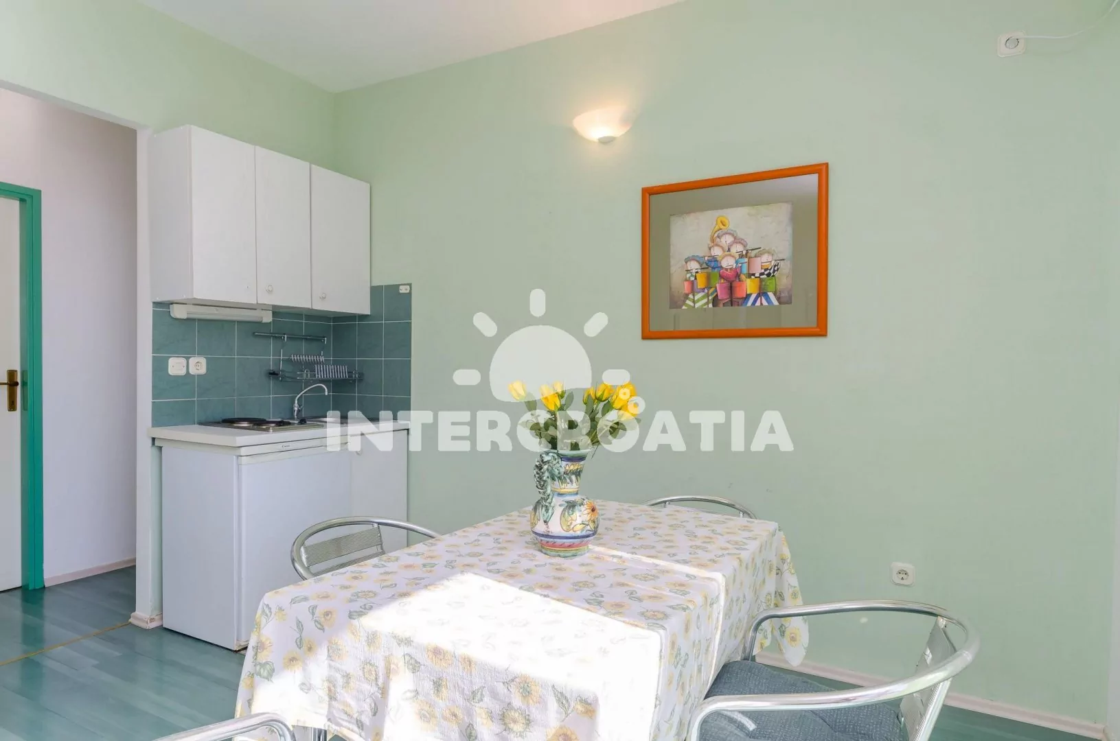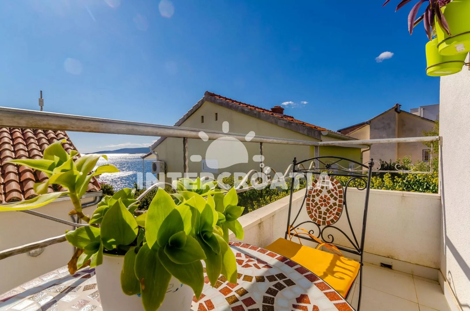 Apartmán (35 m2) s balkonem, posezením a výhledem na moře se nachází v 1. patře domu. Apartmán má 1 ložnici a je vhodný pro 2 až 4 osoby. Obývací pokoj je spojený s kuchyní. Kuchyňská linka je vybavena dvouplotýnkovým vařičem, mikrovlnnou troubou, nádobím a lednicí s mrazákem, (na požádání kávovar). Obývací pokoj s jídelním stolem pro 4 osoby, pohovkou (rozložitelná na extra lůžko pro 2 osoby), televizí se satelitním programem, klimatizací a vstupem na balkon. Ložnice s jedním dvoulůžkem. Koupelna se sprchovým koutem, umyvadlem a wc. Hostům je k dispozici parkování u objektu zdarma.