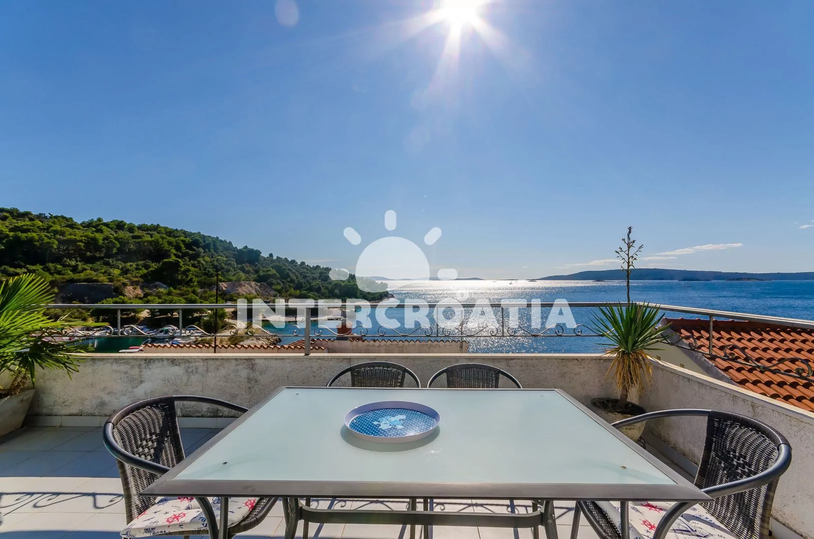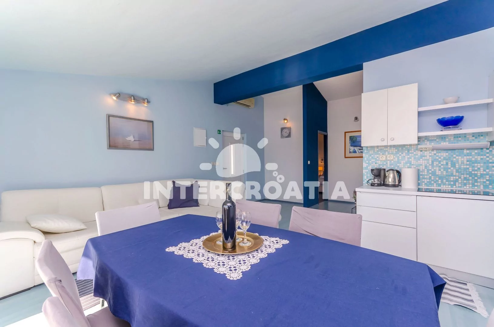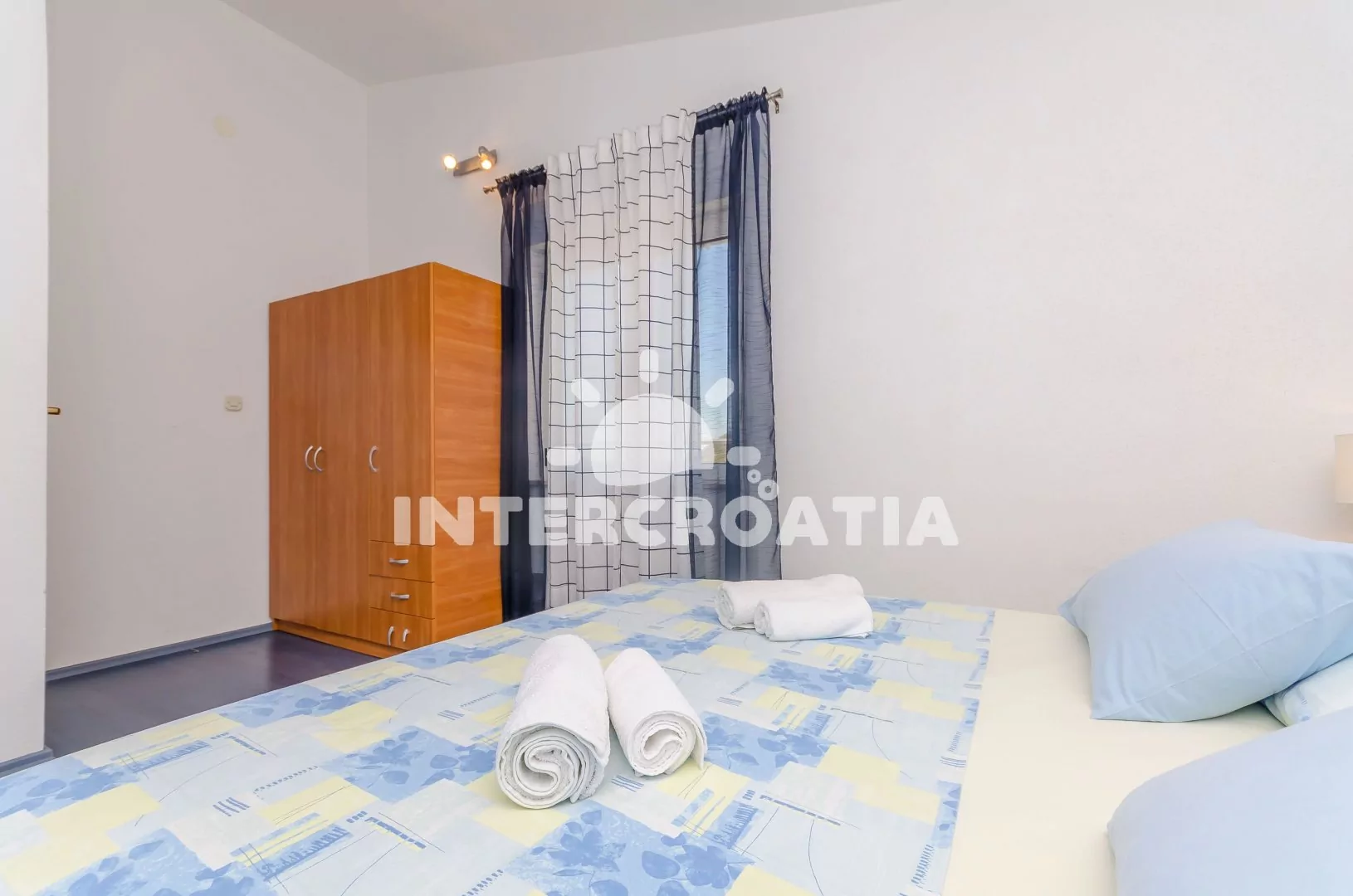 Apartmán (55 m2) s terasou, posezením, lehátky a nádherným výhledem na moře se nachází ve 2. patře domu. Apartmán má 2 ložnice a je vhodný pro 4 až 6 osob. Obývací pokoj je spojený s kuchyní. Kuchyňská linka je vybavena sklokeramickou varnou deskou, vestavěnou troubou, nádobím a lednicí s mrazákem, (na požádání kávovar). Obývací pokoj s jídelním stolem pro 6 osob, pohovkou (rozložitelná na extra lůžko pro 2 osoby), televizí se satelitním programem, klimatizací a vstupem na terasu. První ložnice s jedním dvoulůžkem. Druhá ložnice s dvěma jednolůžky. Koupelna se sprchovým koutem, umyvadlem a wc. Hostům je k dispozici parkování u objektu zdarma.