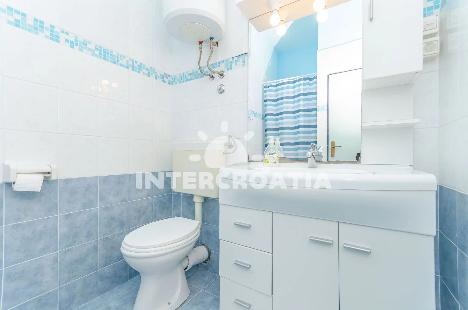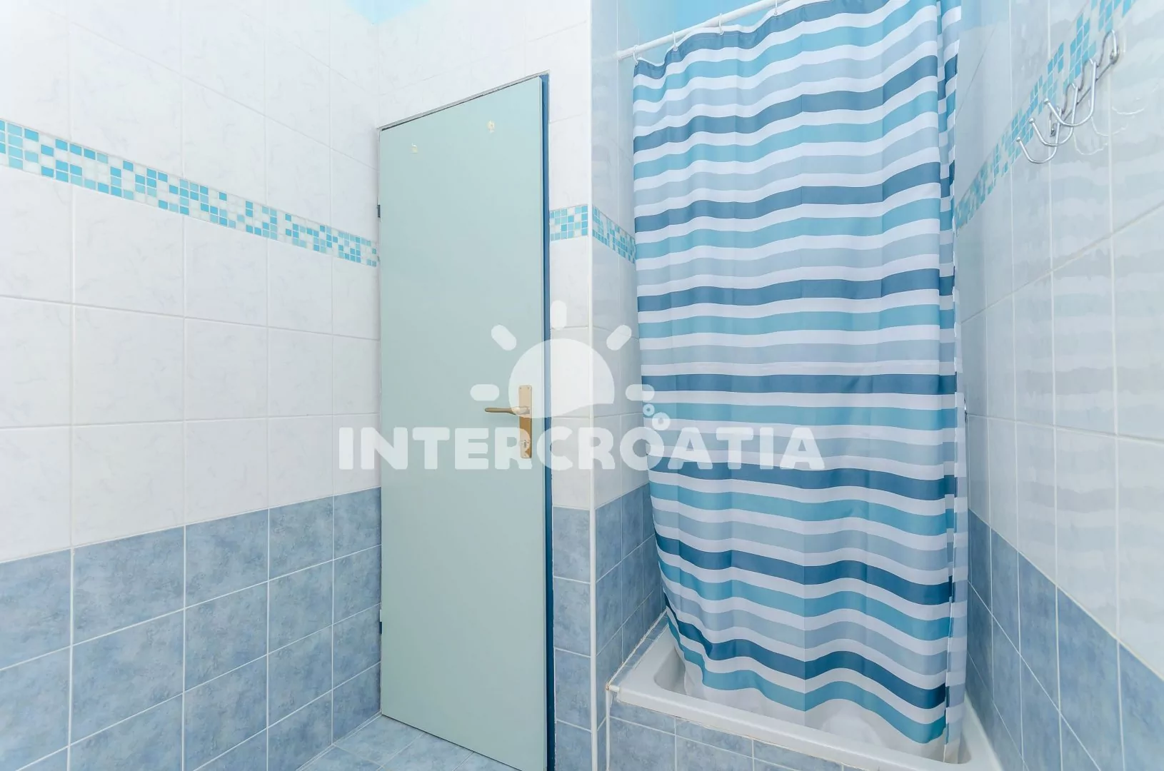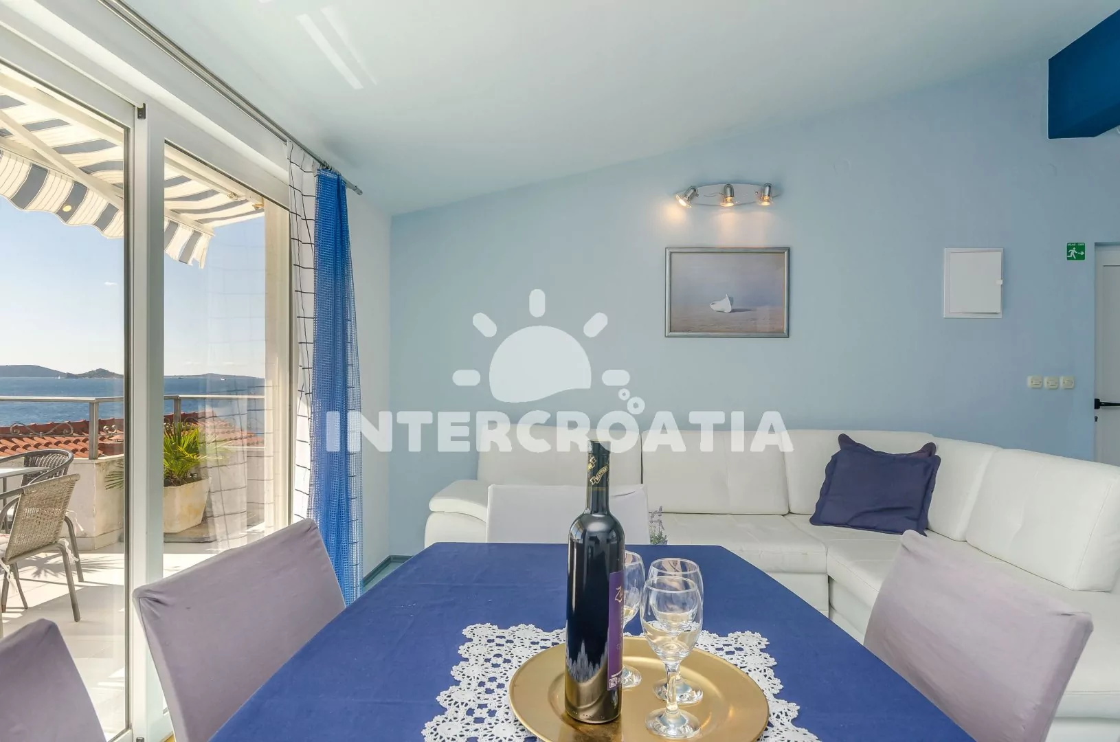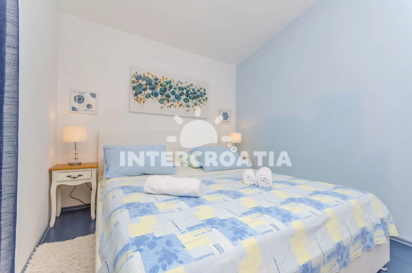 Apartmán (55 m2) s terasou, posezením, lehátky a nádherným výhledem na moře se nachází ve 2. patře domu. Apartmán má 2 ložnice a je vhodný pro 4 až 6 osob. Obývací pokoj je spojený s kuchyní. Kuchyňská linka je vybavena sklokeramickou varnou deskou, vestavěnou troubou, nádobím a lednicí s mrazákem, (na požádání kávovar). Obývací pokoj s jídelním stolem pro 6 osob, pohovkou (rozložitelná na extra lůžko pro 2 osoby), televizí se satelitním programem, klimatizací a vstupem na terasu. První ložnice s jedním dvoulůžkem. Druhá ložnice s dvěma jednolůžky. Koupelna se sprchovým koutem, umyvadlem a wc. Hostům je k dispozici parkování u objektu zdarma.