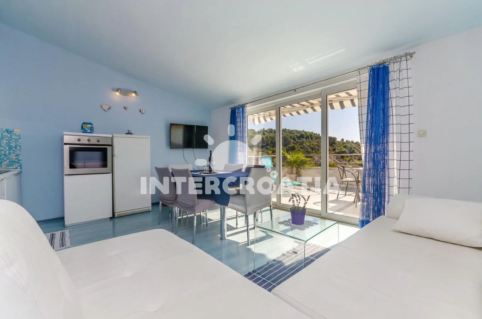 Apartmán (55 m2) s terasou, posezením, lehátky a nádherným výhledem na moře se nachází ve 2. patře domu. Apartmán má 2 ložnice a je vhodný pro 4 až 6 osob. Obývací pokoj je spojený s kuchyní.…