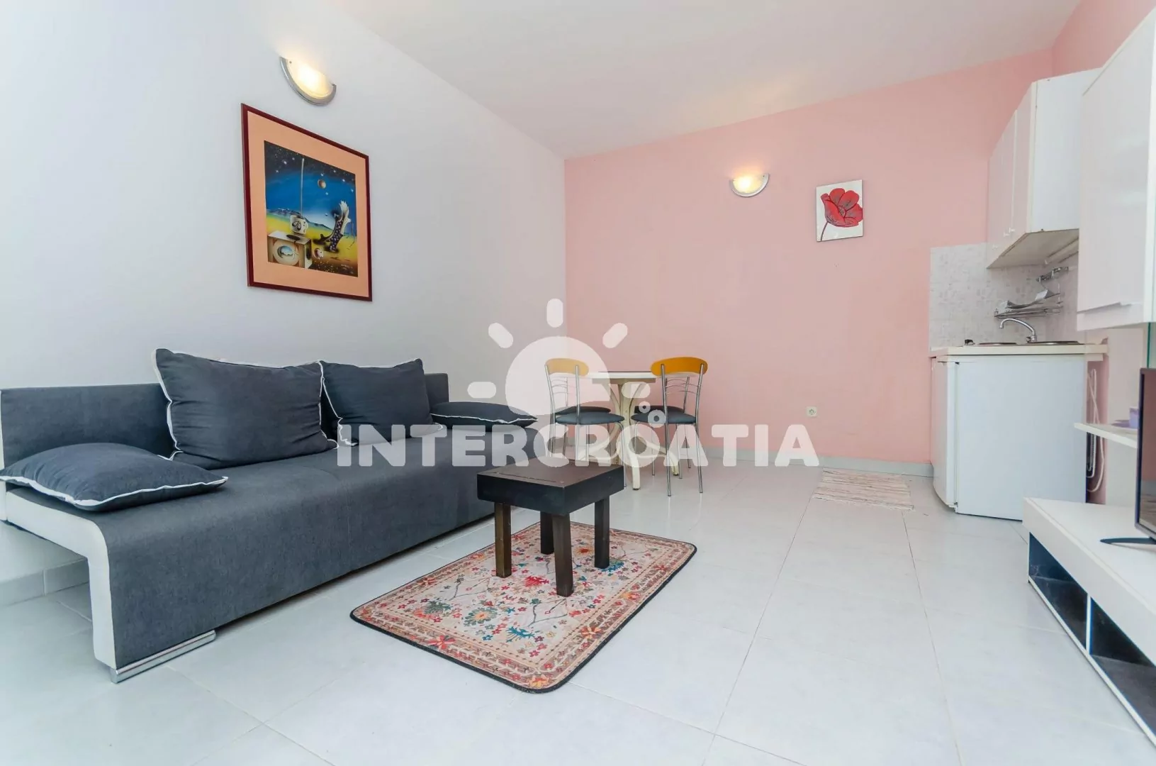 Apartmán (35 m2) s balkonem a posezením se nachází v 1. patře domu. Apartmán má 1 ložnici a je vhodný pro 2 až 3 osoby. Obývací pokoj je spojený s kuchyní. Kuchyňská linka je vybavena dvouplotýnkovým vařičem, mikrovlnnou troubou, rychlovarnou konvicí, kávovarem, nádobím a lednicí s mrazákem. Obývací pokoj s jídelním stolem pro 4 osoby, pohovkou (rozložitelná na extra lůžko pro 1 osobu), televizí se satelitním programem, klimatizací a vstupem na balkon. Ložnice s jedním dvoulůžkem. Koupelna se sprchovým koutem, umyvadlem, fénem a wc. Hostům je k dispozici parkování u objektu zdarma.