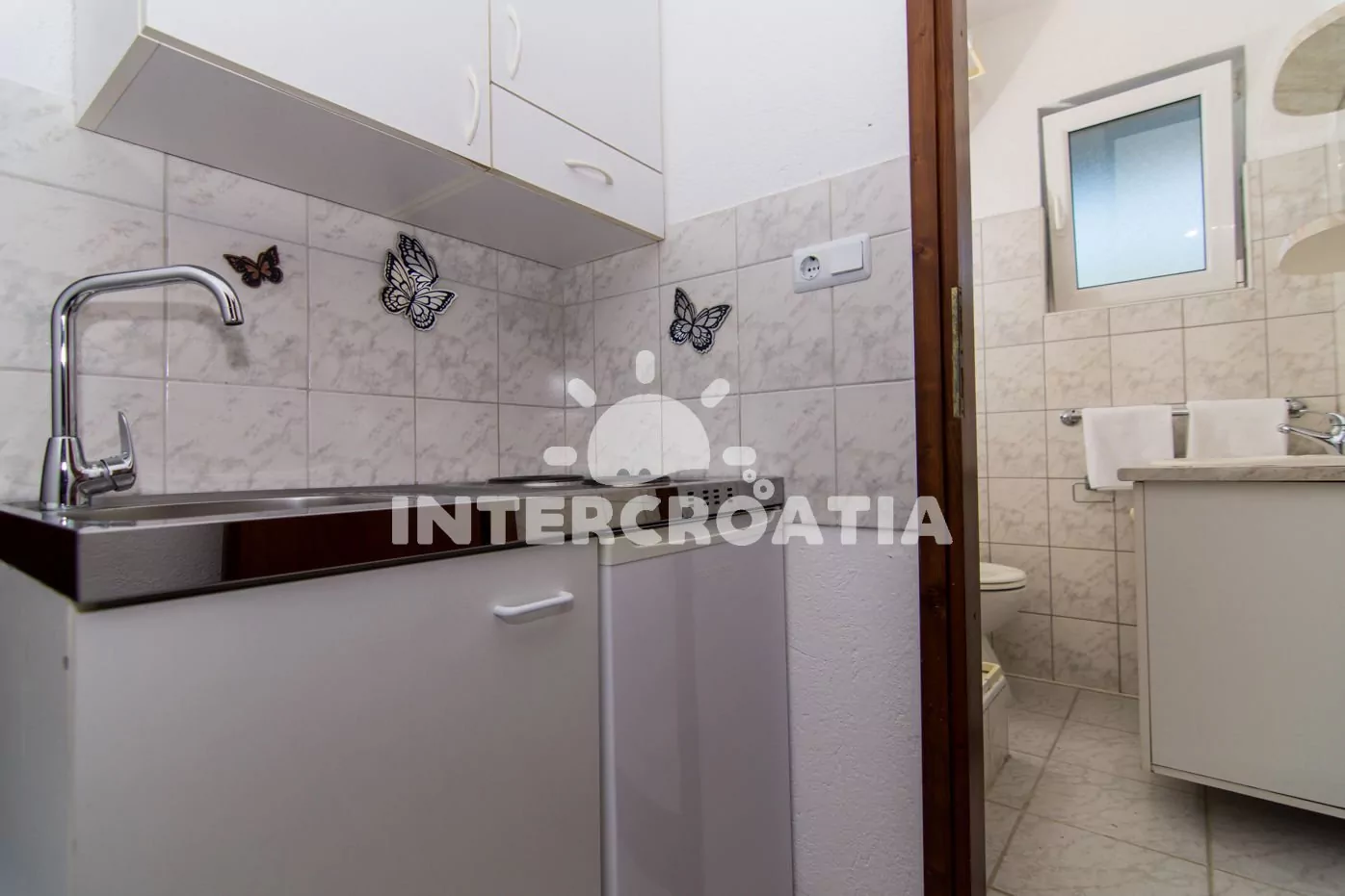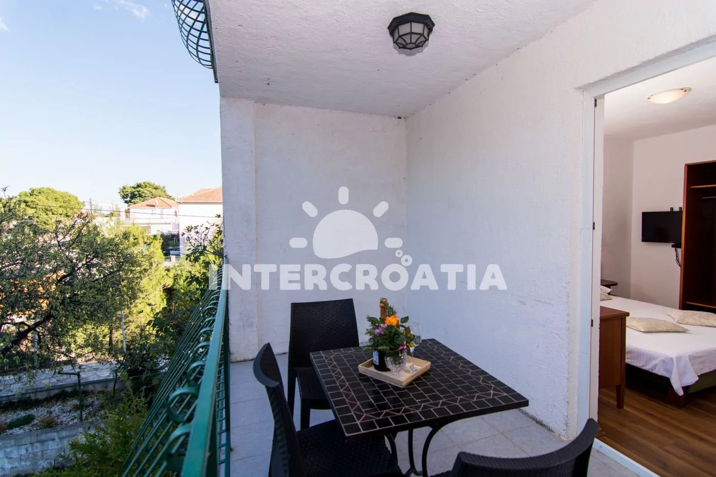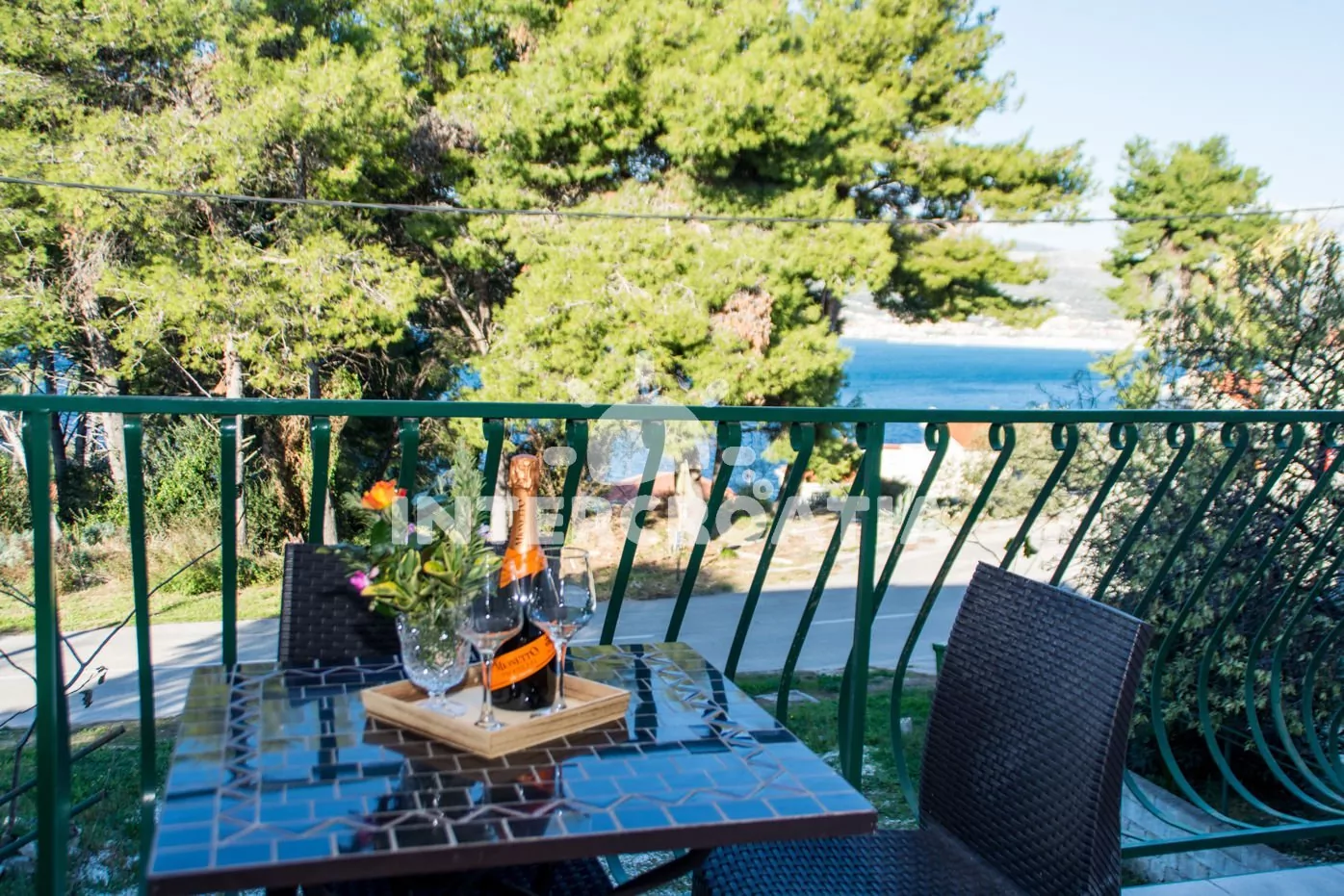 Apartmán (35 m2) s balkonem, venkovním posezením a výhledem na moře se nachází v 1. patře domu. Apartmán má 1 ložnici a je vhodný pro 2 až 3 osoby. Obývací místnost je spojena s kuchyní. Kuchyňská linka je vybavena dvouplotýnkovým vařičem, rychlovarnou konvicí, kávovarem, nádobím a lednicí s mrazákem. Obývací místnost s pohovkou (rozložitelná na extra lůžko pro 1 osobu). Ložnice s dvoulůžkem, televizí se satelitním programem, klimatizací a vstupem na balkon. Koupelna se sprchovým koutem, umyvadlem a wc. Hostům je k dispozici parkování u objektu zdarma.