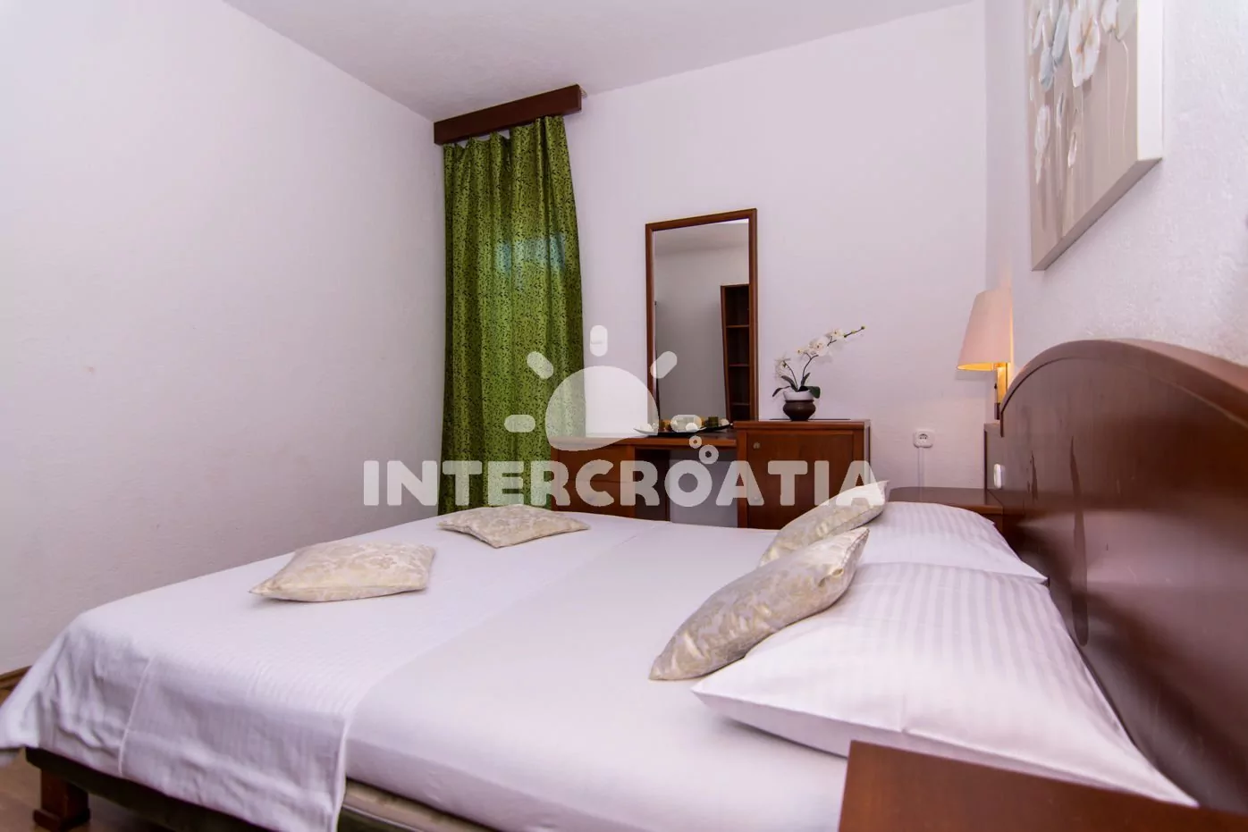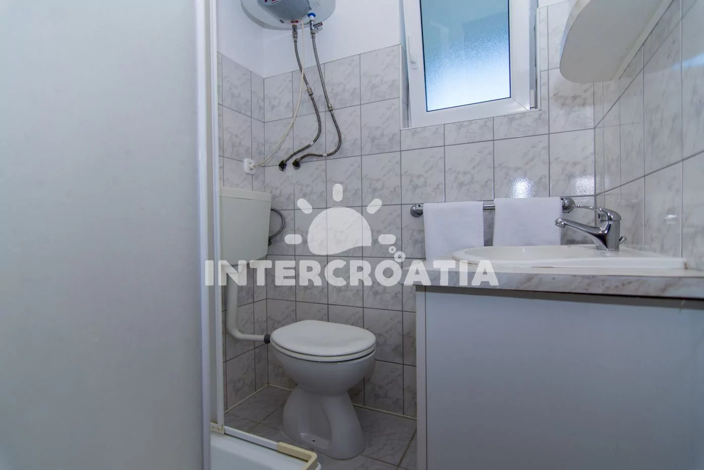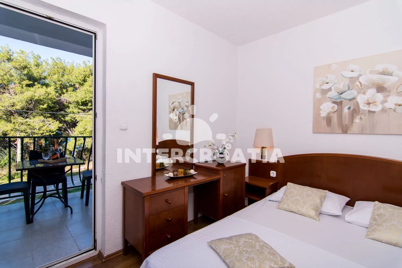 Apartmán (35 m2) s balkonem, venkovním posezením a výhledem na moře se nachází v 1. patře domu. Apartmán má 1 ložnici a je vhodný pro 2 až 3 osoby. Obývací místnost je spojena s kuchyní. Kuchyňská linka je vybavena dvouplotýnkovým vařičem, rychlovarnou konvicí, kávovarem, nádobím a lednicí s mrazákem. Obývací místnost s pohovkou (rozložitelná na extra lůžko pro 1 osobu). Ložnice s dvoulůžkem, televizí se satelitním programem, klimatizací a vstupem na balkon. Koupelna se sprchovým koutem, umyvadlem a wc. Hostům je k dispozici parkování u objektu zdarma.
