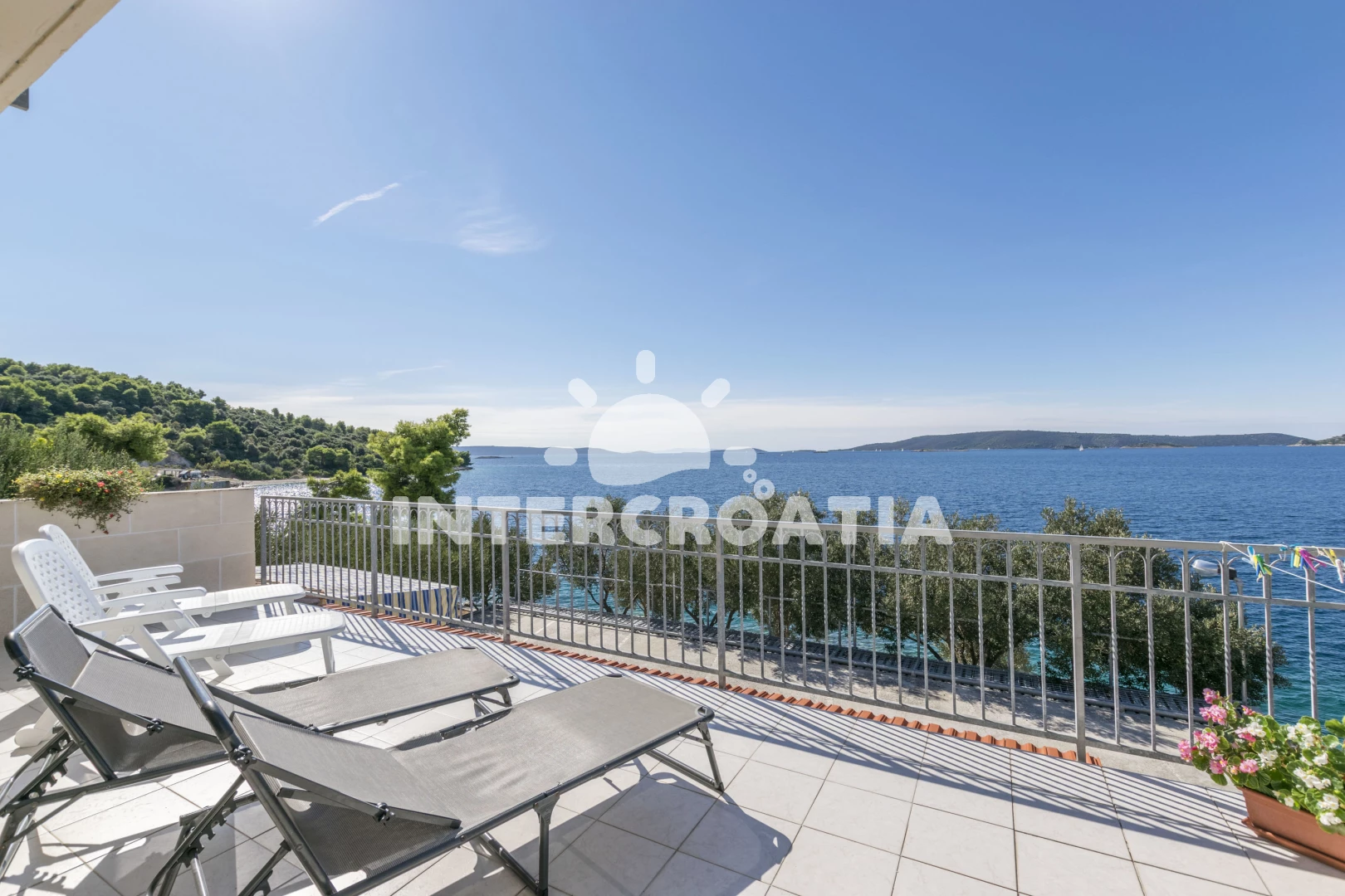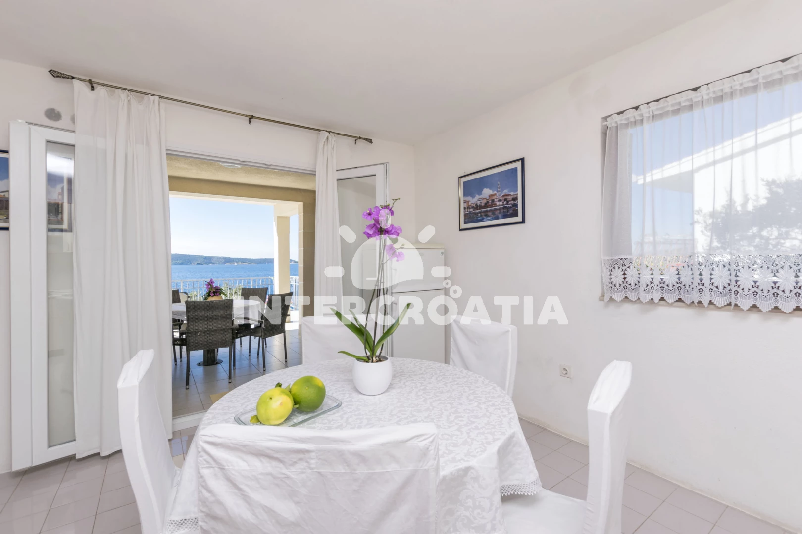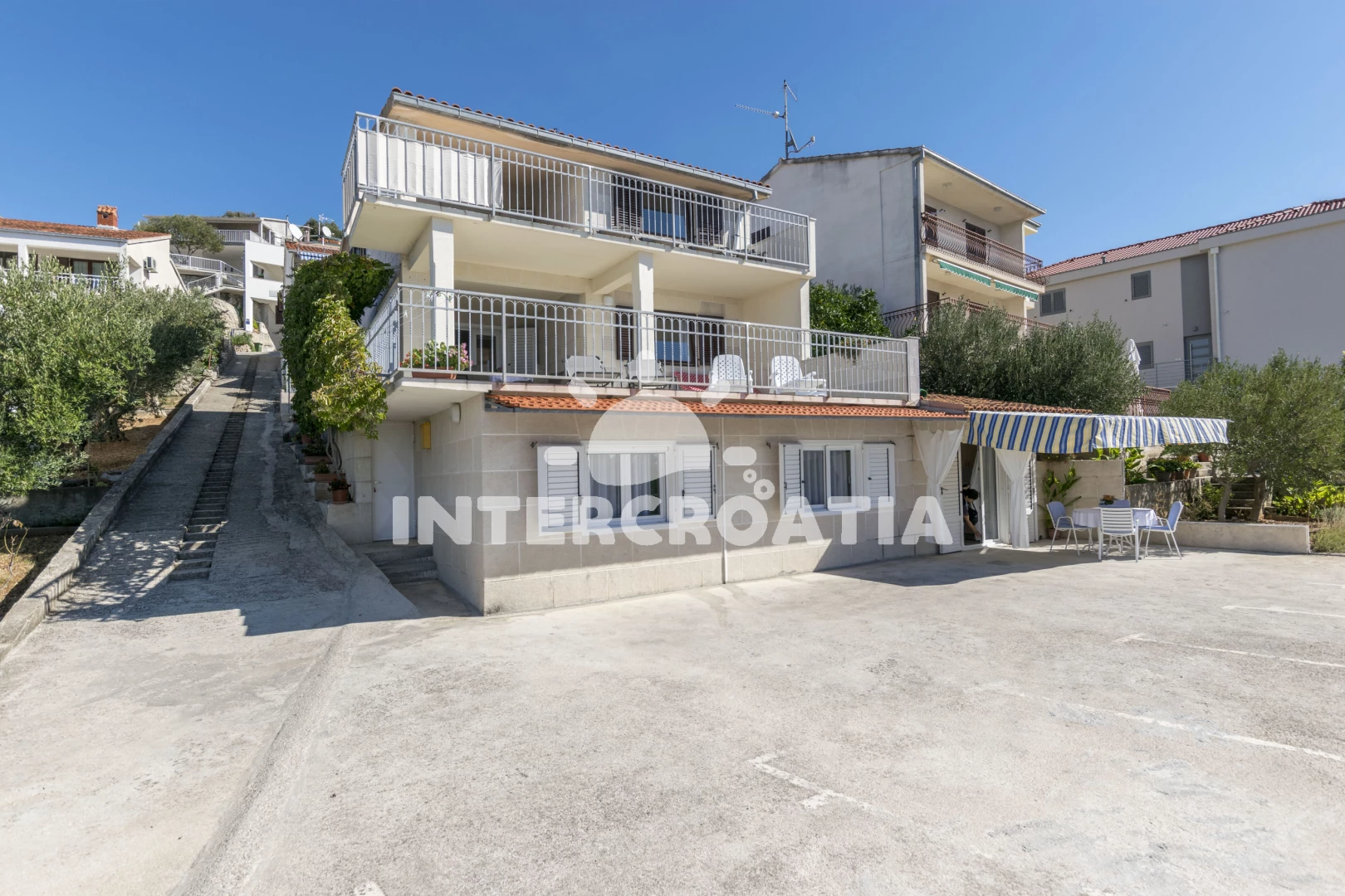 Vzdálenosti: Moře 10 m, pláž 10 m (betonové desky), restaurace 500 m, bar 500 m, supermarket 500 m, ambulance 3 km, lékárna 3 km, pošta 3 km, směnárna 3 km, centrum 7 km, banka 7 km, čerpací stanice 7 km, muzeum 7 km, letiště (Split) 10 km, trajekt (Split) 35 km,