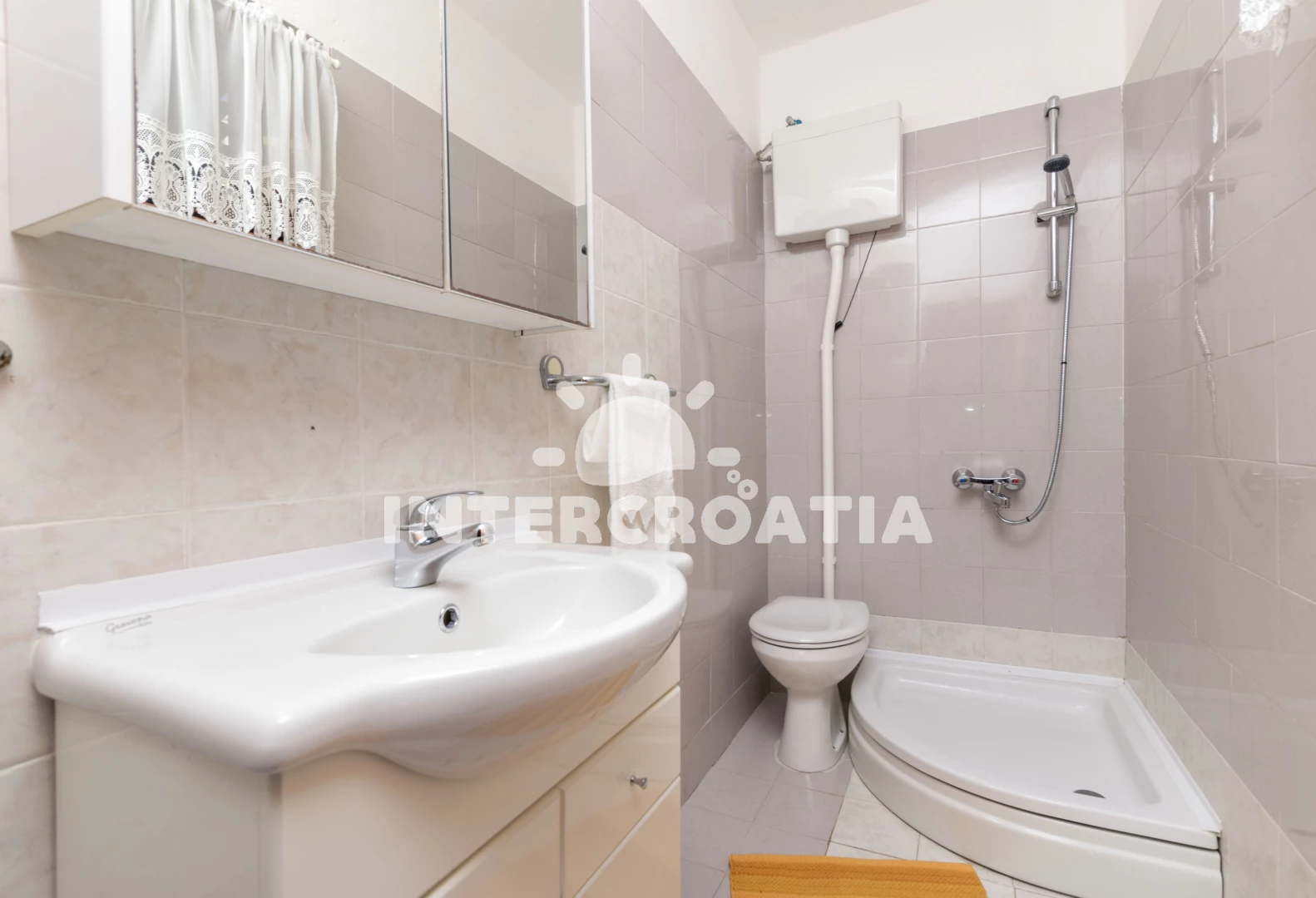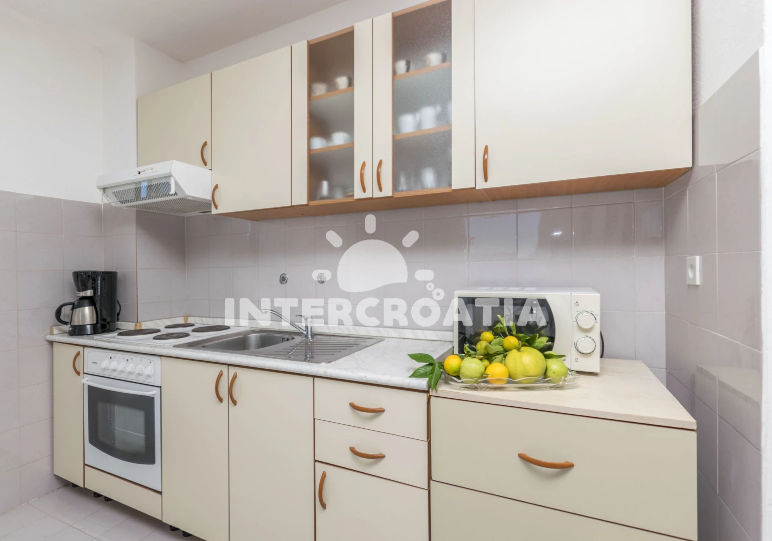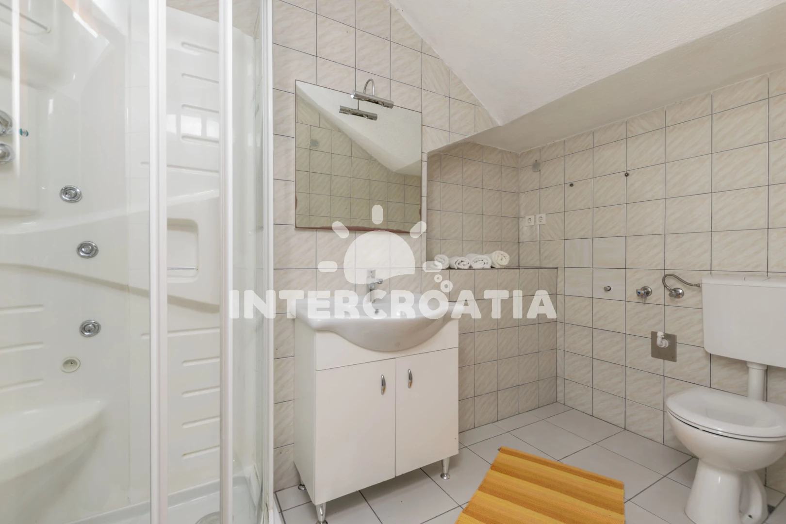 Vzdálenosti: Moře 10 m, pláž 10 m (betonové desky), restaurace 500 m, bar 500 m, supermarket 500 m, ambulance 3 km, lékárna 3 km, pošta 3 km, směnárna 3 km, centrum 7 km, banka 7 km, čerpací stanice 7 km, muzeum 7 km, letiště (Split) 10 km, trajekt (Split) 35 km,