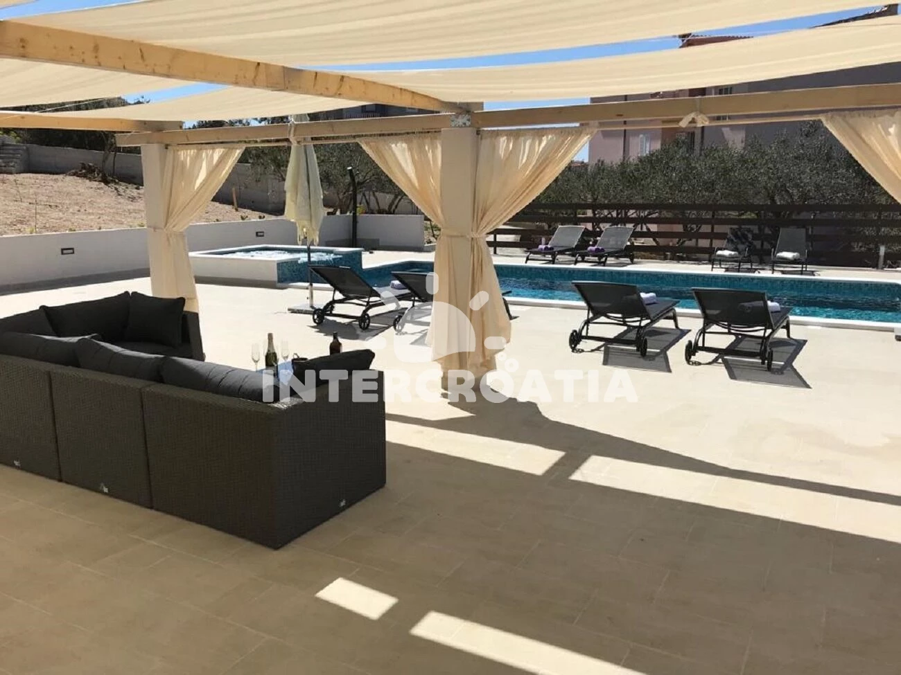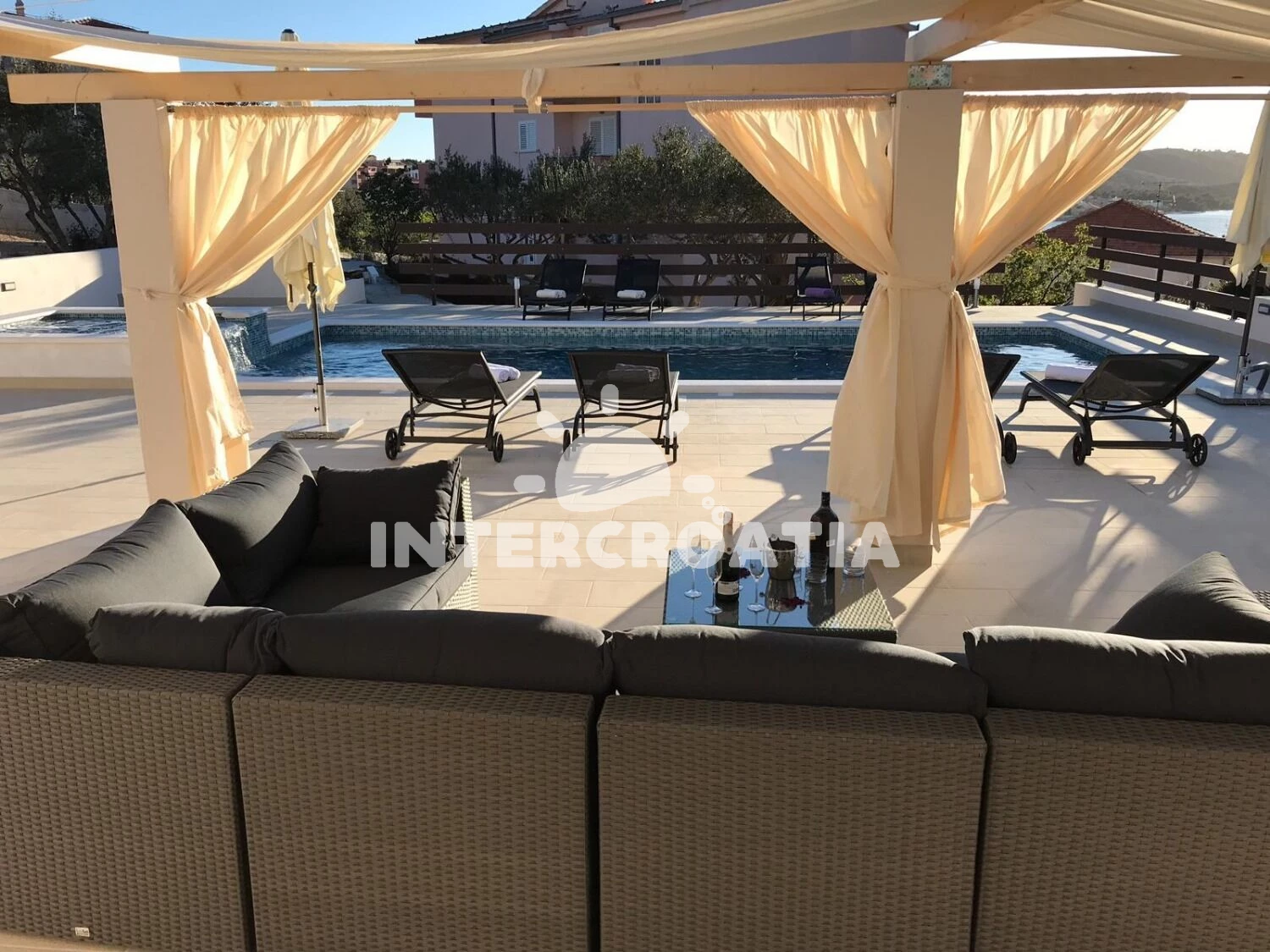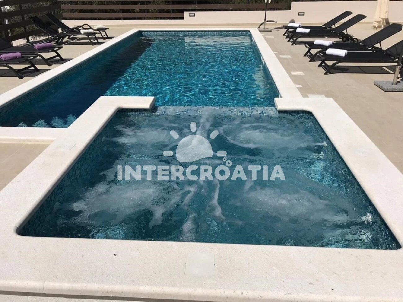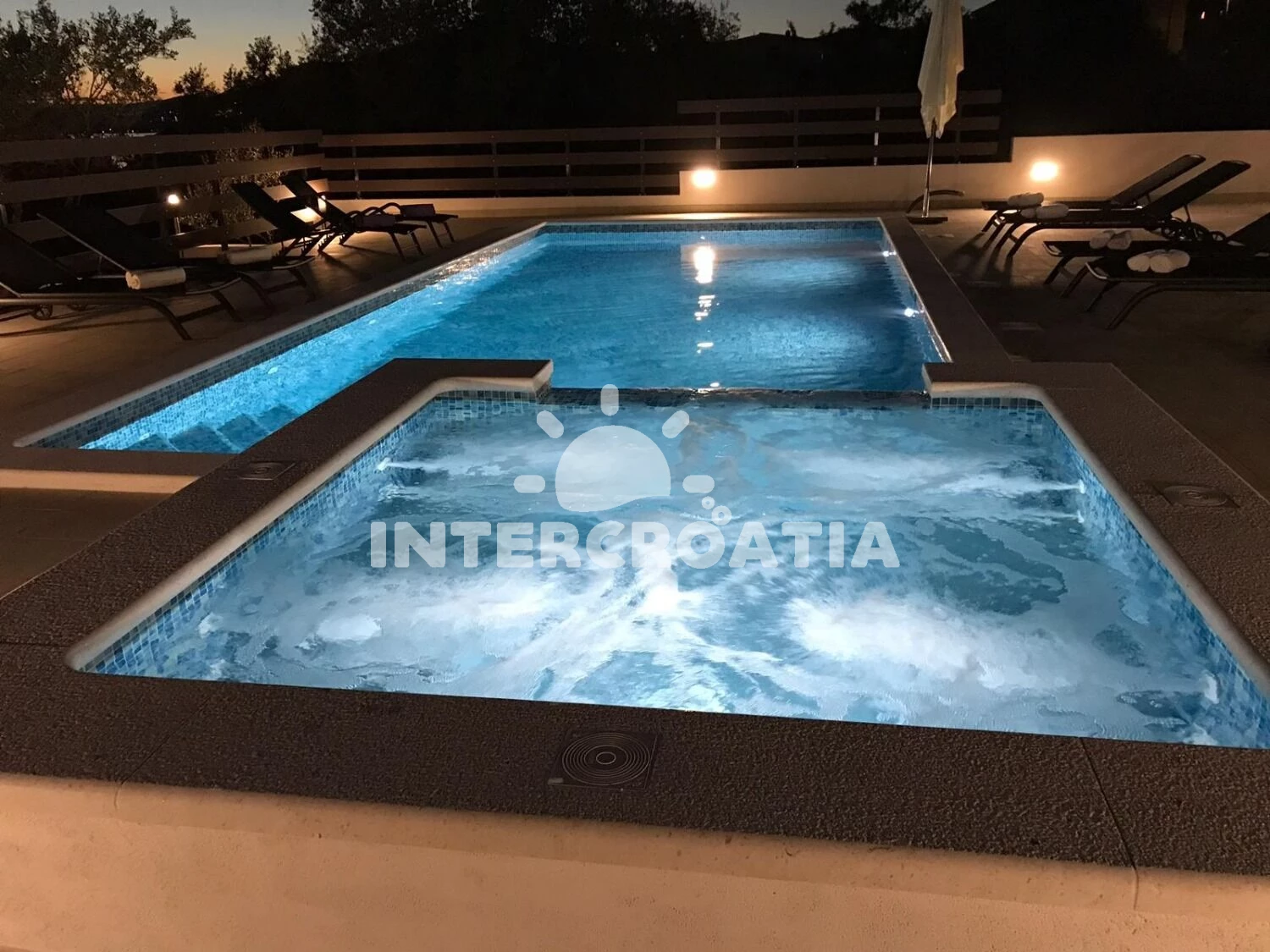Apartmán se nachází 200 m od moře a pláže. Pláž je oblázková a betonové desky. Apartmán disponuje bazénem s lehátky pro ubytované hosty. U objektu je k dispozici společná zahrada s posezením a grilem.