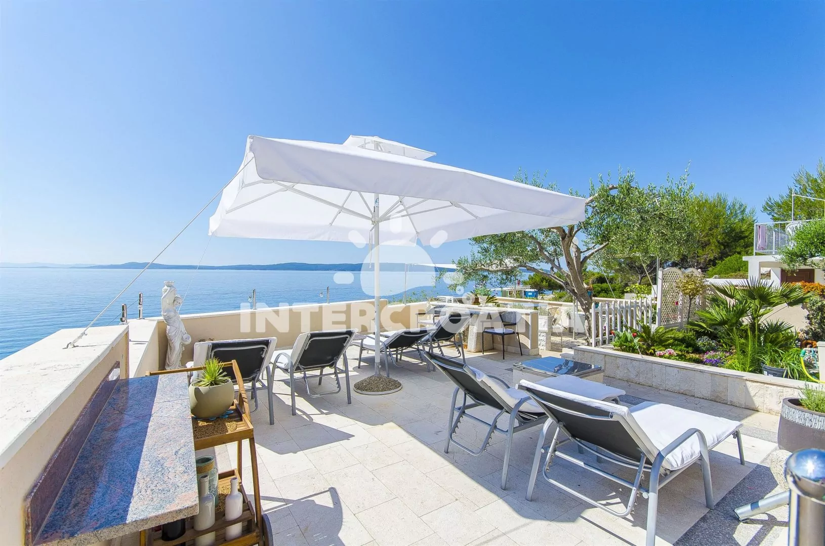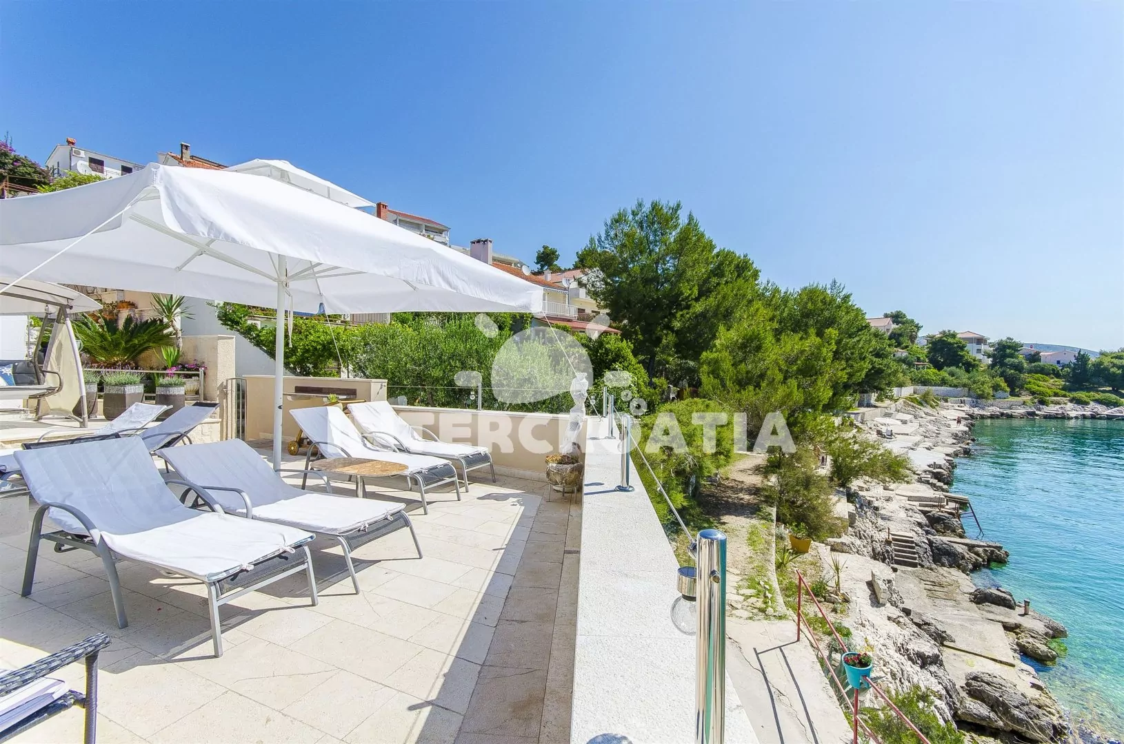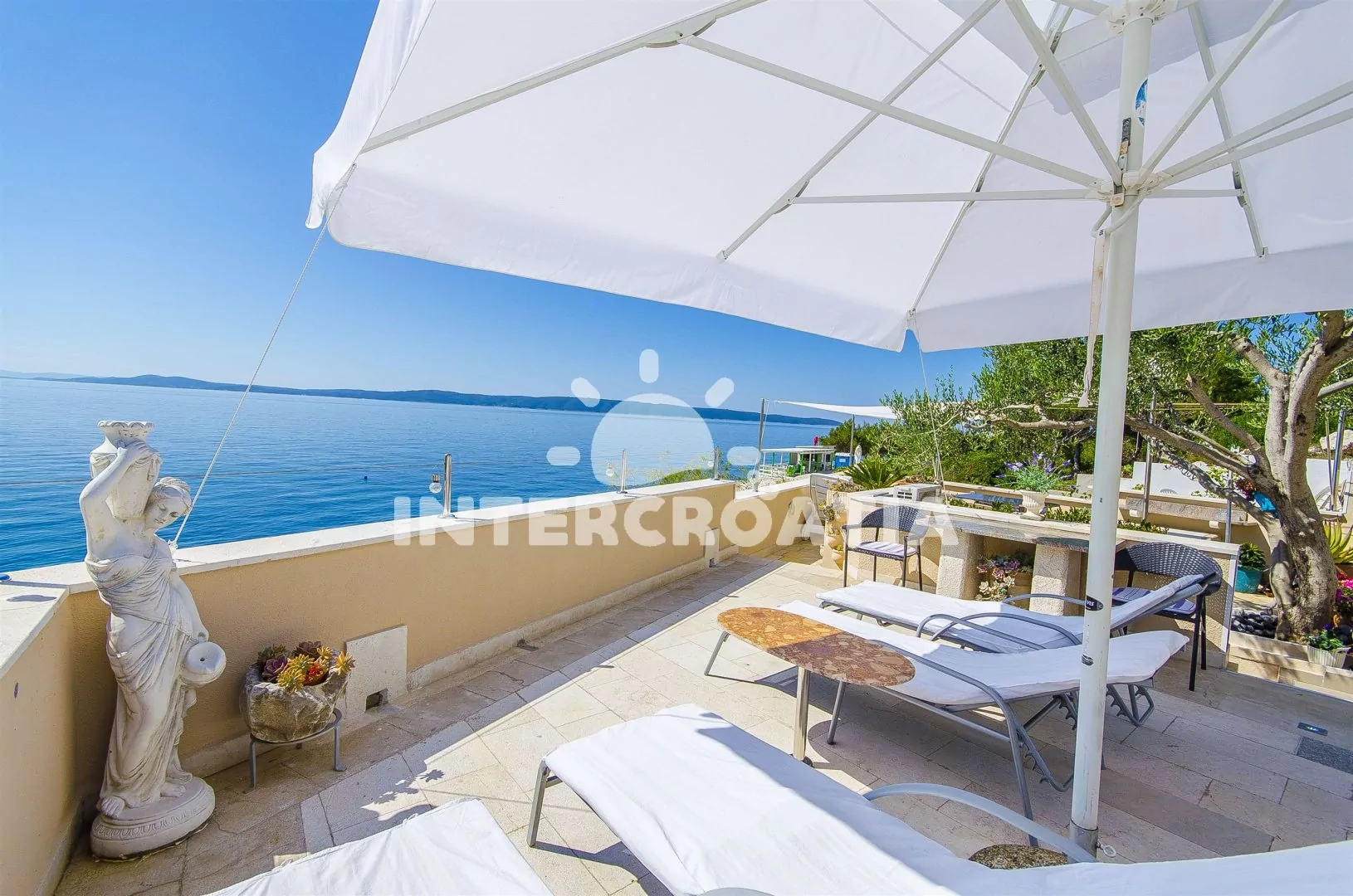 Apartmán téměř u moře se sea-view terasou s lehátky.