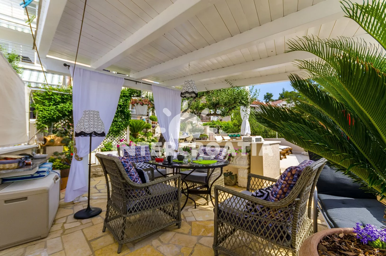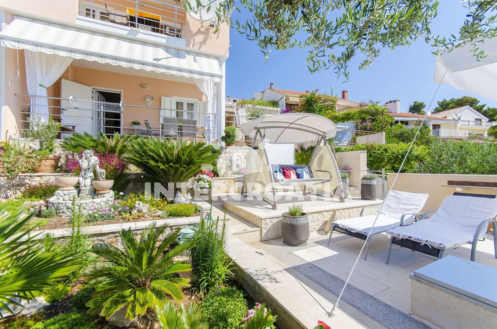 Dvoupodlažní apartmánová vila v zahradě s terasou, společnou sea-view terasou s lehátky a polohou téměř na pláži.