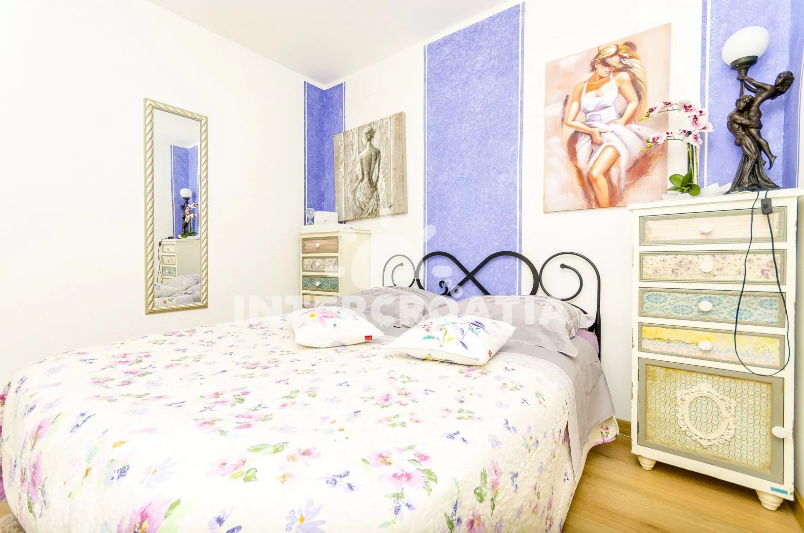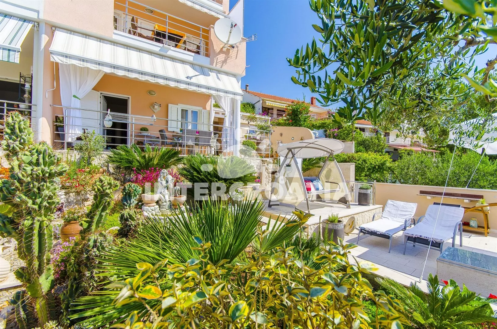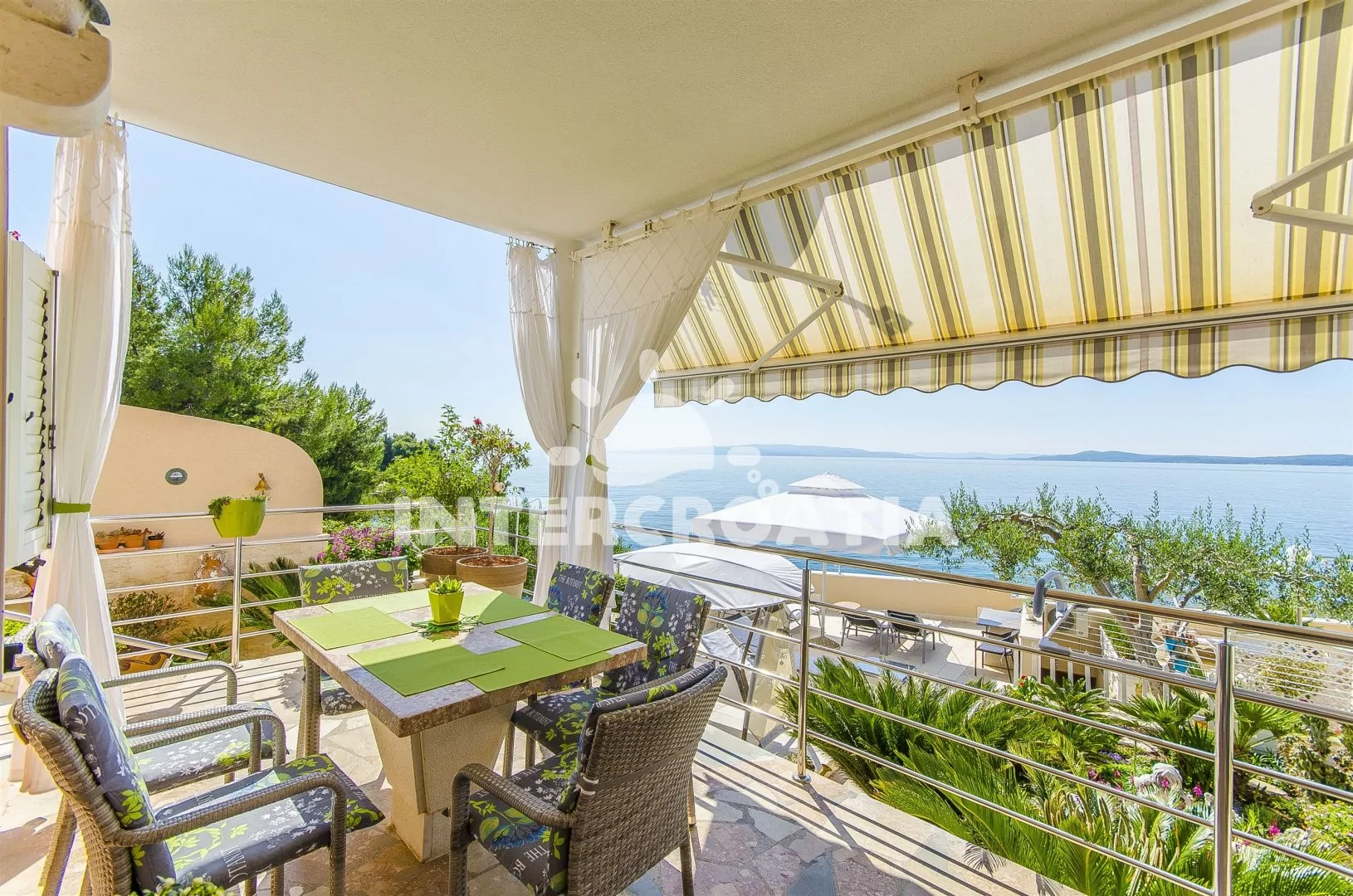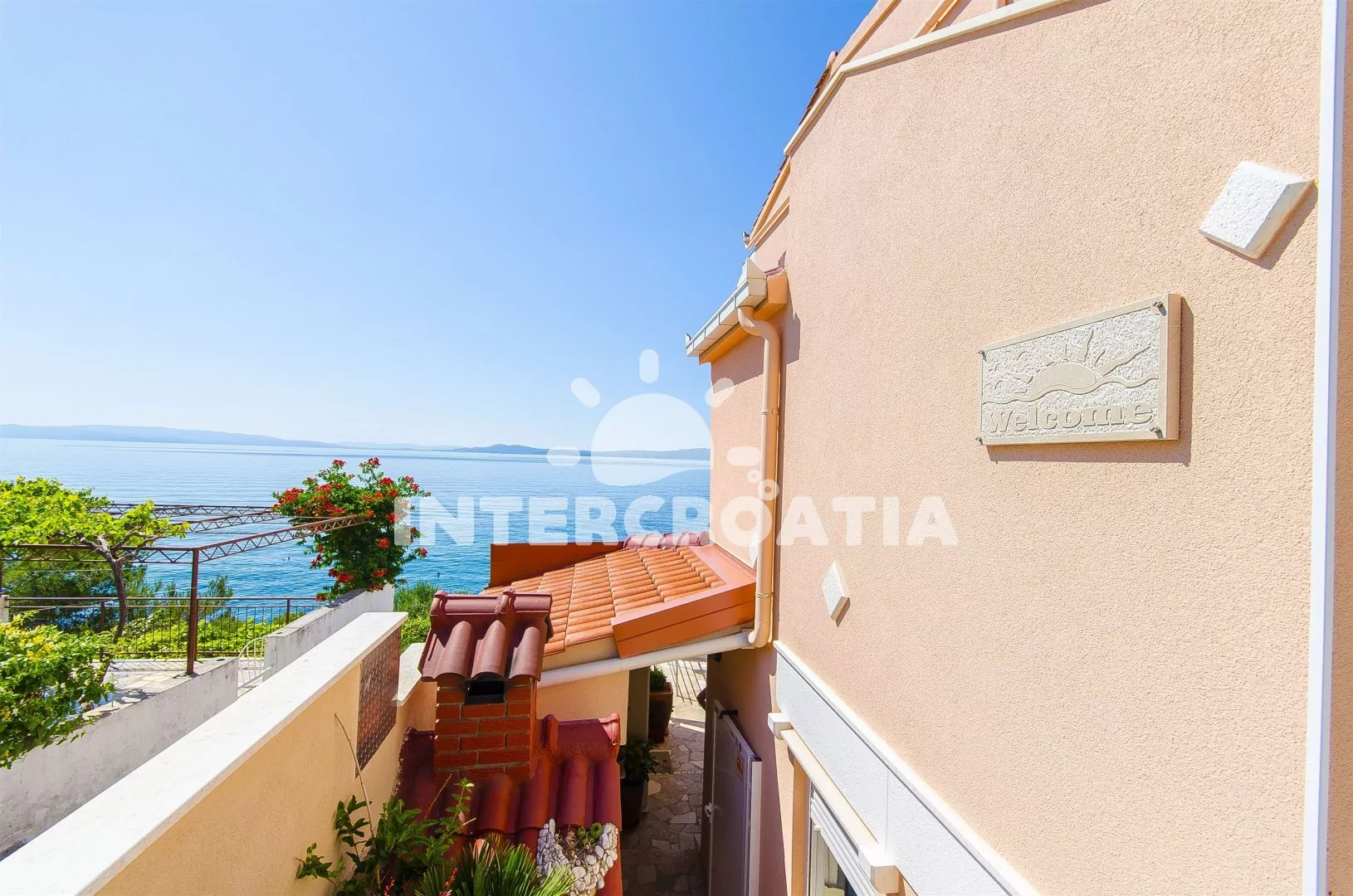Luxusní třípokojový apartmán s terasou s posezením a výhledem na moře, nacházející se ve zvýšeném přízemí. Vstup, obývací místnost spojená s kuchyní. Kuchyňská linka s dvouplotýnkovou keramickou deskou, troubou, mikrovlnnou troubou, lednicí s mrazákem, kávovarem, toustovačem, rychlovarnou konvicí, nádobím a myčkou na nádobí. V obývacím pokoji jídelní stůl pro 4 osoby, pohovka (rozložitelná na extra lůžko pro 2 osoby) a LCD televize se satelitem. Ložnice s dvoulůžkem. Koupelna s vanou, umyvadlem, wc a vysoušečem vlasů. Druhé samostatné wc. Druhá ložnice s dvoulůžkem a třetí samostatné wc mají vlastní vchod oddělený od apartmánu. Hosté mají k dispozici terasu s posezením a v zahradě společnou terasu s lehátky a výhledem na moře. Parkování u objektu.