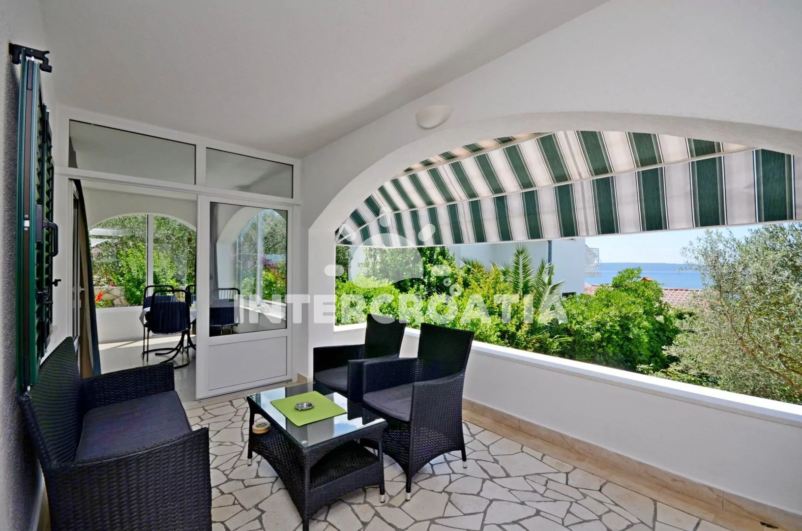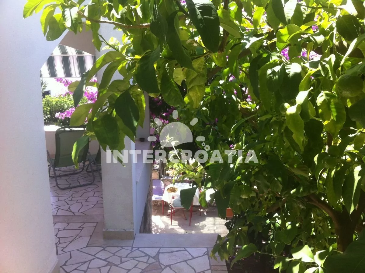 Apartmán (42 m2) s vlastní terasou, výhledem na moře se nachází v přízemí domu a je vhodný pro 4 osoby. Obývací pokoj je spojený kuchyní. Kuchyňská linka je vybavena sklokeramickou varnou deskou, digestoří, troubou, kávovarem, mikrovlnnou troubou, rychlovarnou konvicí, nádobím a lednicí s mrazákem. Obývací pokoj s jídelním stolem pro 4 osoby, pohovkou, televizí se satelitním programem, klimatizací a vstupem na terasu. První ložnice s dvěma jednolůžky. Druhá ložnice s jedním dvoulůžkem. Koupelna se sprchovým koutem, umyvadlem a wc. Hostům je k dispozici parkování u objektu zdarma.