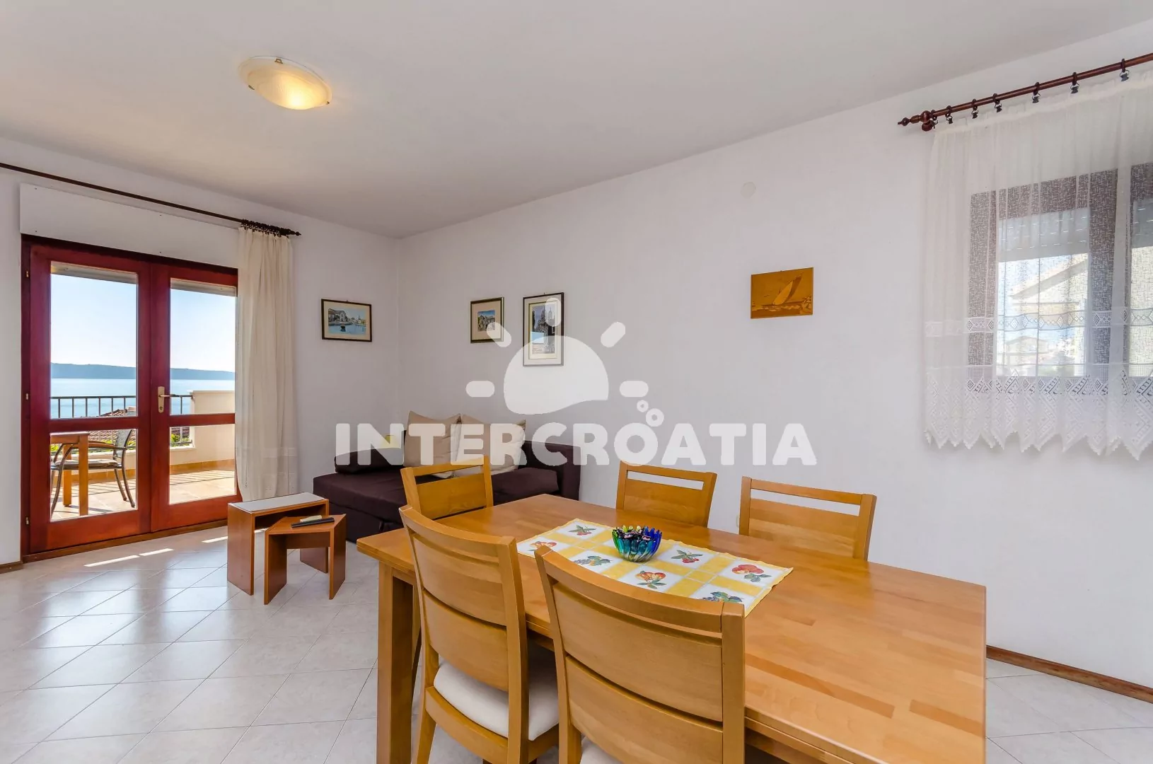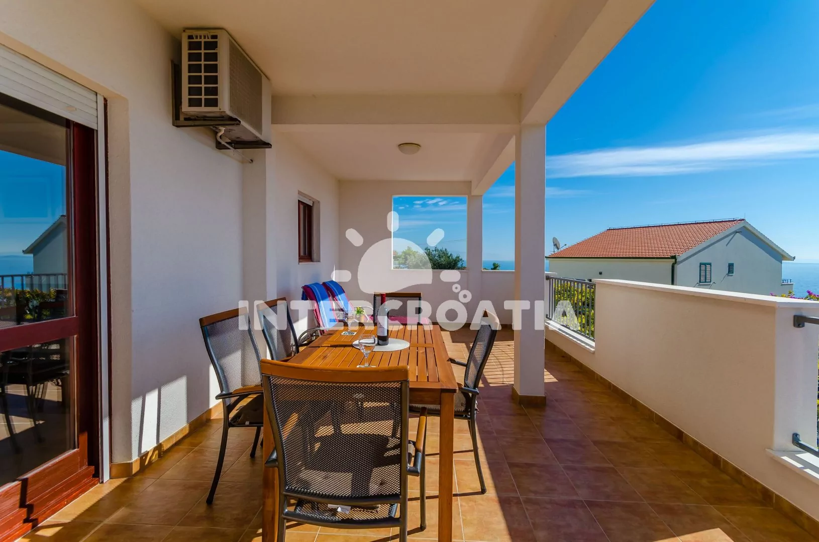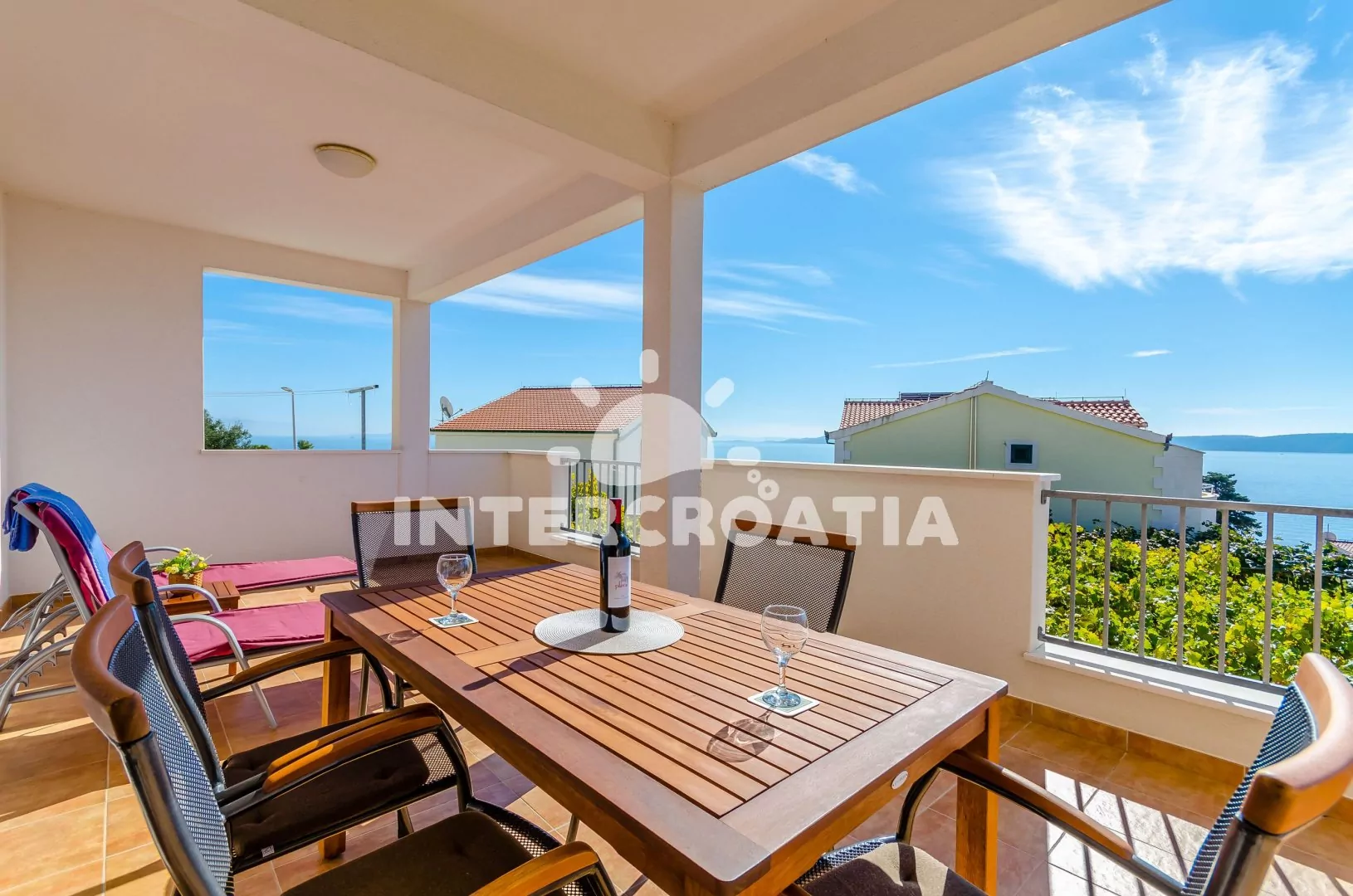 Apartmán (90 m2) s vlastní terasou a výhledem na moře se nachází v 1. patře domu a je vhodný pro 5 osob. Obývací pokoj je spojený s kuchyní. Kuchyňská linka je vybavena varnou deskou, digestoří, troubou, rychlovarnou konvicí, kávovarem, nádobím a lednicí s mrazákem. Obývací pokoj s jídelním stolem pro 6 osob, pohovkou, televizí se satelitním programem, klimatizací a vstupem na terasu. První a druhá ložnice je vybavena vždy s jedním dvoulůžkem. Třetí ložnice s jedním jednolůžkem. Koupelna se sprchovým koutem, umyvadlem, pračkou, bidetem a wc. Dále samostatné wc. Hostům je k dispozici parkování u objektu zdarma.