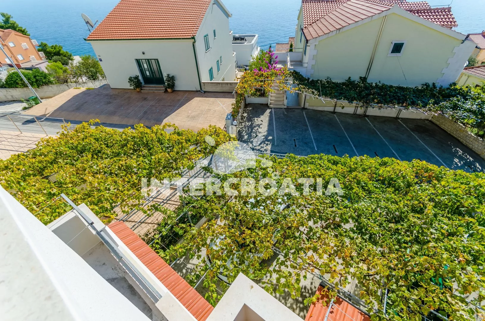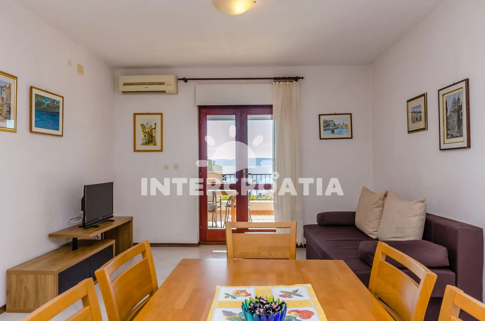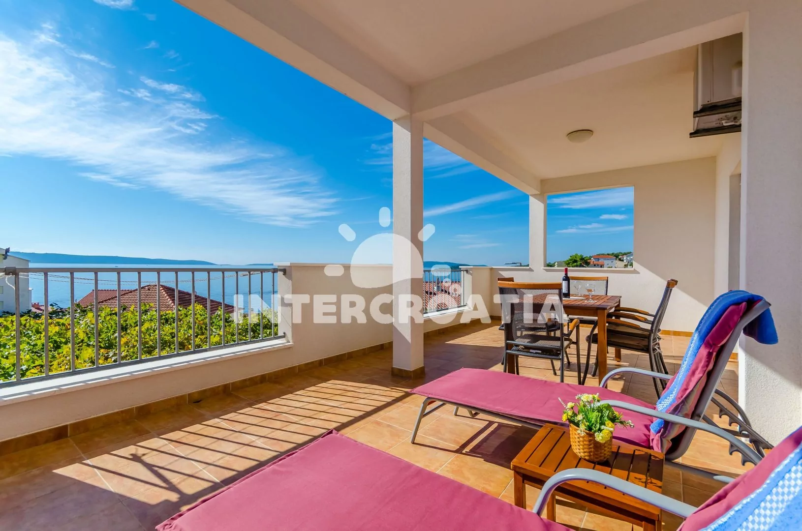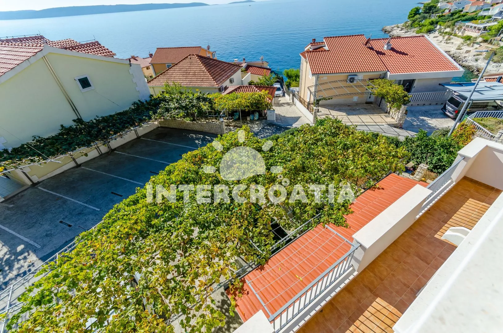 Apartmán (90 m2) s vlastní terasou a výhledem na moře se nachází v 1. patře domu a je vhodný pro 5 osob. Obývací pokoj je spojený s kuchyní. Kuchyňská linka je vybavena varnou deskou, digestoří, troubou, rychlovarnou konvicí, kávovarem, nádobím a lednicí s mrazákem. Obývací pokoj s jídelním stolem pro 6 osob, pohovkou, televizí se satelitním programem, klimatizací a vstupem na terasu. První a druhá ložnice je vybavena vždy s jedním dvoulůžkem. Třetí ložnice s jedním jednolůžkem. Koupelna se sprchovým koutem, umyvadlem, pračkou, bidetem a wc. Dále samostatné wc. Hostům je k dispozici parkování u objektu zdarma.