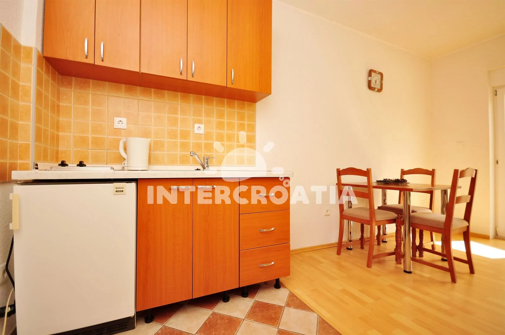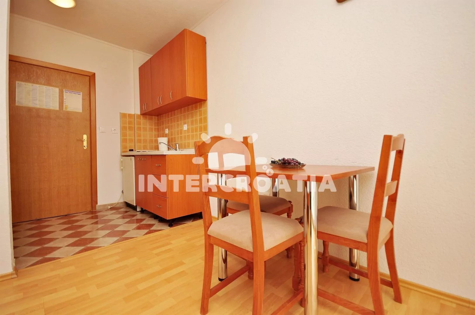 Apartmán (23 m2) typu studio s terasou a venkovním posezením se nachází v přízemí domu. Obývací místnost je spojena s kuchyní. Kuchyňská linka je vybavena dvouplotýnkovým vařičem, rychlovarnou konvicí, nádobím a lednicí s mrazákem. Obývací místnost s jídelním stolem pro 3 osoby, jedním dvoulůžkem, klimatizací a vstupem na terasu. Koupelna se sprchovým koutem, umyvadlem, fénem a wc. Hostům je k dispozici parkování u objektu zdarma.