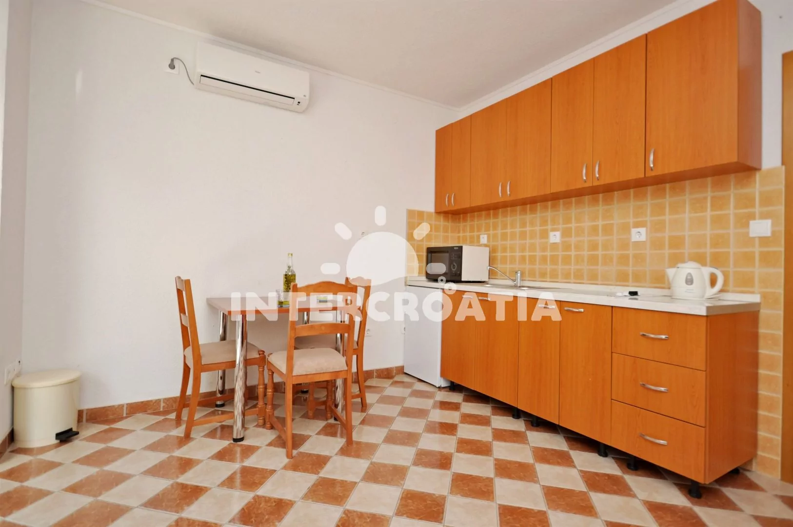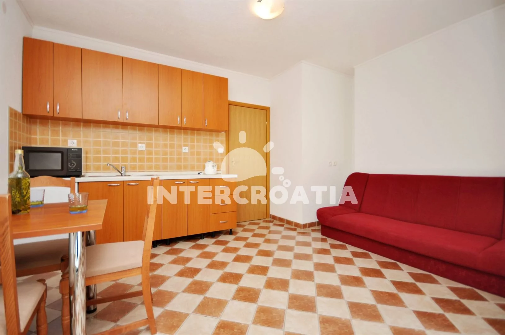 Apartmán (45 m2) s terasou a venkovním posezením se nachází v přízemí domu. Apartmán je vhodný pro 2 až 4 osoby. Obývací pokoj je spojený s kuchyní. Kuchyňská linka je vybavena dvouplotýnkovým vařičem, mikrovlnnou troubou, rychlovarnou konvicí, nádobím a lednicí s mrazákem. Obývací pokoj s jídelním stolem pro 3 osoby, pohovkou (rozložitelná na extra lůžko pro 2 osoby), klimatizací a vstupem na terasu. Ložnice s jedním dvoulůžkem. Koupelna se sprchovým koutem, umyvadlem, fénem a wc. Hostům je k dispozici parkování u objektu zdarma.