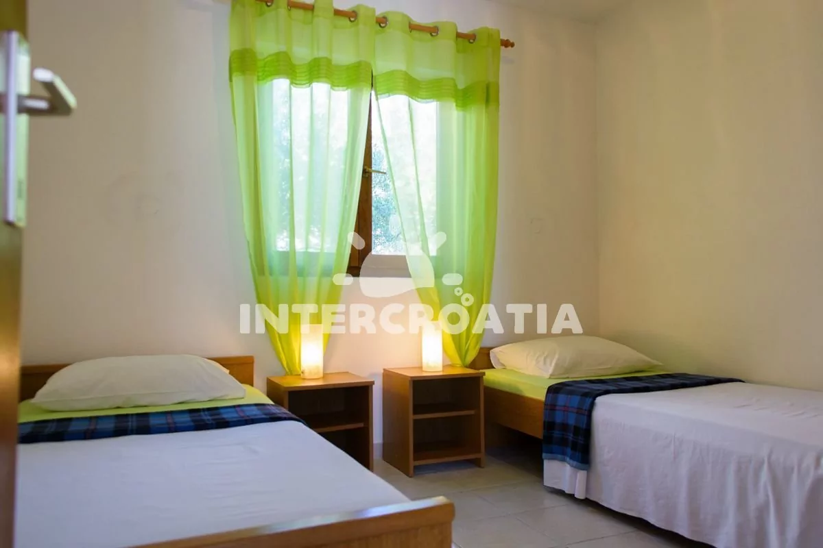 Apartmán (42 m2) s balkonem a venkovním posezením se nachází v přízemí vily. Apartmán má dvě ložnice a je vhodný pro 4 až 5 osob. Obývací pokoj je spojený s kuchyní. Kuchyňská linka je vybavena dvouplotýnkovým vařičem, mikrovlnnou troubou, rychlovarnou konvicí, kávovarem, toustovačem, nádobím a lednicí s mrazákem. Obývací pokoj s jídelním stolem pro 4 osoby, pohovkou (rozložitelná na extra lůžko pro 1 osobu), televizí se satelitním programem, klimatizací a vstupem na balkon. První ložnice s dvoulůžkem. Druhá ložnice s dvěma jednolůžky. Koupelna se sprchovým koutem, umyvadlem, pračkou, fénem a wc. Hostům je k dispozici parkování u objektu zdarma.