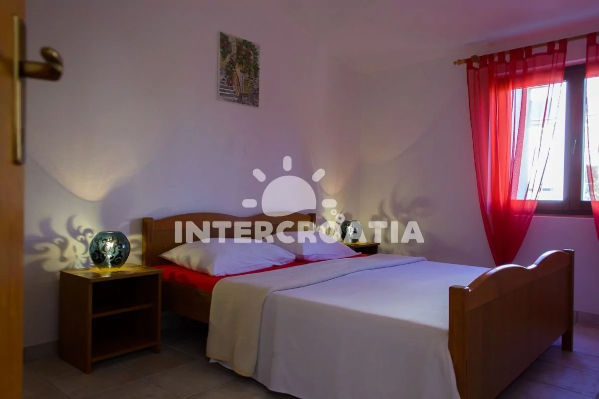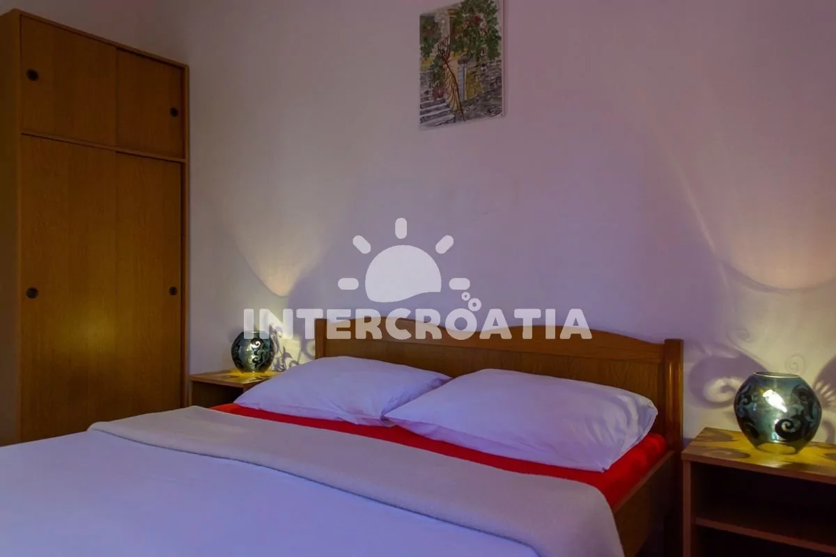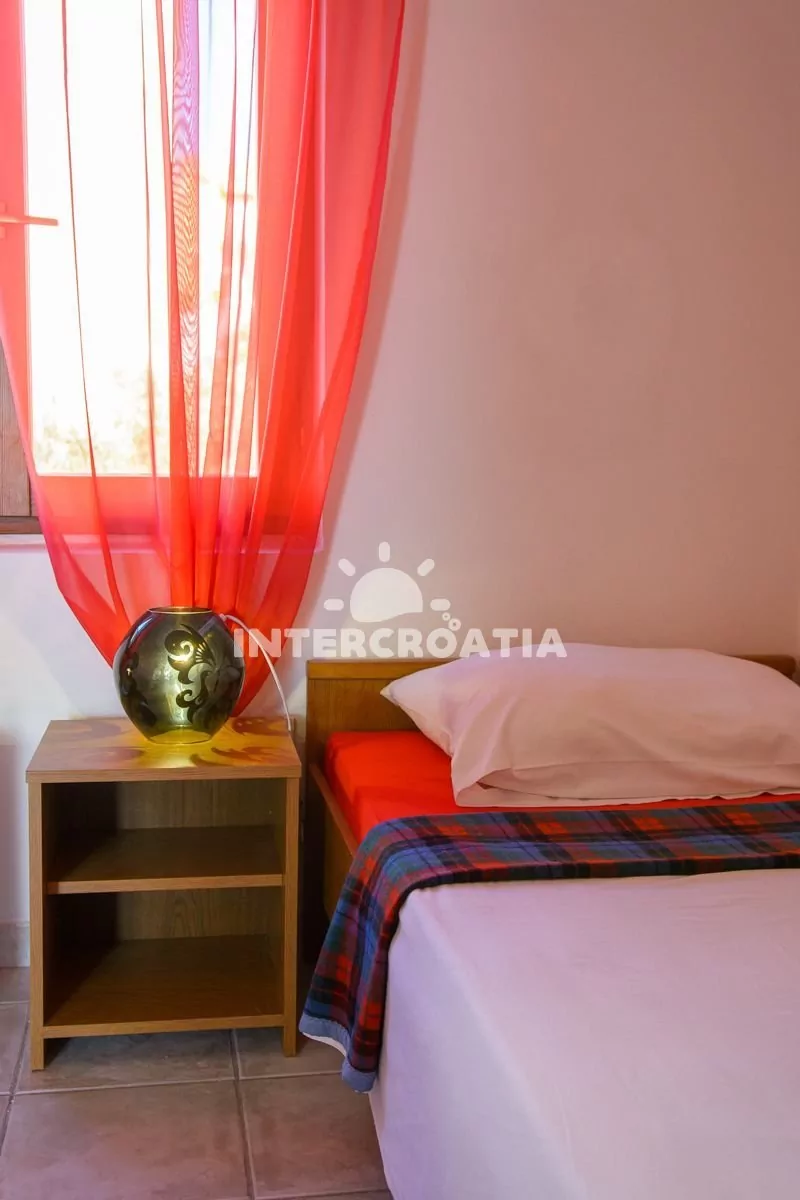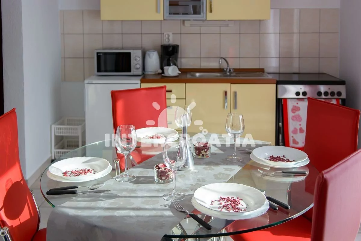 Apartmán (42 m2) s balkonem, venkovním posezením a výhledem na moře se nachází v 1. patře vily. Apartmán má dvě ložnice a je vhodný pro 4 až 5 osob. Obývací pokoj je spojený s kuchyní. Kuchyňská linka je vybavena sporákem, mikrovlnnou troubou, rychlovarnou konvicí, kávovarem, toustovačem, nádobím a lednicí s mrazákem. Obývací pokoj s jídelním stolem pro 4 osoby, pohovkou (rozložitelná na extra lůžko pro 1 osobu), televizí se satelitním programem, klimatizací a vstupem na balkon. První ložnice s dvoulůžkem. Druhá ložnice s dvěma jednolůžky. Koupelna se sprchovým koutem, umyvadlem, pračkou, fénem a wc. Hostům je k dispozici parkování u objektu zdarma.