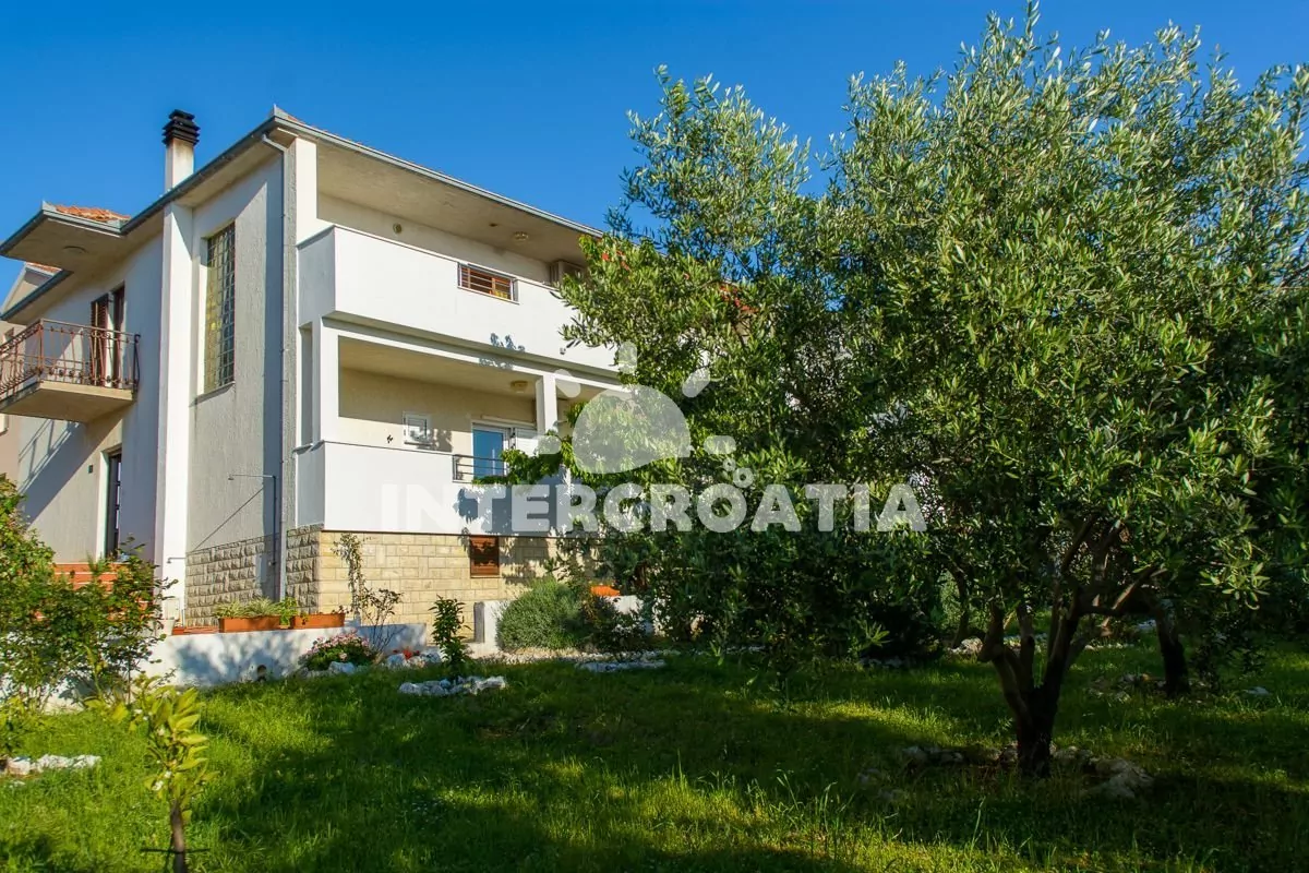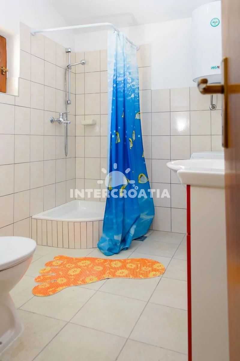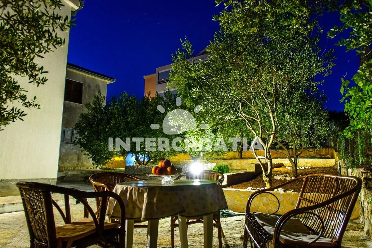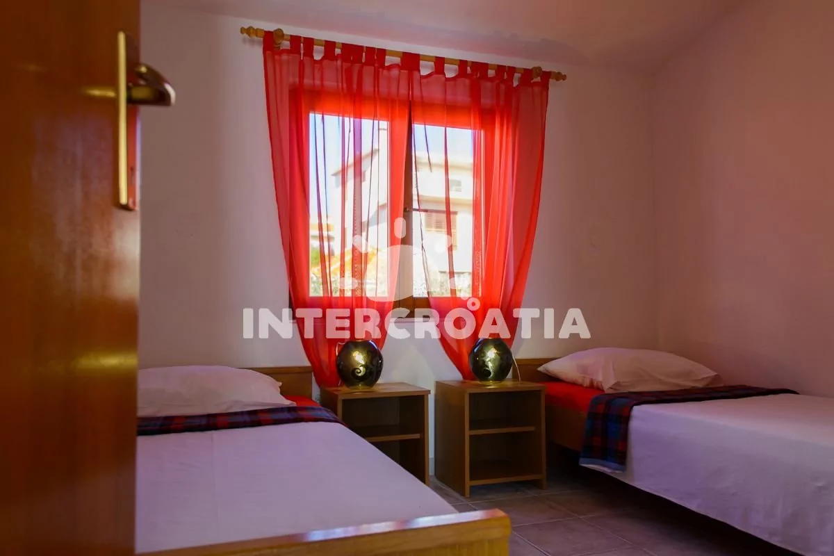Apartmán (42 m2) s balkonem, venkovním posezením a výhledem na moře se nachází v 1. patře vily. Apartmán má dvě ložnice a je vhodný pro 4 až 5 osob. Obývací pokoj je spojený s kuchyní. Kuchyňská linka je vybavena sporákem, mikrovlnnou troubou, rychlovarnou konvicí, kávovarem, toustovačem, nádobím a lednicí s mrazákem. Obývací pokoj s jídelním stolem pro 4 osoby, pohovkou (rozložitelná na extra lůžko pro 1 osobu), televizí se satelitním programem, klimatizací a vstupem na balkon. První ložnice s dvoulůžkem. Druhá ložnice s dvěma jednolůžky. Koupelna se sprchovým koutem, umyvadlem, pračkou, fénem a wc. Hostům je k dispozici parkování u objektu zdarma.