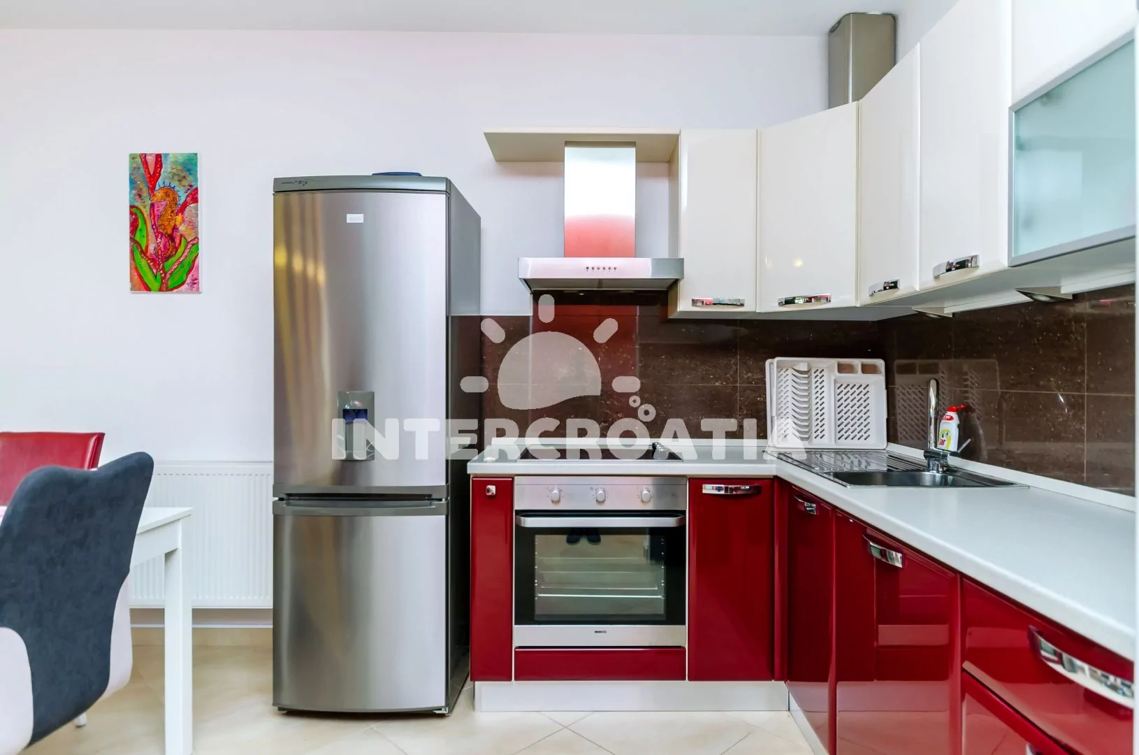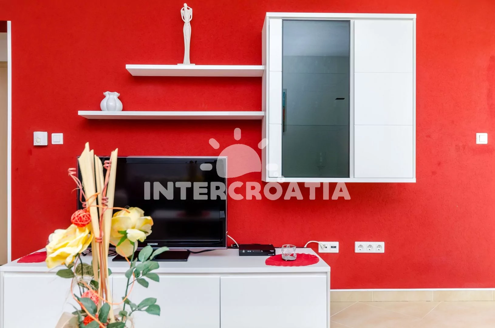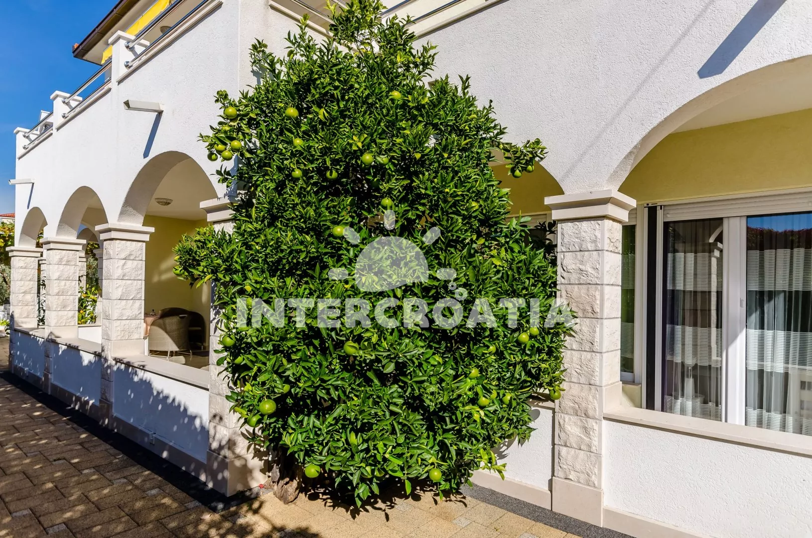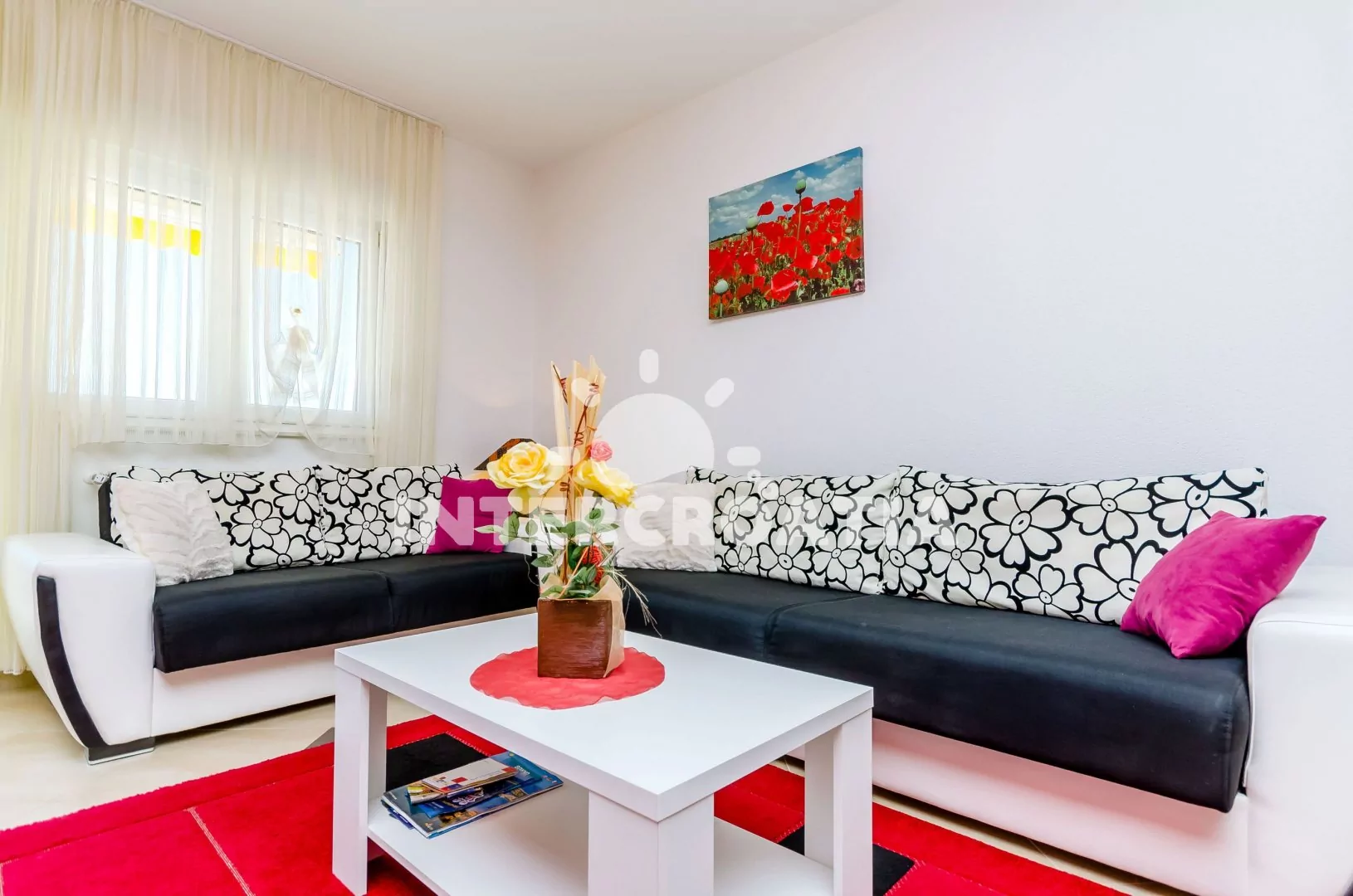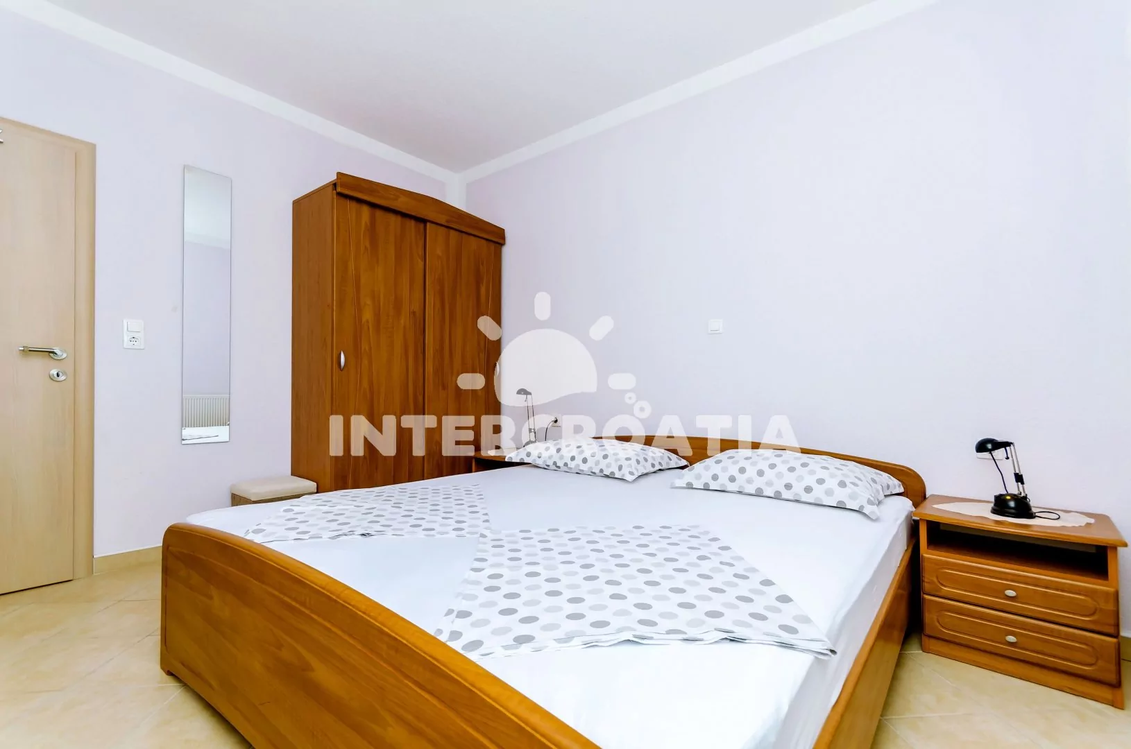 Apartmán (85 m2) s terasou a výhledem na moře se nachází v 1. patře domu. Apartmán má 2 ložnice a je vhodný pro 4 až 6 osob. Obývací pokoj je spojený s kuchyní. Kuchyňská linka je vybavena sklokeramickou varnou deskou, digestoří, vestavěnou troubou, rychlovarnou konvicí, kávovarem, toustovačem, nádobím a lednicí s mrazákem. Obývací pokoj s jídelním stolem pro 6 osob, rohovou pohovkou (rozložitelná na extra lůžko pro 2 osoby), televizí se satelitním programem, klimatizací a vstupem na terasu. První ložnice s dvoulůžkem a vstupem na terasu. Druhá ložnice s dvoulůžkem. Koupelna se sprchovým koutem, umyvadlem a wc. Dále samostatné wc s umyvadlem. Hostům je k dispozici parkování u objektu zdarma.