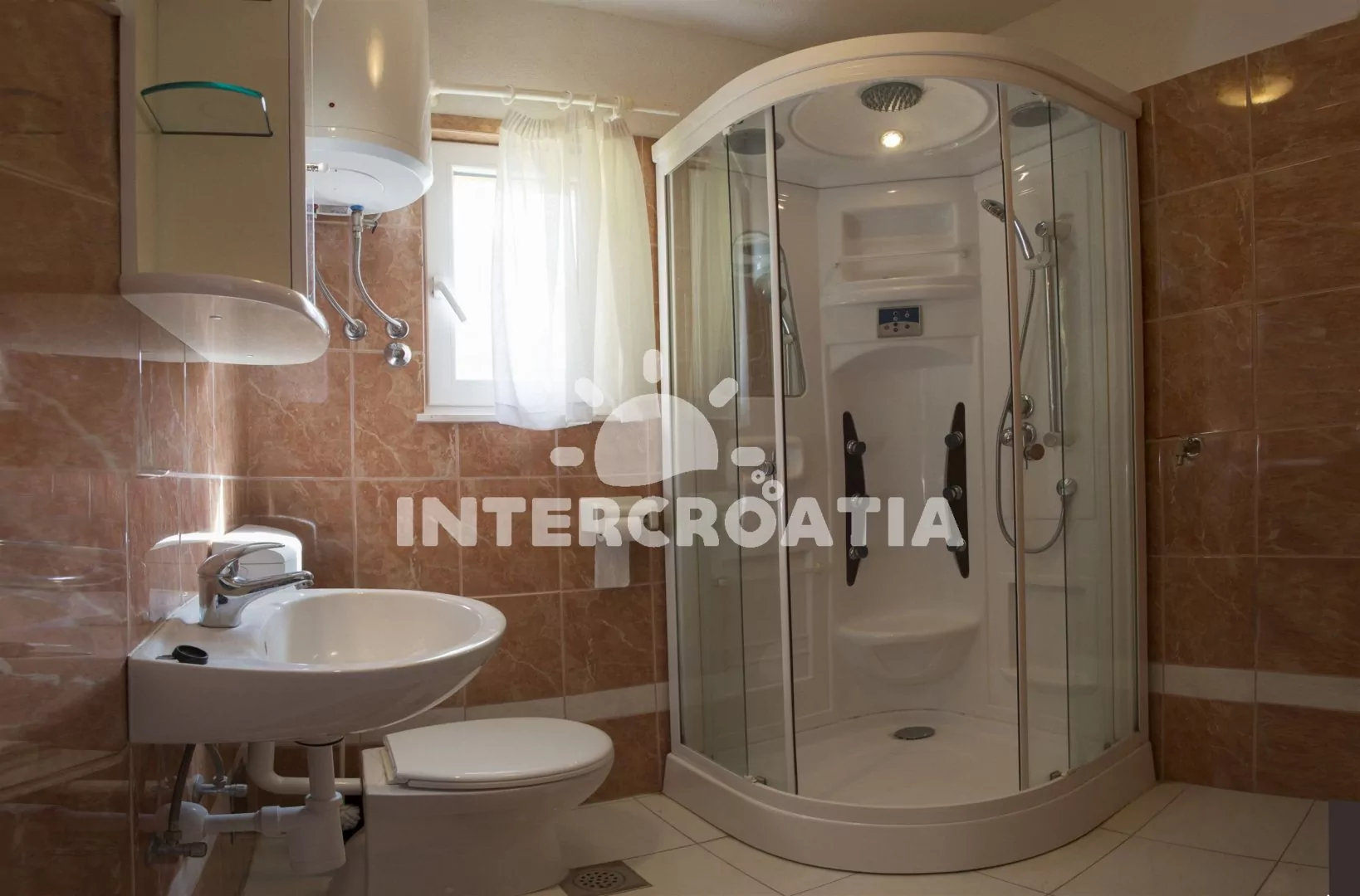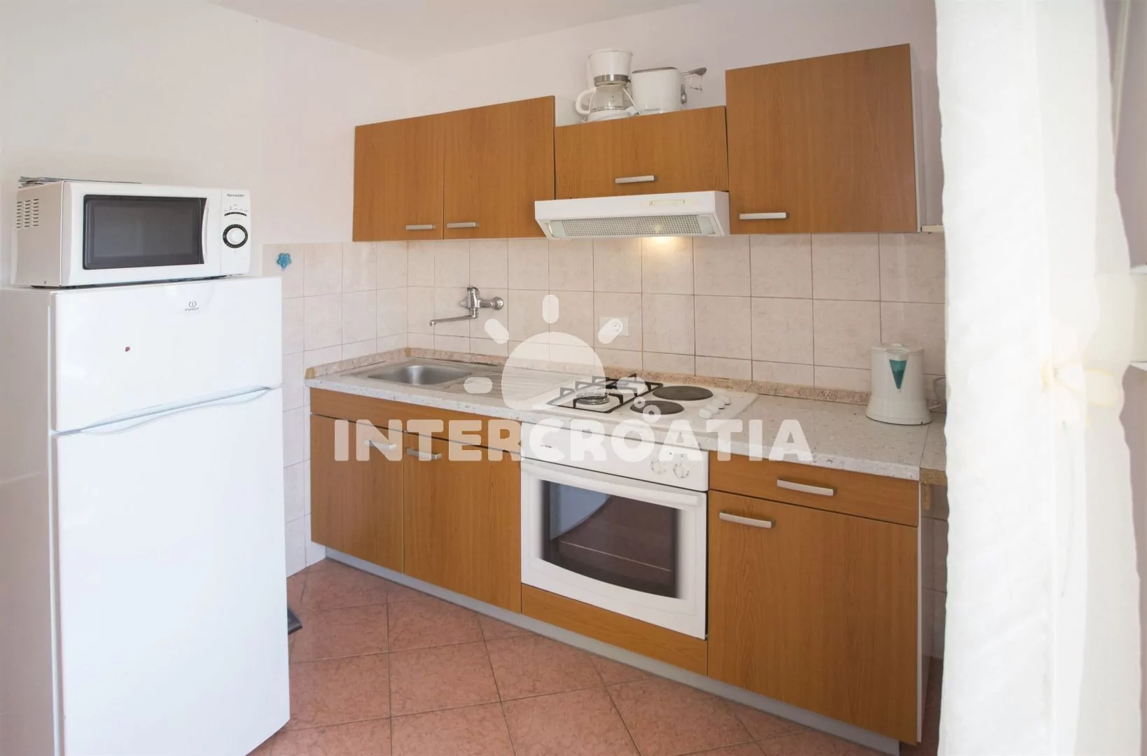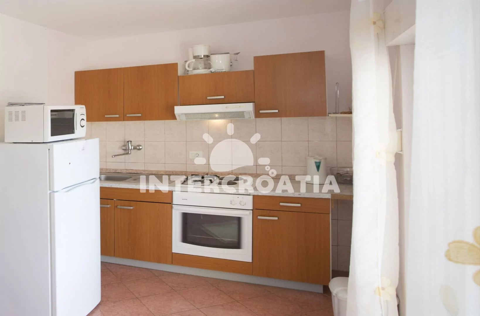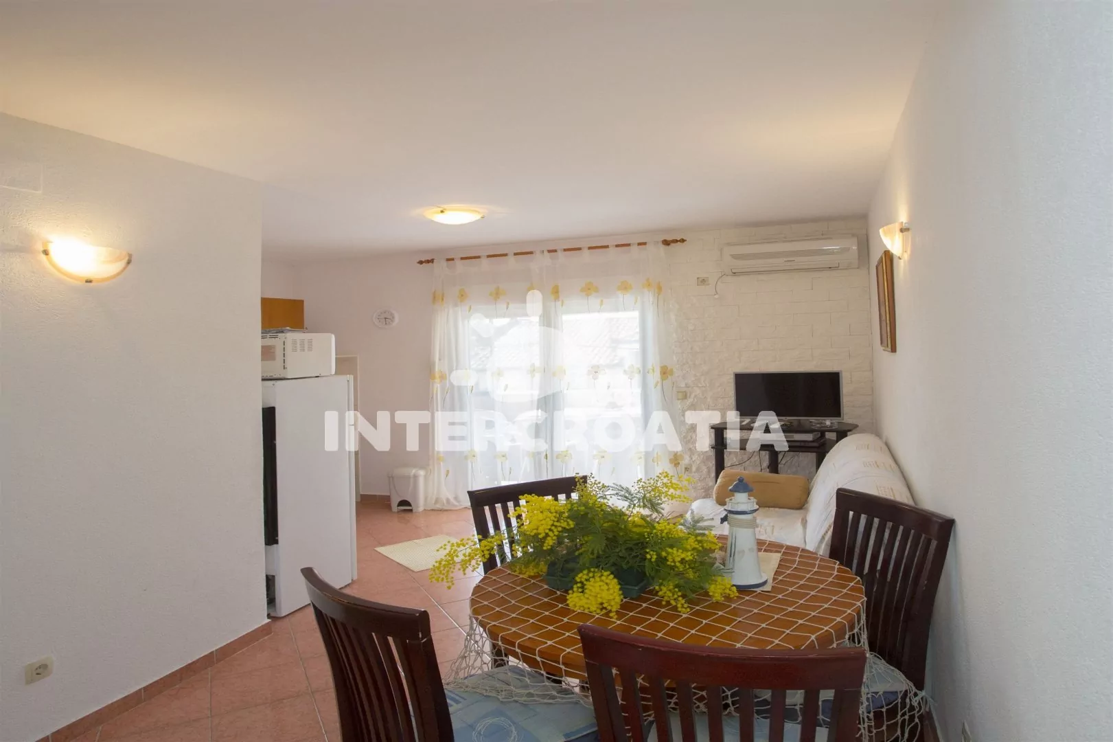 Vzdálenosti: Moře a betonová pláž 100 m, oblázková pláž 150 m, půjčovna motorových člunů a cyklistických kol 100 m, přístav 200 m, veřejná doprava 300 m, potápění 300 m, supermarket, pošta, lékárna, restaurace, bar 1,2 km, diskotéka 3,5 km, centrum, směnárna, banka, trajekt, muzeum, ambulance, čerpací stanice 5 km, letiště 12 km.
