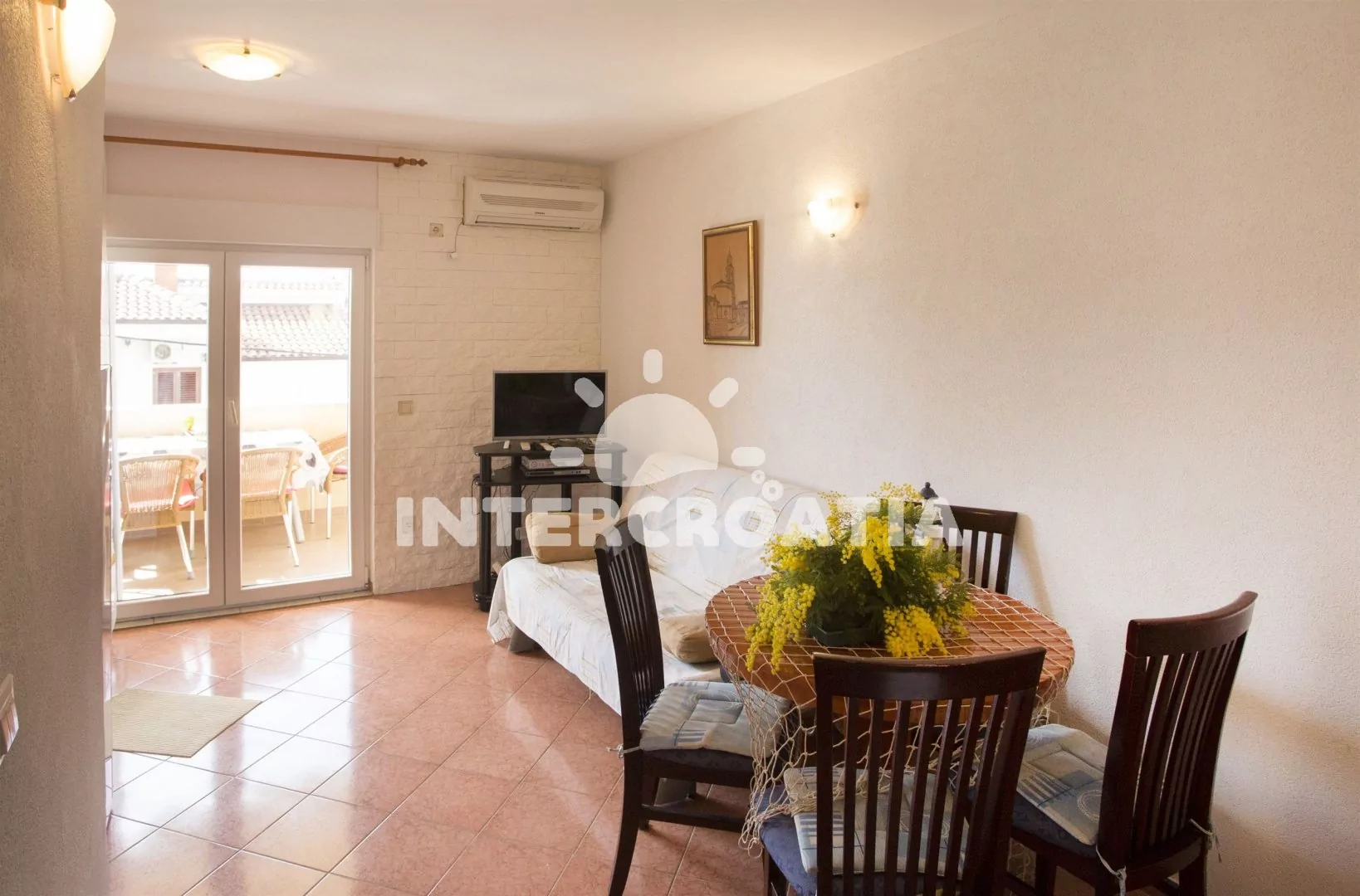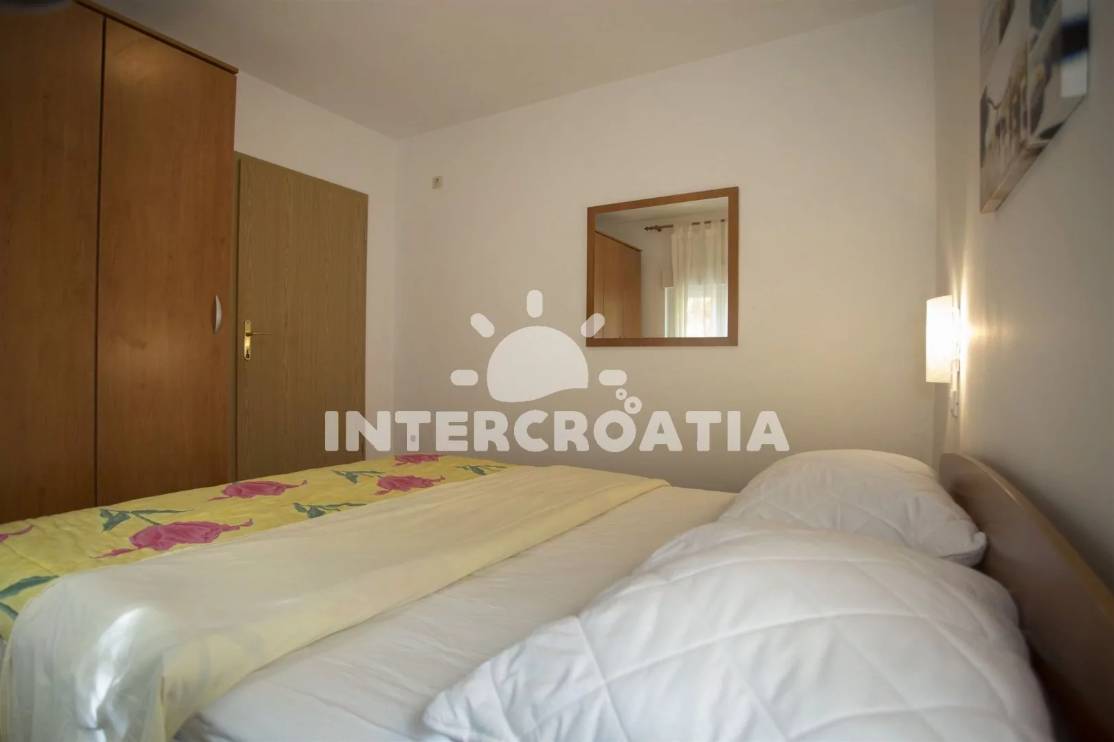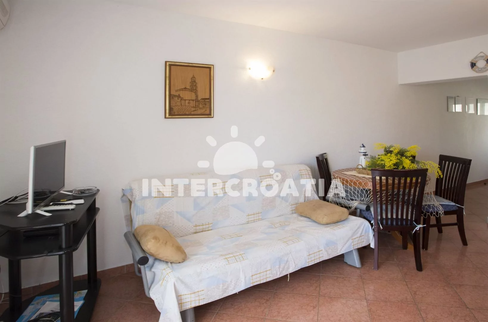Apartmán (35 m2) s terasou a výhledem na moře se nachází v 1. patře domu. Apartmán má 1 ložnici a je vhodný pro 2 až 4 osoby. Obývací pokoj je spojený s kuchyní. Kuchyňská linka je vybavena varnou deskou, digestoří, vestavěnou troubou, mikrovlnnou troubou, toustovačem, rychlovarnou konvicí, kávovarem, nádobím a lednicí s mrazákem. Obývací pokoj s jídelním stolem pro 4 osoby, pohovkou (rozložitelná na extra lůžko pro 2 osoby), televizí, DVD přehrávačem, klimatizací a vstupem na terasu. Ložnice s jedním dvoulůžkem. Koupelna se sprchovým koutem, umyvadlem a wc. Hostům je k dispozici parkování u objektu zdarma.
