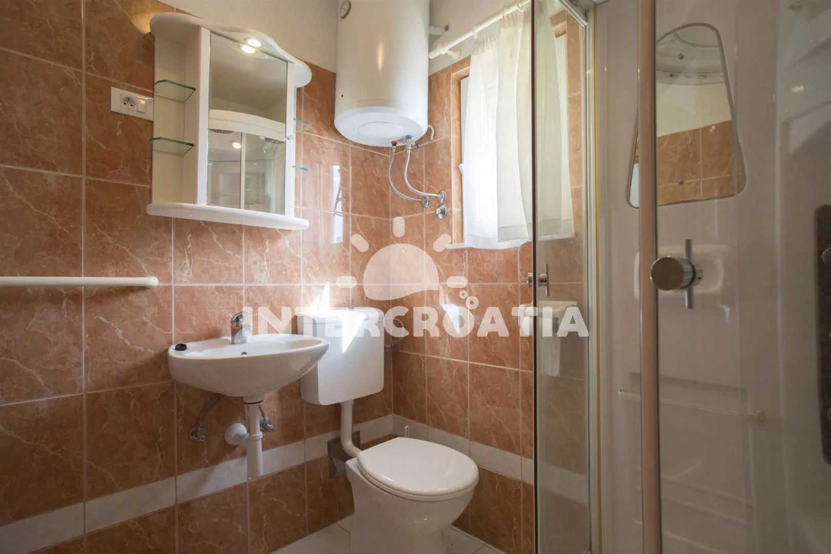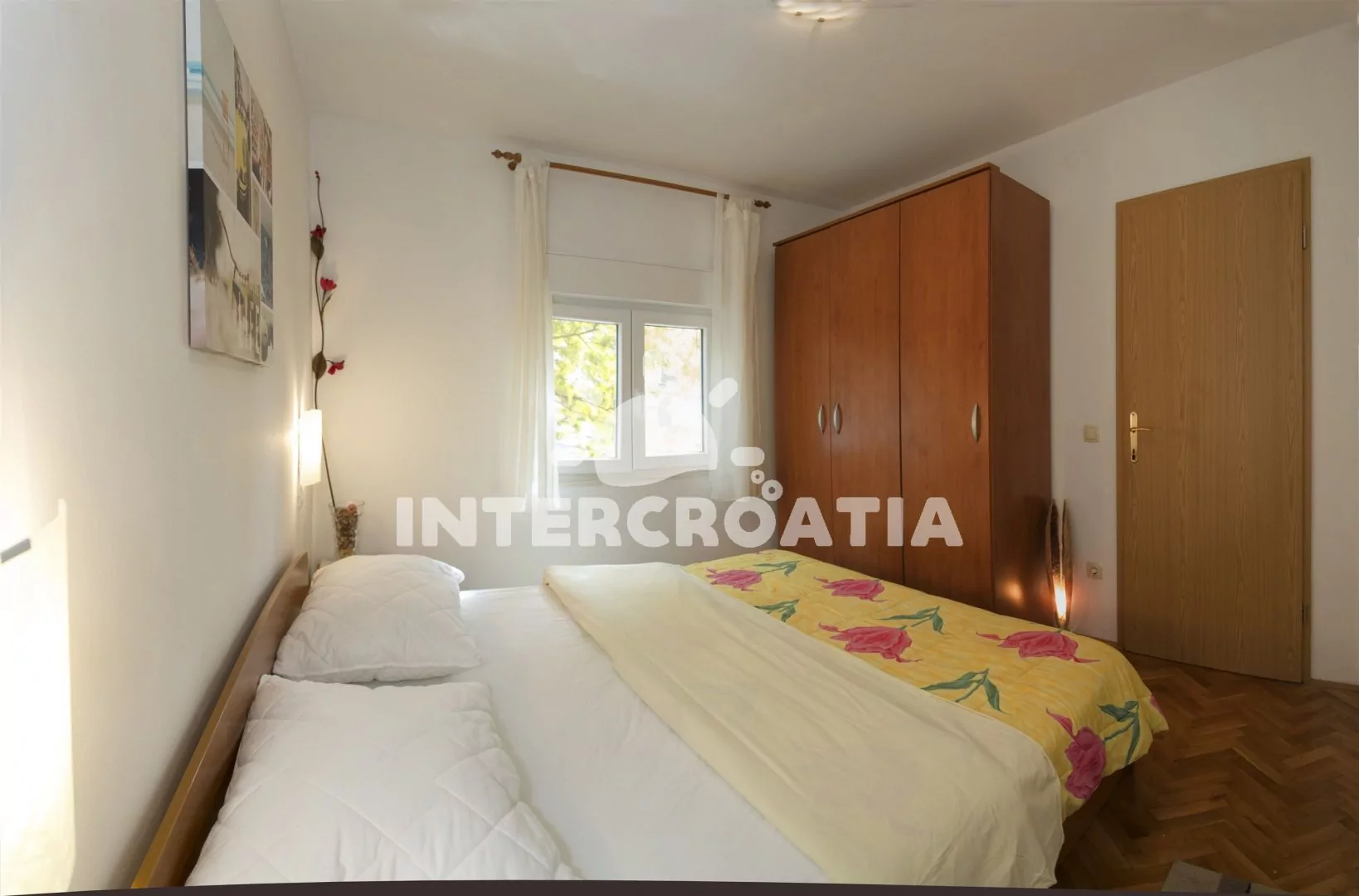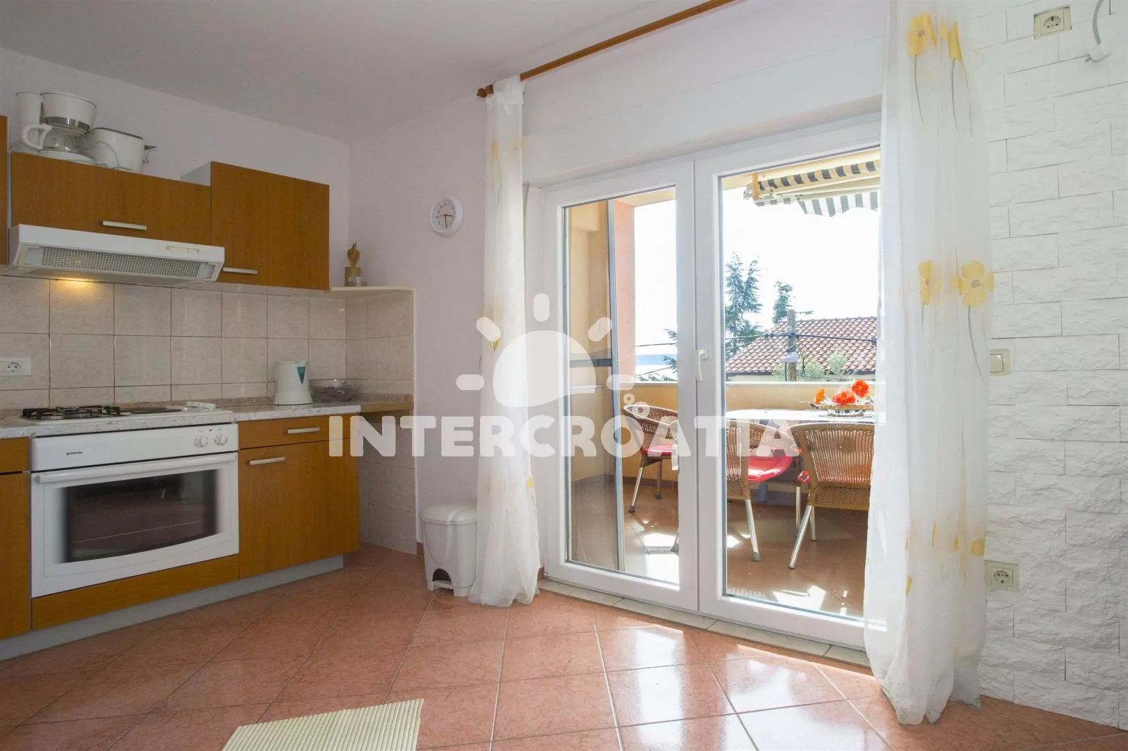 Apartmán (35 m2) s terasou a výhledem na moře se nachází v 1. patře domu. Apartmán má 1 ložnici a je vhodný pro 2 až 4 osoby. Obývací pokoj je spojený s kuchyní. Kuchyňská linka je vybavena varnou deskou, digestoří, vestavěnou troubou, mikrovlnnou troubou, toustovačem, rychlovarnou konvicí, kávovarem, nádobím a lednicí s mrazákem. Obývací pokoj s jídelním stolem pro 4 osoby, pohovkou (rozložitelná na extra lůžko pro 2 osoby), televizí, DVD přehrávačem, klimatizací a vstupem na terasu. Ložnice s jedním dvoulůžkem. Koupelna se sprchovým koutem, umyvadlem a wc. Hostům je k dispozici parkování u objektu zdarma.
