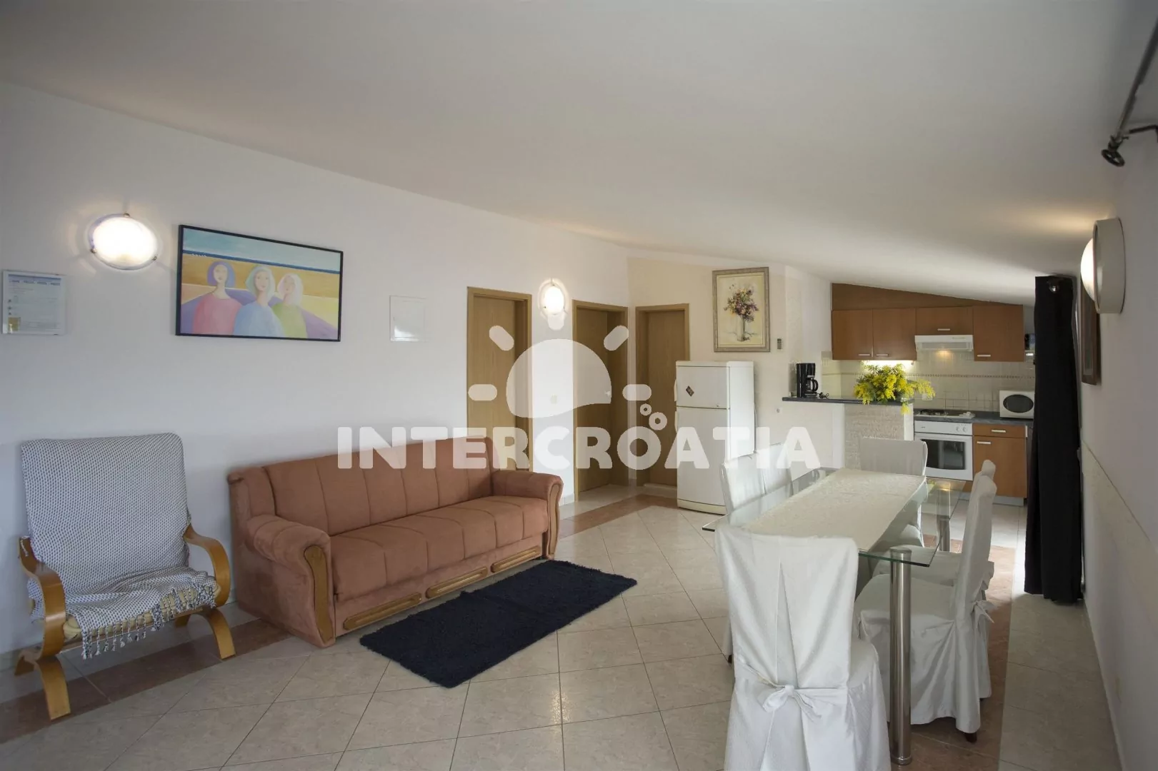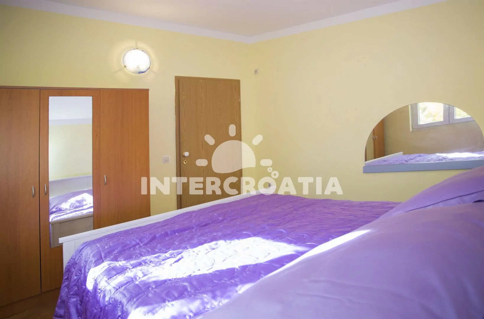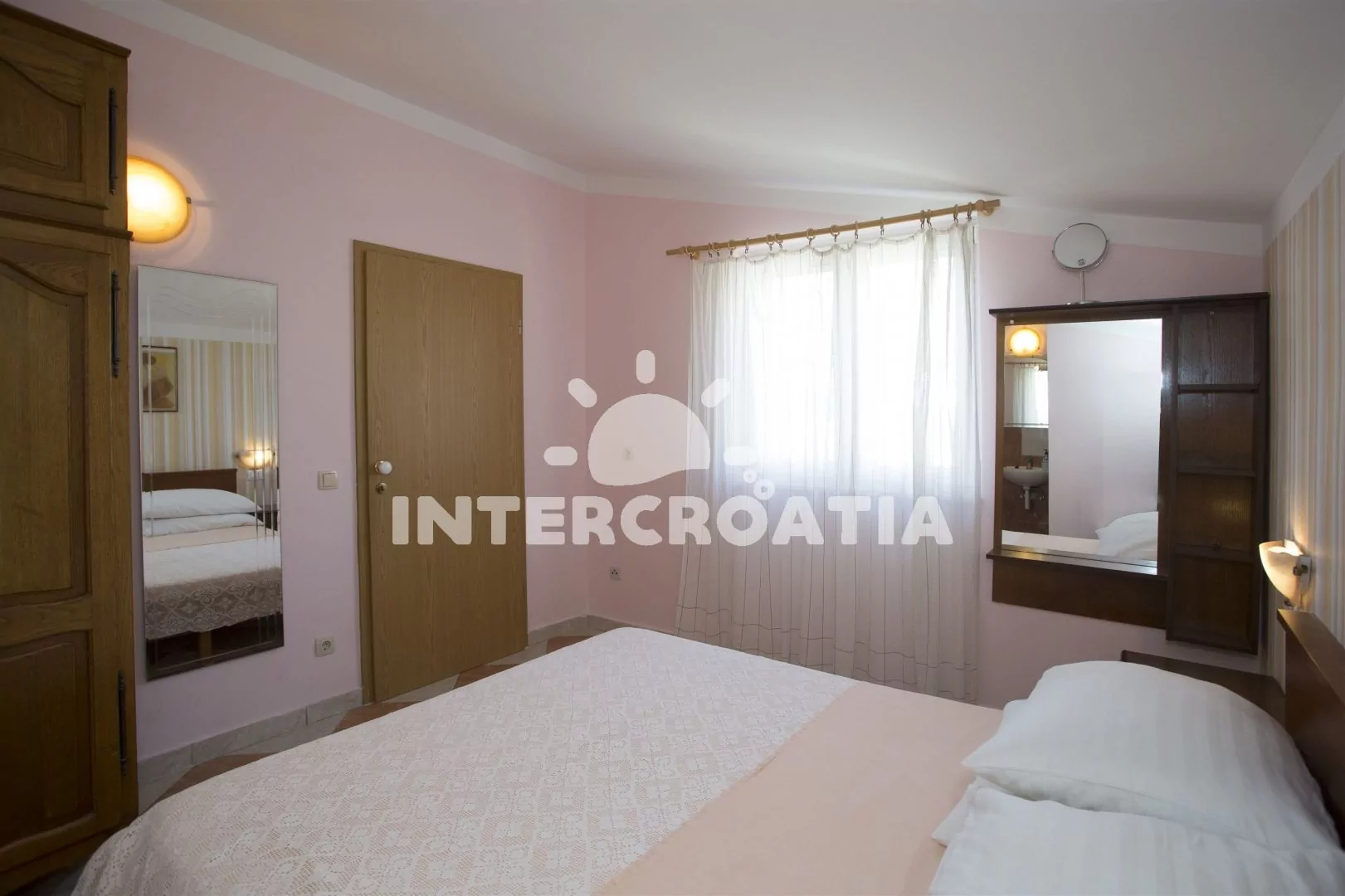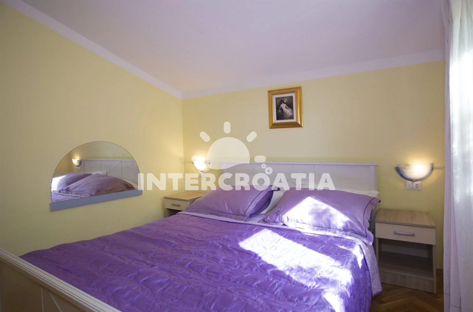 Podkrovní apartmán (70 m2) s terasou a výhledem na moře. Apartmán má 2 ložnice, 2 koupelny a je vhodný pro 4 až 6 osob. Obývací pokoj je spojený s kuchyní. Kuchyňská linka je vybavena varnou deskou, digestoří, vestavěnou troubou, mikrovlnnou troubou, toustovačem, rychlovarnou konvicí, kávovarem, nádobím a lednicí s mrazákem. Obývací pokoj s jídelním stolem pro 6 osob, dvěma pohovkami (rozložitelná na extra lůžko pro 2 osoby), televizí, DVD přehrávačem, klimatizací a vstupem na terasu. První i druhá ložnice je vybavena vždy s jedním dvoulůžkem. Dvě koupelny se sprchovým koutem, umyvadlem a wc. Hostům je k dispozici parkování u objektu zdarma.