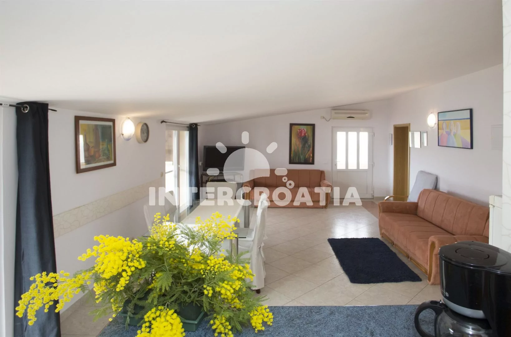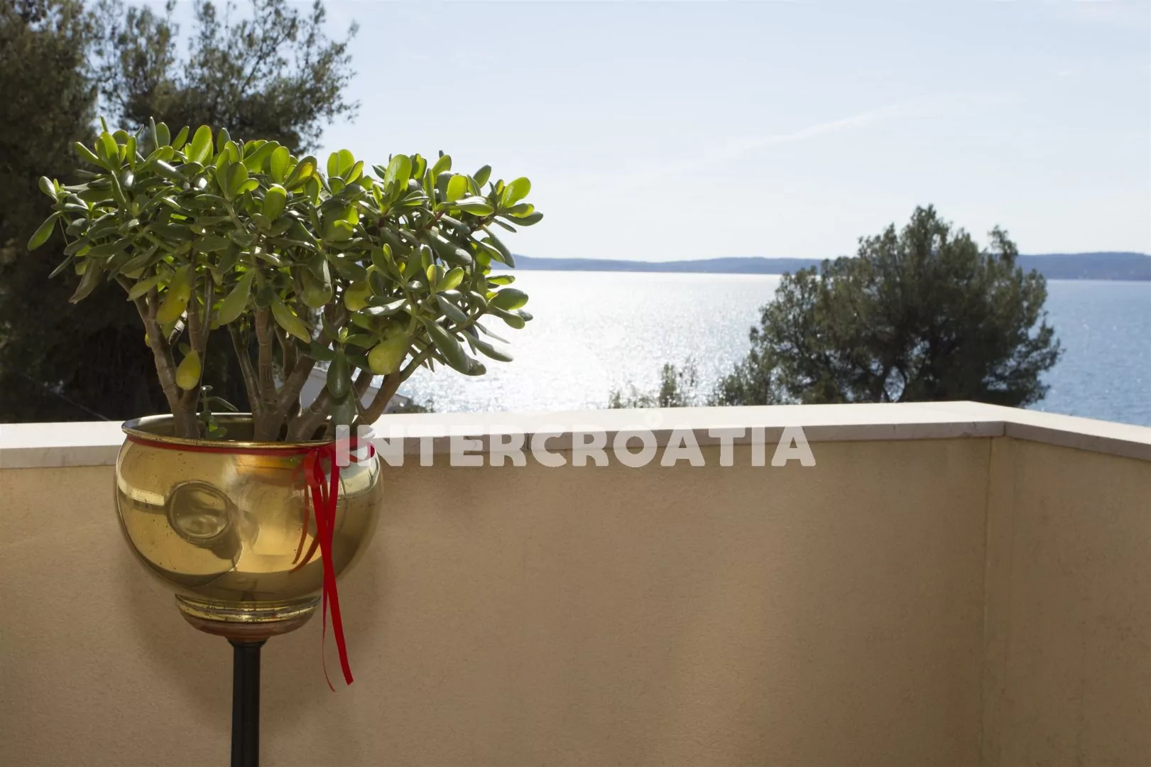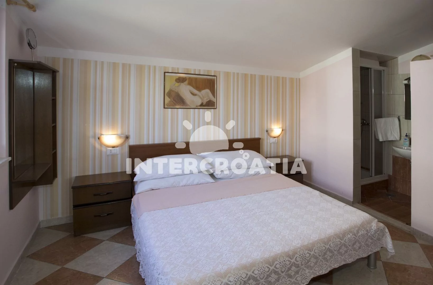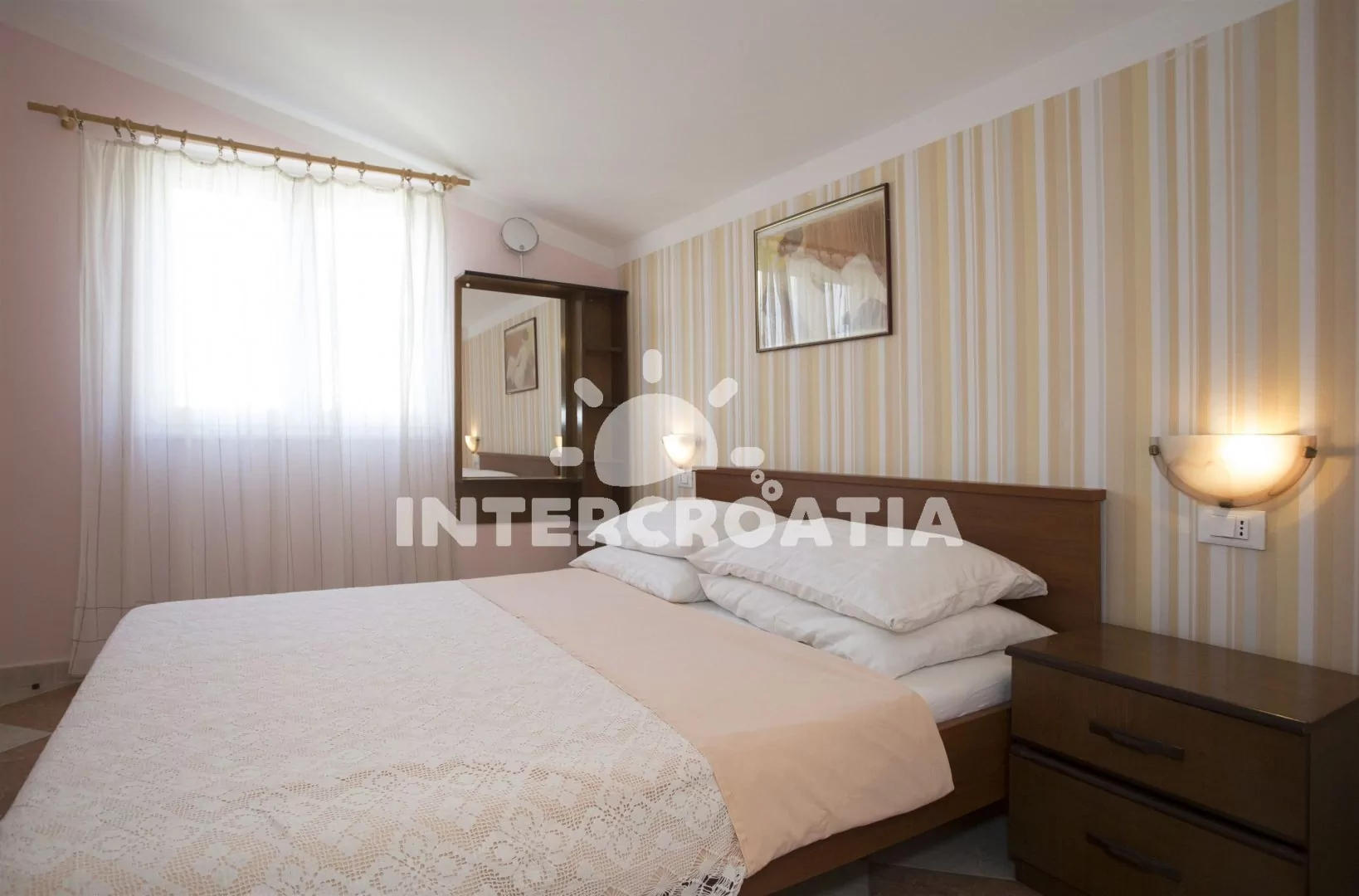 Podkrovní apartmán (70 m2) s terasou a výhledem na moře. Apartmán má 2 ložnice, 2 koupelny a je vhodný pro 4 až 6 osob. Obývací pokoj je spojený s kuchyní. Kuchyňská linka je vybavena varnou deskou, digestoří, vestavěnou troubou, mikrovlnnou troubou, toustovačem, rychlovarnou konvicí, kávovarem, nádobím a lednicí s mrazákem. Obývací pokoj s jídelním stolem pro 6 osob, dvěma pohovkami (rozložitelná na extra lůžko pro 2 osoby), televizí, DVD přehrávačem, klimatizací a vstupem na terasu. První i druhá ložnice je vybavena vždy s jedním dvoulůžkem. Dvě koupelny se sprchovým koutem, umyvadlem a wc. Hostům je k dispozici parkování u objektu zdarma.