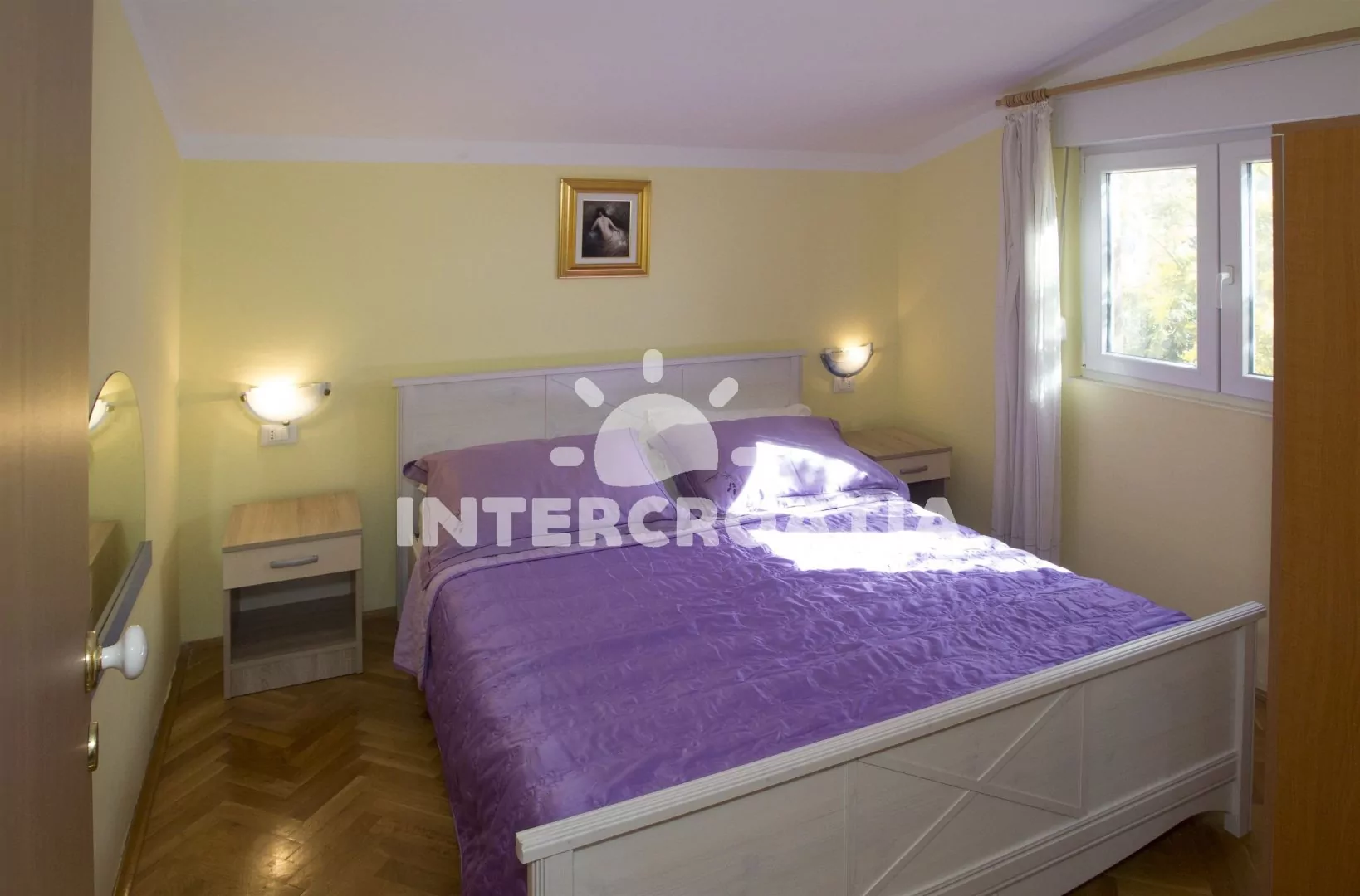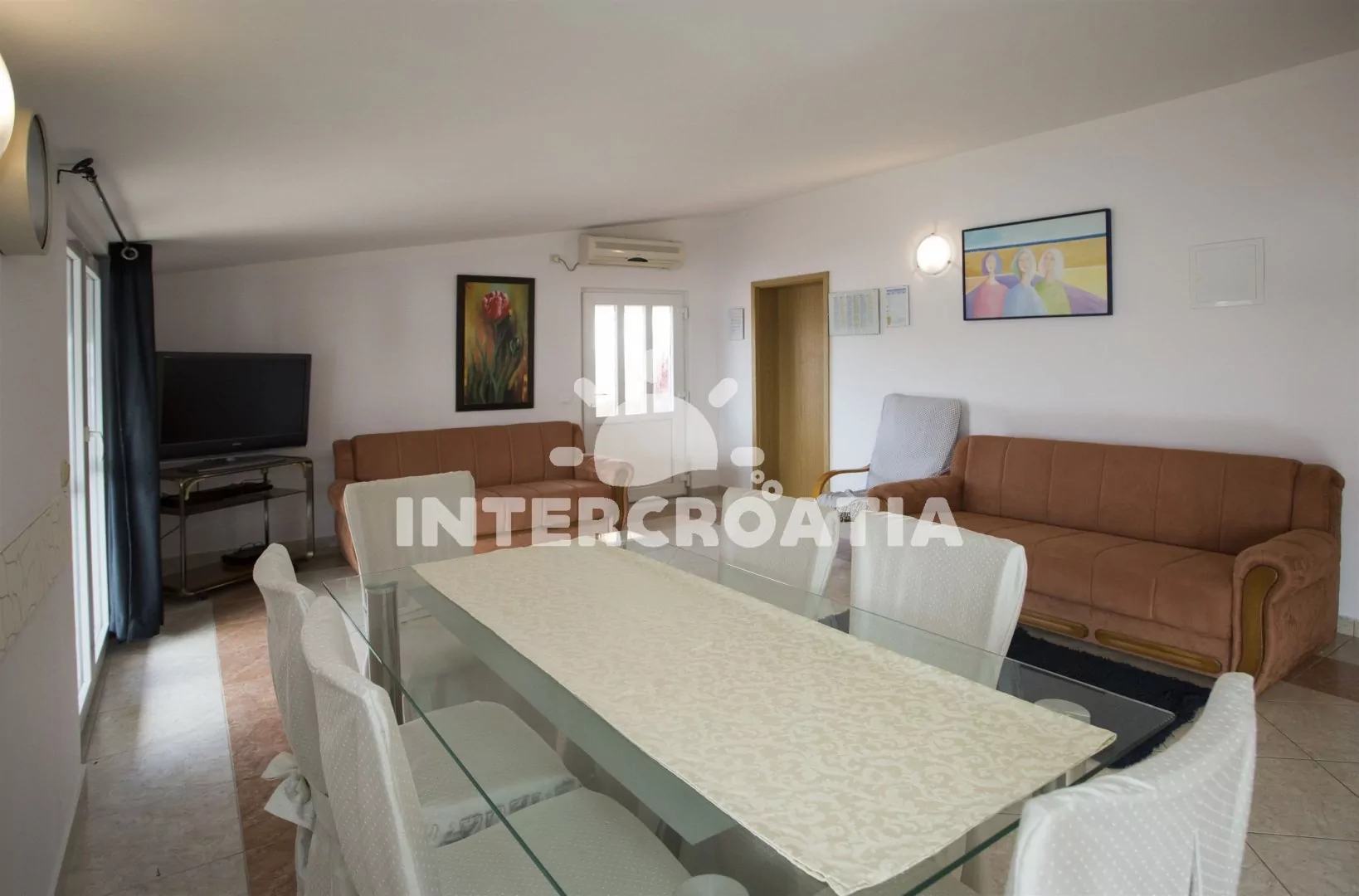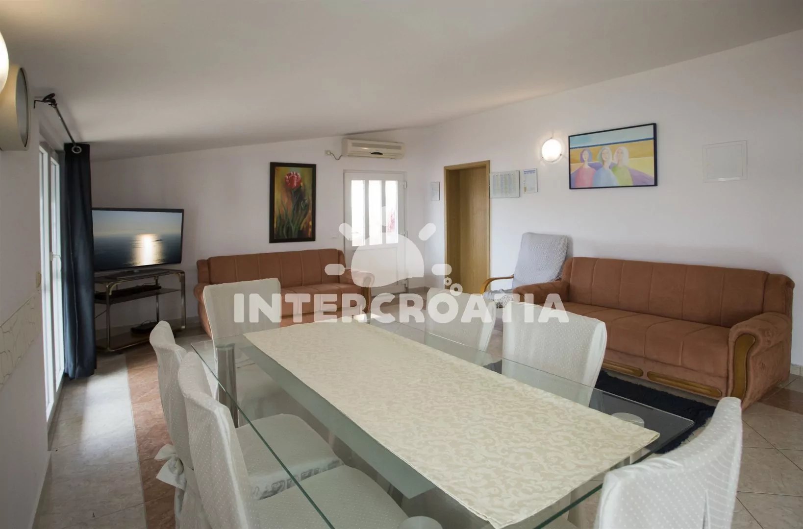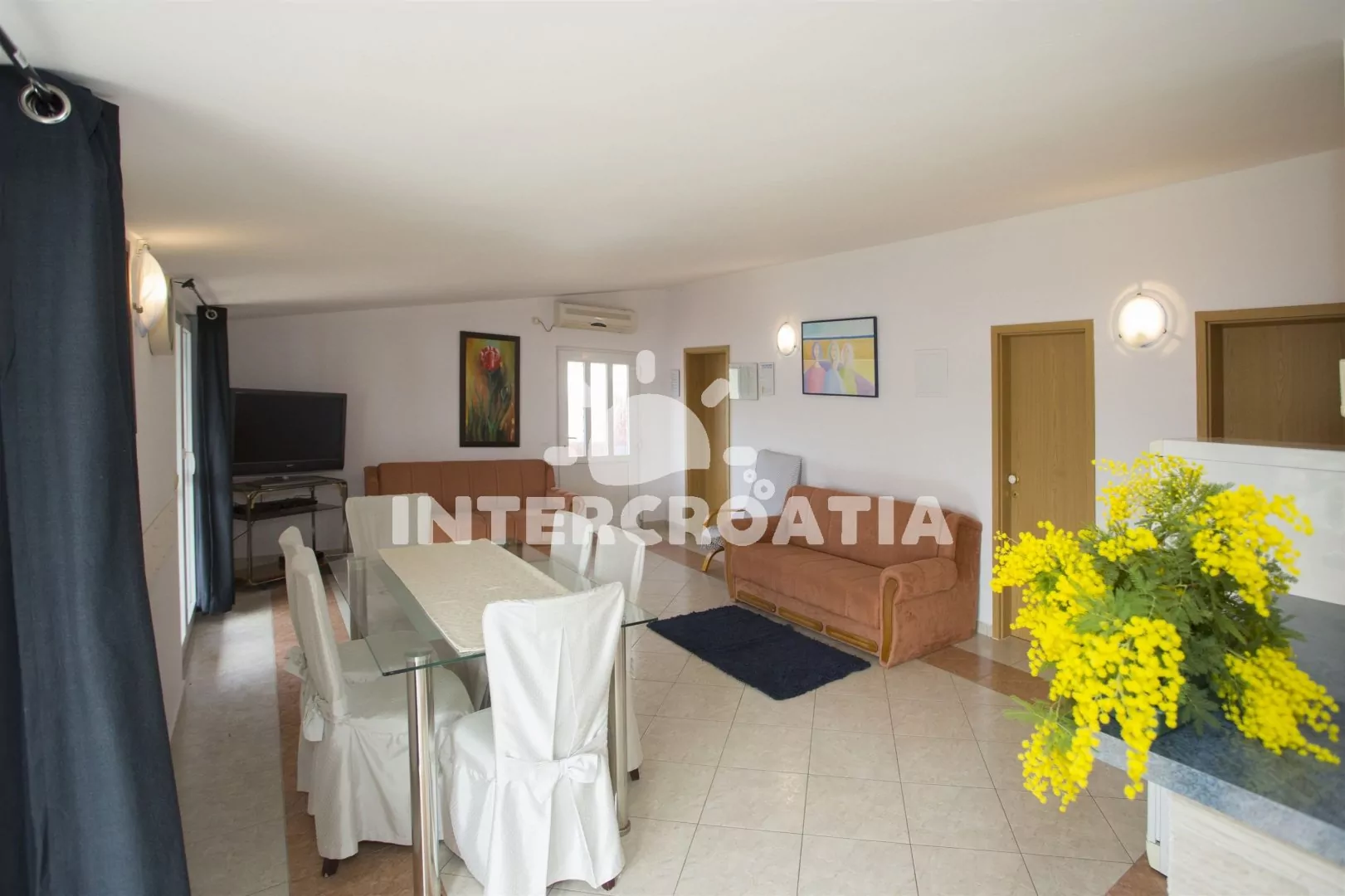Podkrovní apartmán (70 m2) s terasou a výhledem na moře. Apartmán má 2 ložnice, 2 koupelny a je vhodný pro 4 až 6 osob. Obývací pokoj je spojený s kuchyní. Kuchyňská linka je vybavena varnou deskou, digestoří, vestavěnou troubou, mikrovlnnou troubou, toustovačem, rychlovarnou konvicí, kávovarem, nádobím a lednicí s mrazákem. Obývací pokoj s jídelním stolem pro 6 osob, dvěma pohovkami (rozložitelná na extra lůžko pro 2 osoby), televizí, DVD přehrávačem, klimatizací a vstupem na terasu. První i druhá ložnice je vybavena vždy s jedním dvoulůžkem. Dvě koupelny se sprchovým koutem, umyvadlem a wc. Hostům je k dispozici parkování u objektu zdarma.