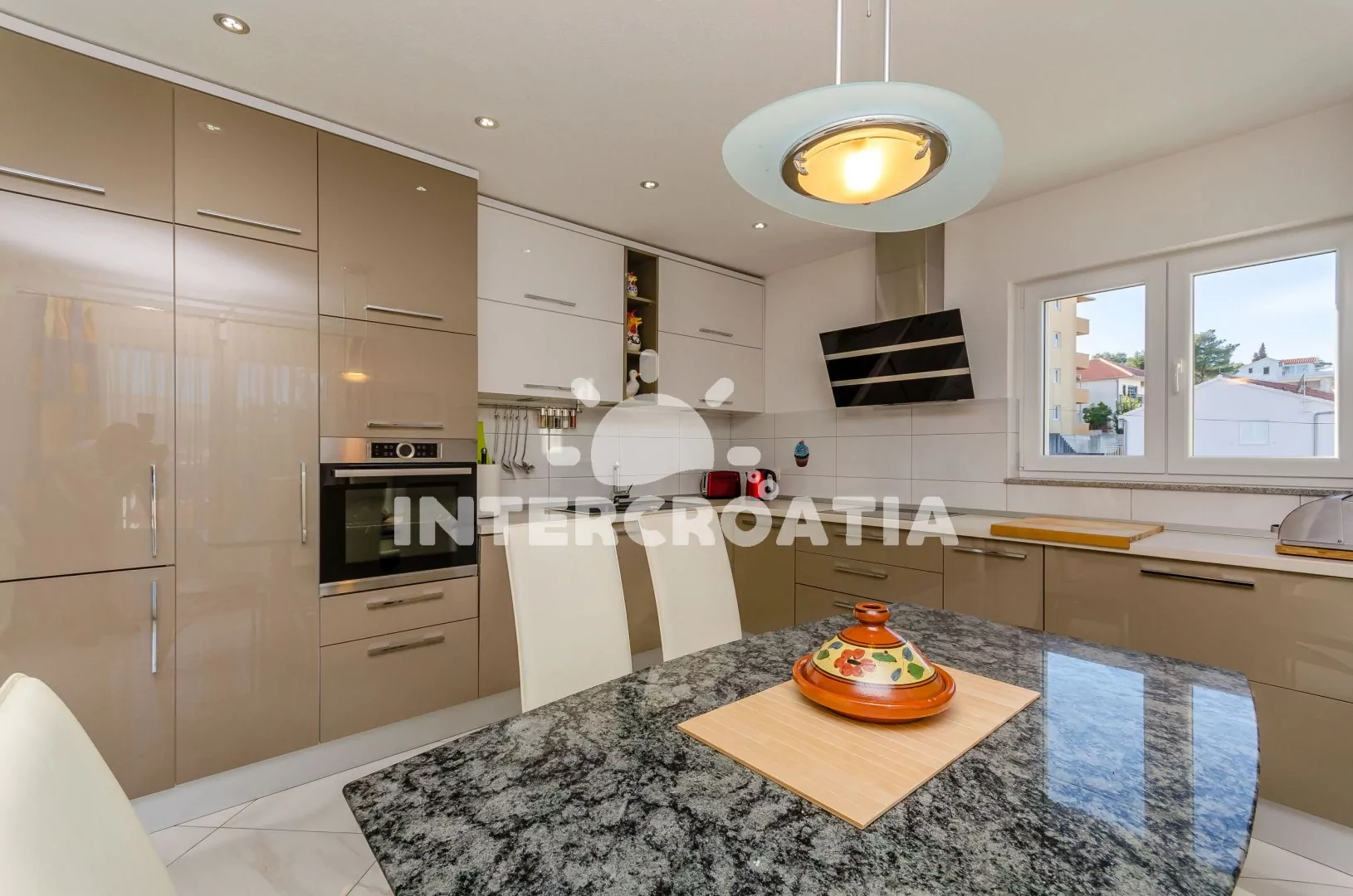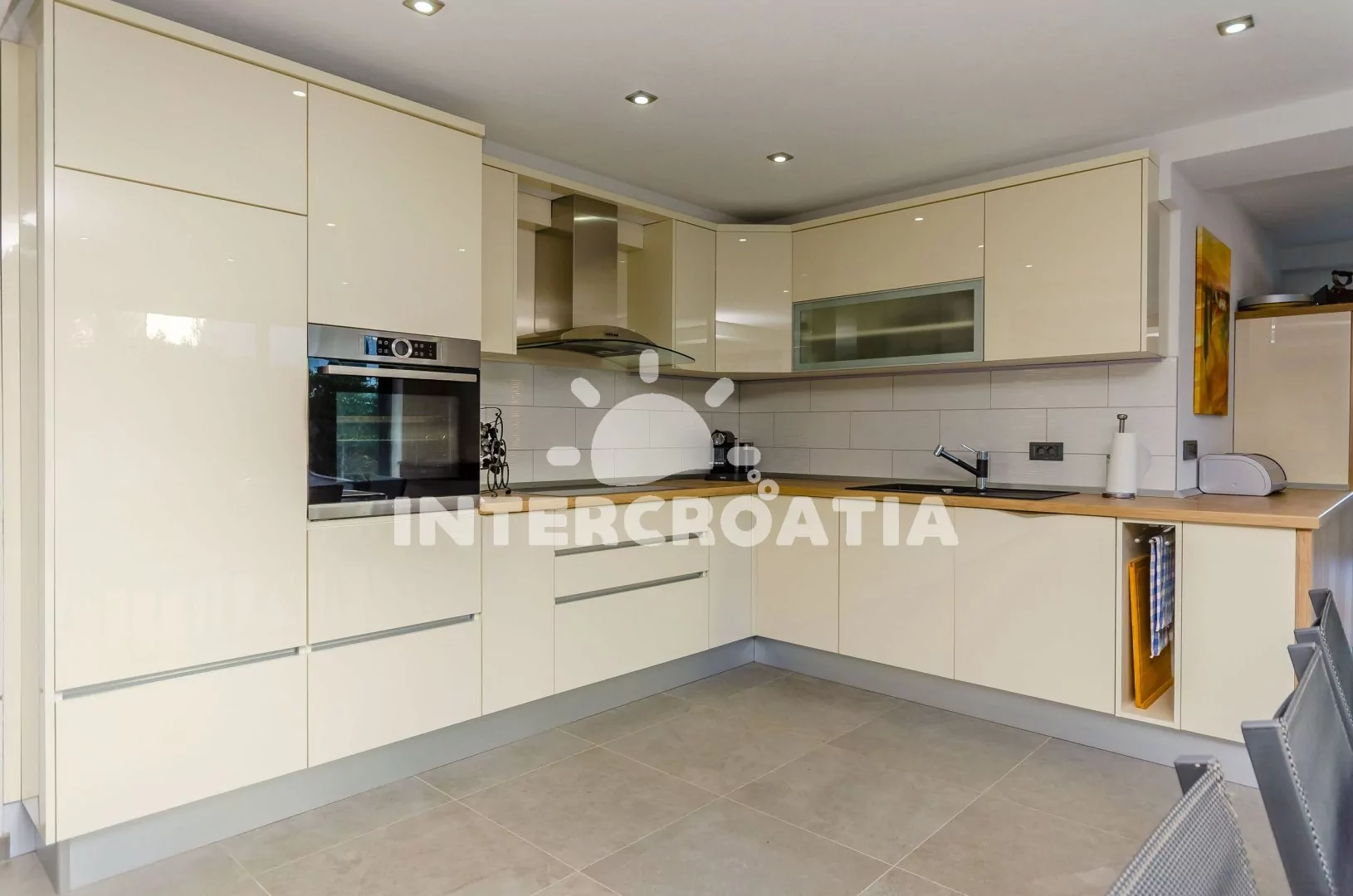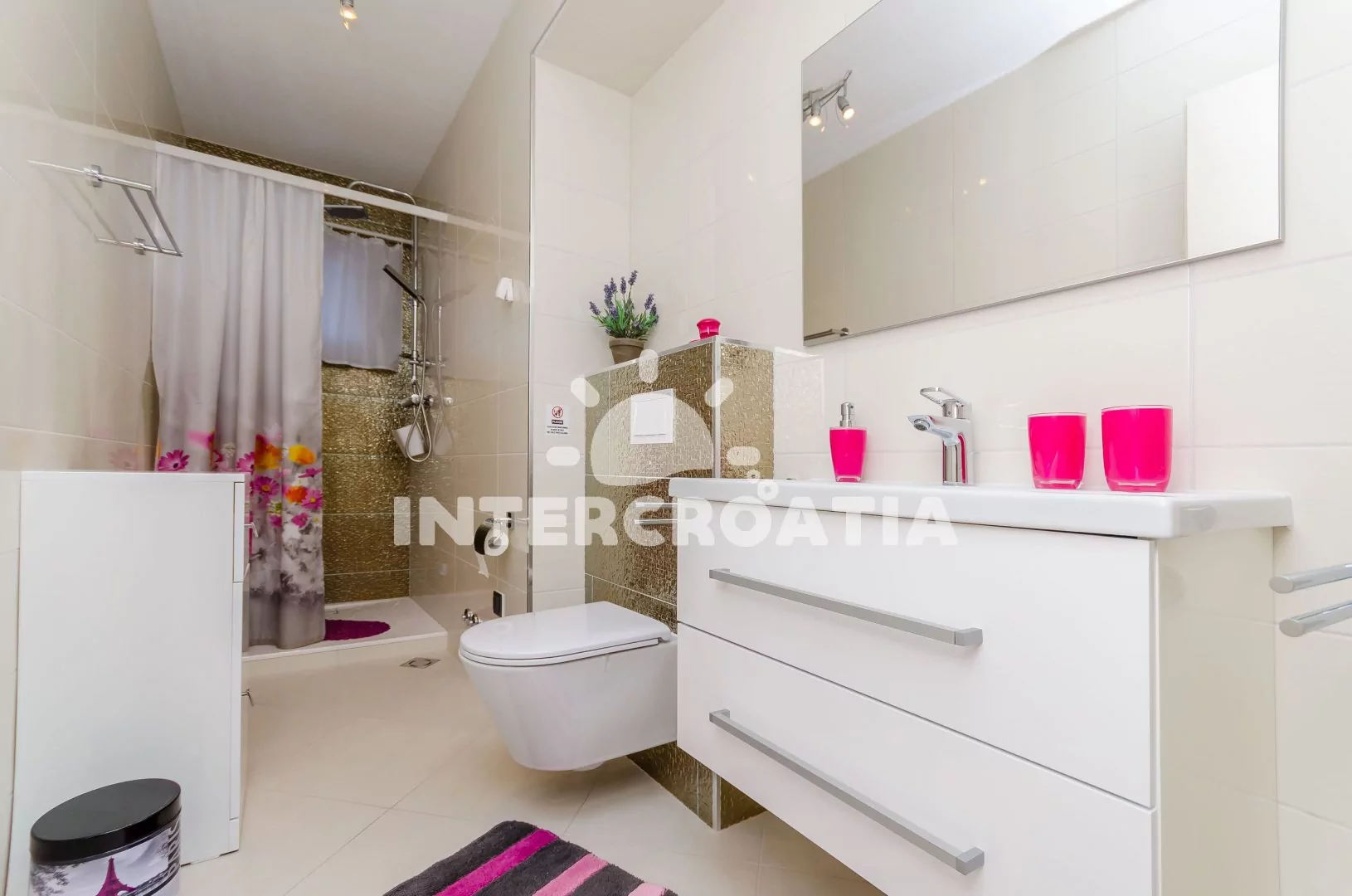 Apartmán (72 m2) s terasou, posezením a výhledem na moře se nachází v přízemí domu. Apartmán má 2 ložnice, 2 koupelny a je vhodný pro 4 až 5 osob. Obývací pokoj je spojený s kuchyní. Kuchyňská linka…