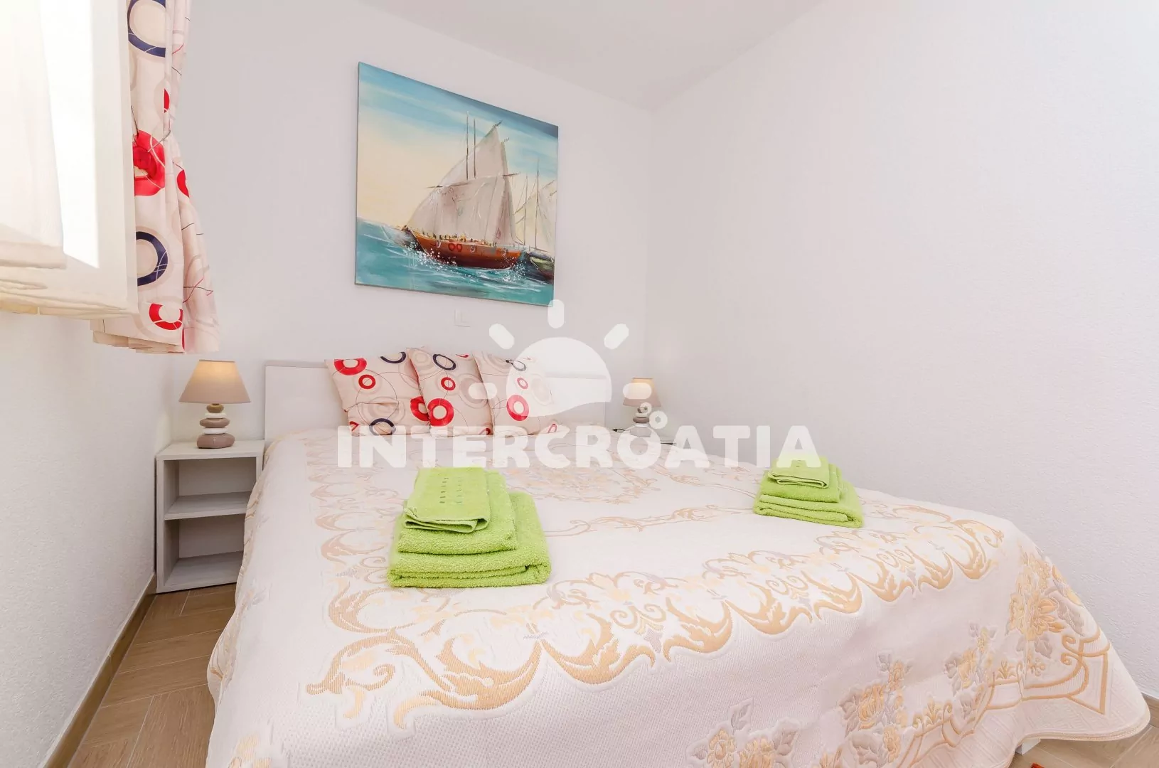 Apartmán (72 m2) s terasou, posezením a výhledem na moře se nachází v přízemí domu. Apartmán má 2 ložnice, 2 koupelny a je vhodný pro 4 až 5 osob. Obývací pokoj je spojený s kuchyní. Kuchyňská linka je vybavena sklokeramickou varnou deskou, digestoří, vestavěnou troubou, myčkou na nádobí, mikrovlnnou troubou, rychlovarnou konvicí, kávovarem, toustovačem, nádobím a lednicí s mrazákem. Obývací pokoj s jídelním stolem pro 6 osob, rohovou pohovkou (rozložitelná na extra lůžko pro 1 osobu), televizí se satelitním programem, klimatizací a vstupem na terasu. První ložnice s dvoulůžkem, sejfem a klimatizací. Druhá ložnice s dvoulůžkem a klimatizací. První koupelna se sprchovým koutem, umyvadlem, fénem, pračkou a wc. Druhá koupelna se sprchovým koutem, umyvadlem a wc. Hostům je k dispozici parkování u objektu zdarma.