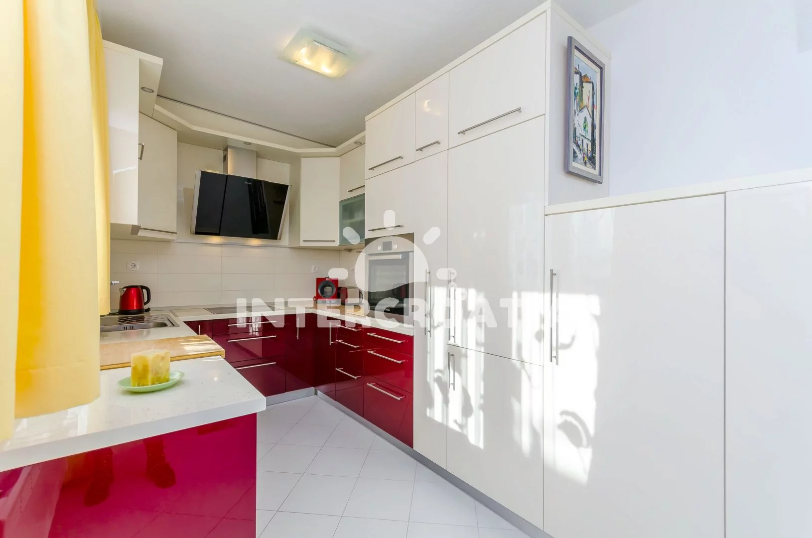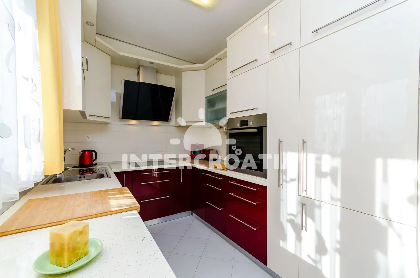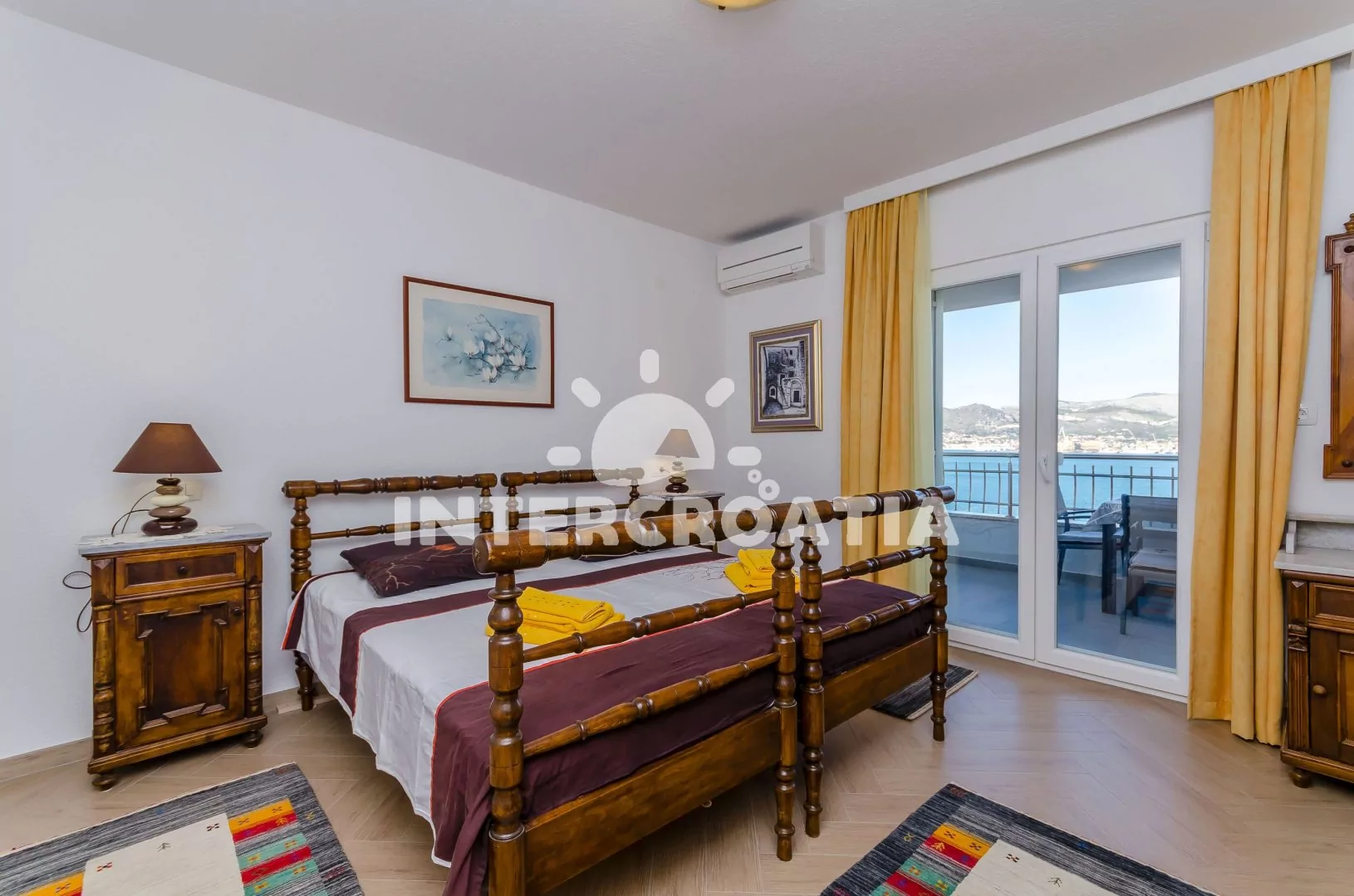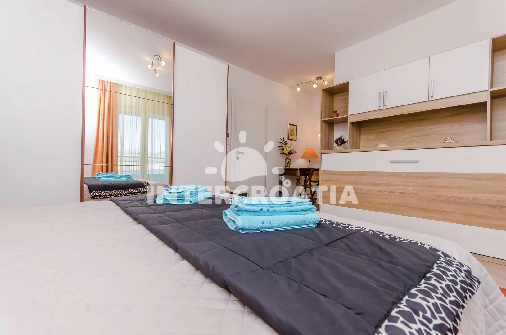 Apartmán (73 m2) s terasou, posezením a výhledem na moře se nachází v 1. patře domu. Apartmán má 2 ložnice, 2 koupelny a je vhodný pro 4 až 5 osob. Obývací pokoj je spojený s kuchyní. Kuchyňská linka je vybavena sklokeramickou varnou deskou, digestoří, vestavěnou troubou, myčkou na nádobí, mikrovlnnou troubou, rychlovarnou konvicí, kávovarem, toustovačem, nádobím a lednicí s mrazákem. Obývací pokoj s jídelním stolem, pohovkou (rozložitelná na extra lůžko pro 1 osobu), televizí se satelitním programem a klimatizací. První ložnice s dvoulůžkem, sejfem, klimatizací a vstupem na terasu. Druhá ložnice s dvoulůžkem, klimatizací a vstupem na terasu. První koupelna se sprchovým koutem, umyvadlem, fénem, pračkou a wc. Druhá koupelna se sprchovým koutem, umyvadlem a wc. Hostům je k dispozici parkování u objektu zdarma.