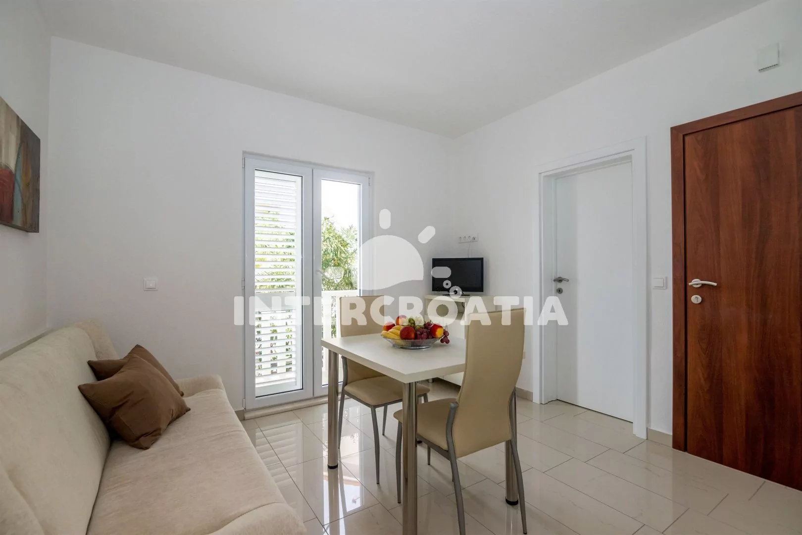 Apartmán (30 m2) s terasou, posezením a částečným výhledem na moře se nachází v přízemí domu. Apartmán má 1 ložnici a je vhodný pro 2 až 4 osoby. Obývací pokoj je spojený s kuchyní. Kuchyňská linka je vybavena dvouplotýnkovým vařičem, mikrovlnnou troubou, rychlovarnou konvicí, kávovarem, nádobím a lednicí s mrazákem. Obývací pokoj s jídelním stolem pro 2 osoby, pohovkou (rozložitelná na extra lůžko pro 2 osoby), televizí se satelitním programem, klimatizací a vstupem na terasu. Ložnice s jedním dvoulůžkem. Koupelna se sprchovým koutem, umyvadlem a wc. Hostům je k dispozici parkování u objektu zdarma.
