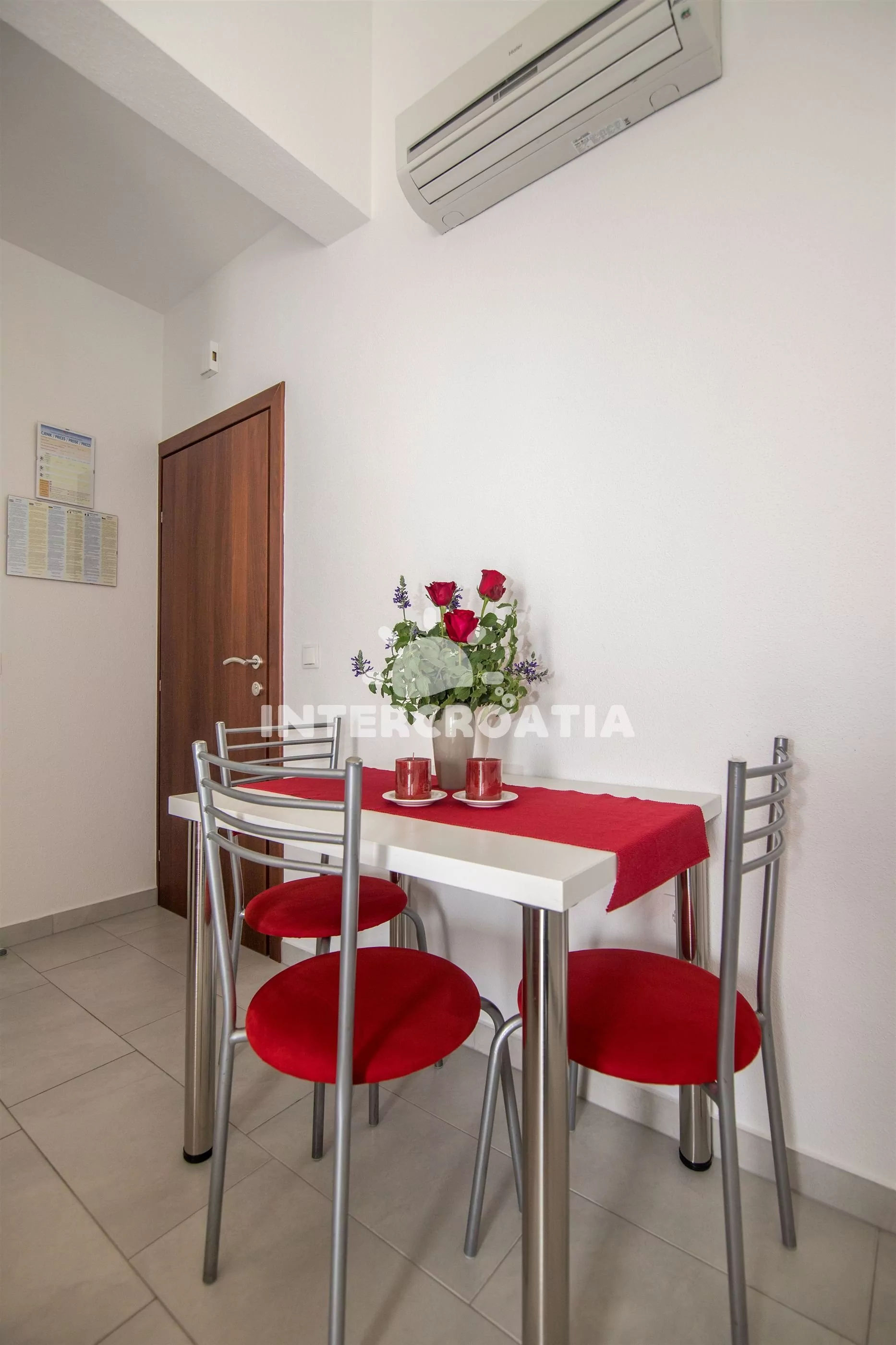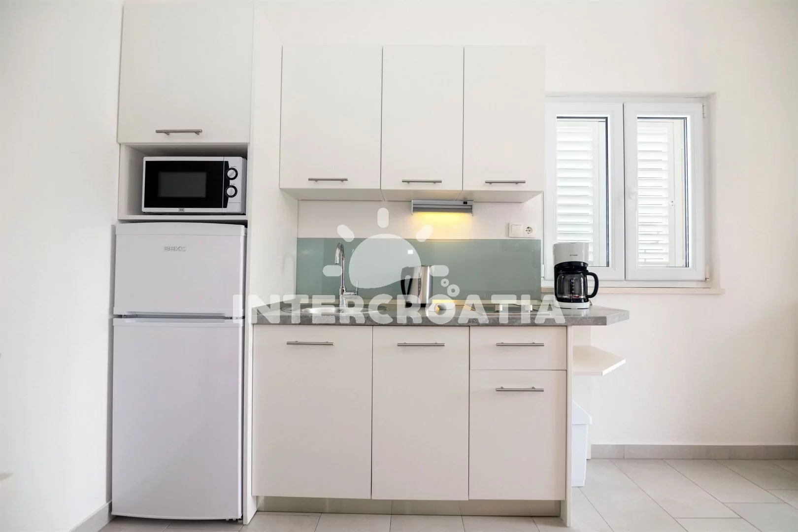 Apartmán (32 m2) s terasou, posezením a částečným výhledem na moře se nachází v 1. patře domu. Apartmán má 1 ložnici a je vhodný pro 2 až 4 osoby. Obývací pokoj je spojený s kuchyní. Kuchyňská linka je vybavena dvouplotýnkovým vařičem, mikrovlnnou troubou, rychlovarnou konvicí, kávovarem, nádobím a lednicí s mrazákem. Obývací pokoj s jídelním stolem pro 3 osoby, pohovkou (rozložitelná na extra lůžko pro 2 osoby), televizí se satelitním programem, klimatizací a vstupem na terasu. Ložnice s jedním dvoulůžkem. Koupelna se sprchovým koutem, umyvadlem a wc. Hostům je k dispozici parkování u objektu zdarma.
