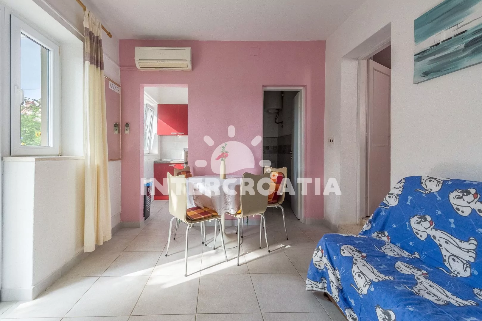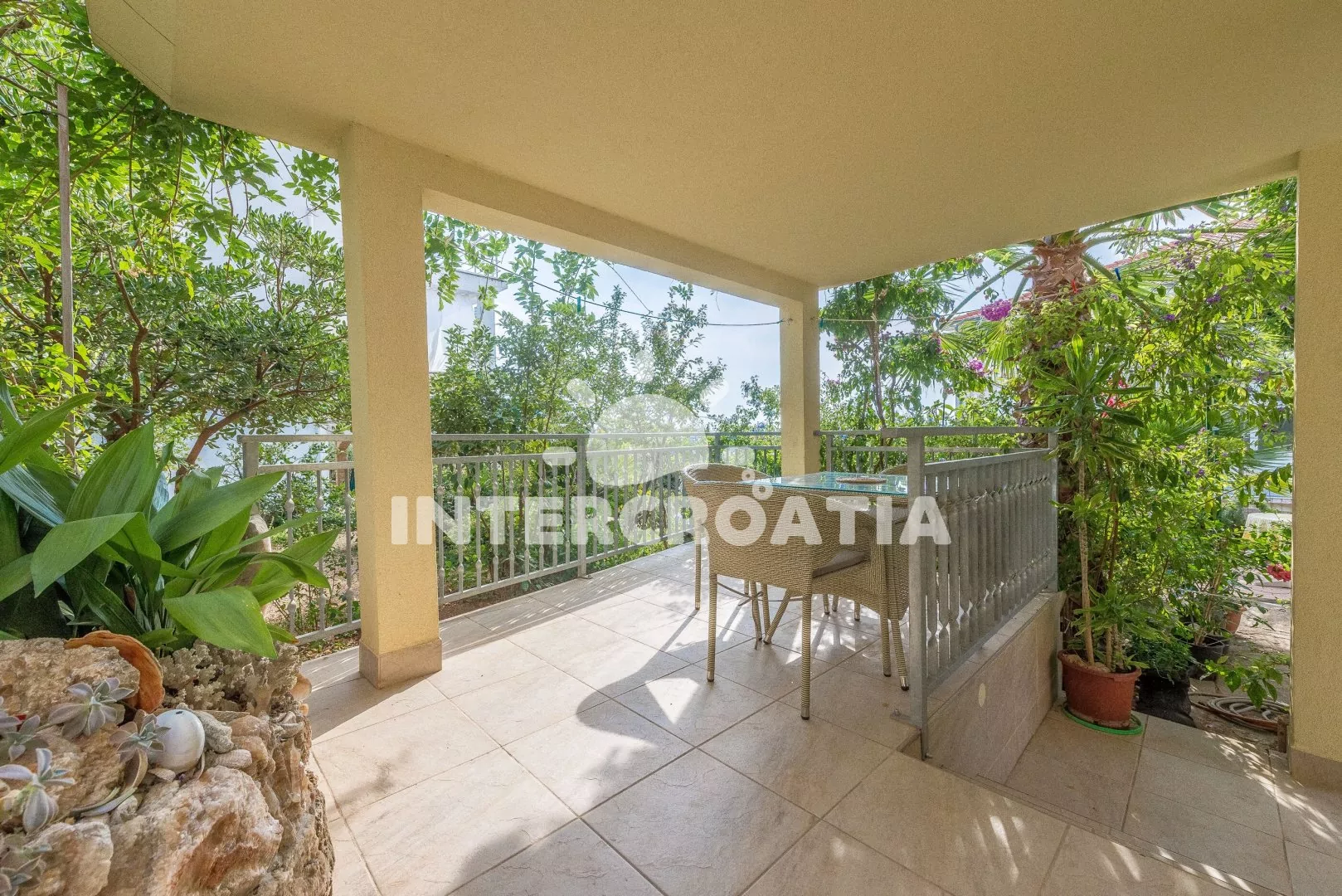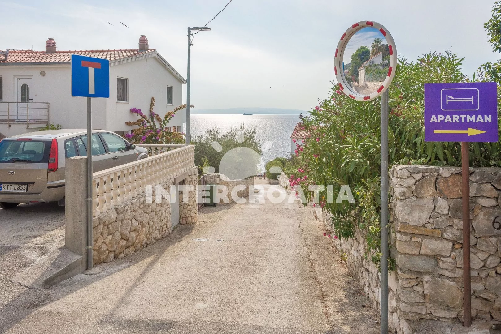 Apartmán (40 m2) s terasou, posezením a částečným výhledem na moře se nachází v přízemí domu. Apartmán má 1 ložnici a je vhodný pro 2 až 4 osoby. Obývací pokoj je spojený s kuchyní. Kuchyňská linka je vybavena dvouplotýnkovým vařičem, mikrovlnnou troubou, kávovarem, nádobím a lednicí s mrazákem. Obývací pokoj s jídelním stolem pro 4 osoby, pohovkou (rozložitelná na extra lůžko pro 1 osobu), televizí se satelitním programem, klimatizací a vstupem na terasu. Ložnice s dvoulůžkem a přistýlkou (lůžko pro 1 osobu). Koupelna se sprchovým koutem, umyvadlem a wc. Hostům je k dispozici parkování u objektu zdarma.