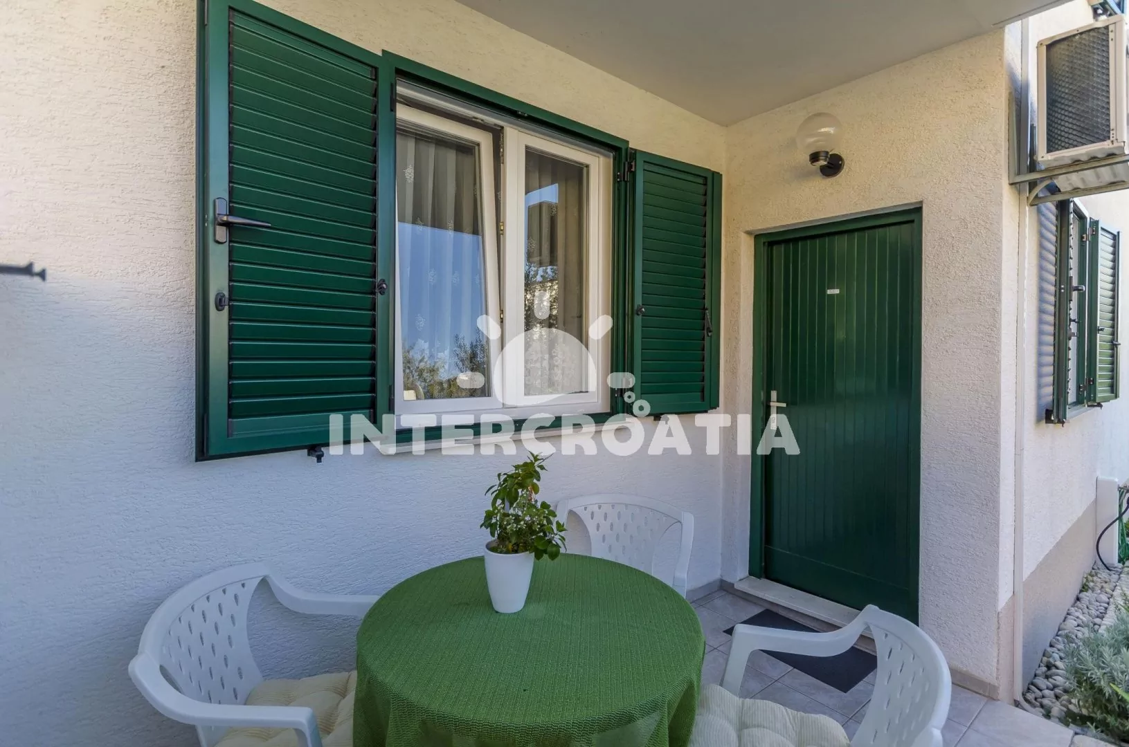 Apartmán (30 m2) s terasou a posezením se nachází v přízemí domu. Apartmán má 1 ložnici a je vhodný pro 2 až 4 osoby. Obývací pokoj je spojený s kuchyní. Kuchyňská linka je vybavena dvouplotýnkovým vařičem, rychlovarnou konvicí, nádobím a lednicí s mrazákem (na požádání kávovar). Obývací pokoj s jídelním stolem pro 4 osoby, pohovkou (rozložitelná na extra lůžko pro 2 osoby), televizí se satelitním programem, klimatizací a vstupem na terasu. Ložnice s jedním dvoulůžkem. Koupelna se sprchovým koutem, umyvadlem a wc. Hostům je k dispozici parkování u objektu zdarma.