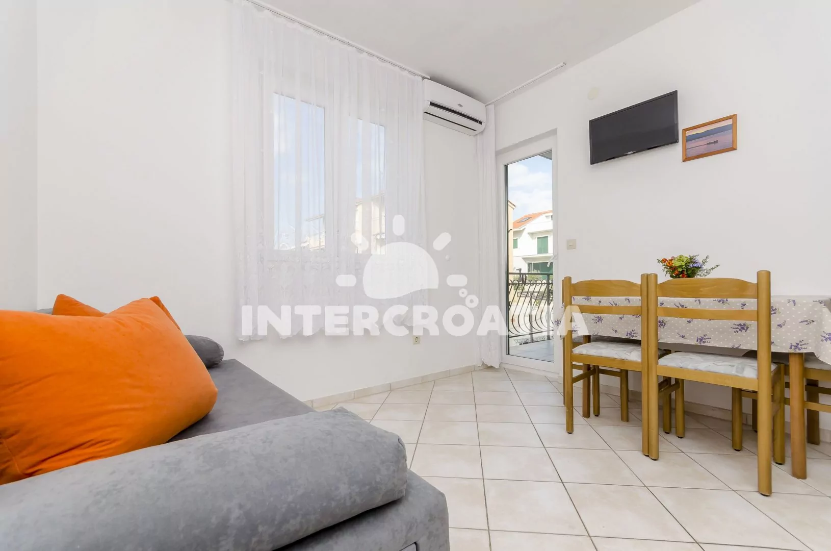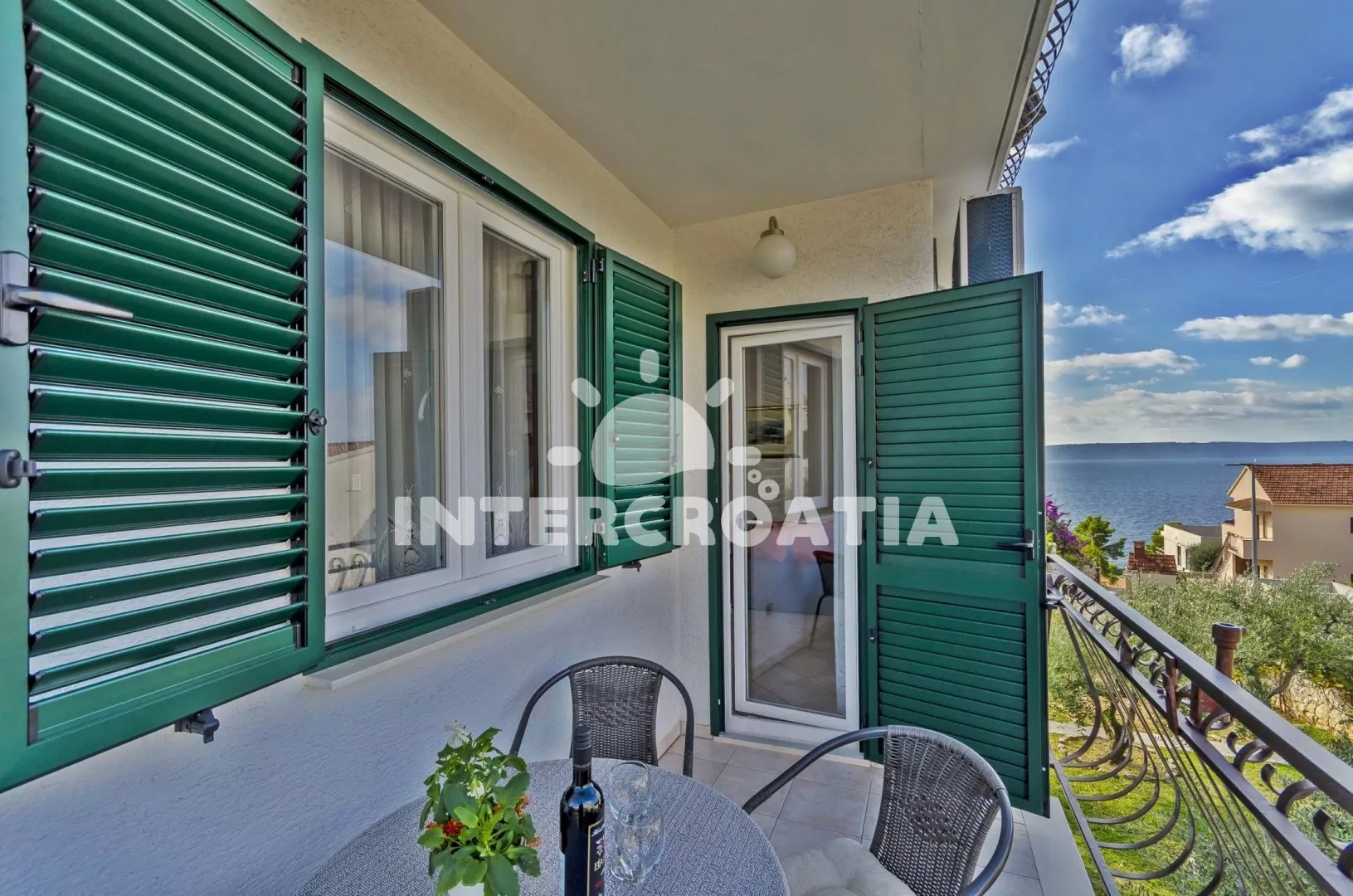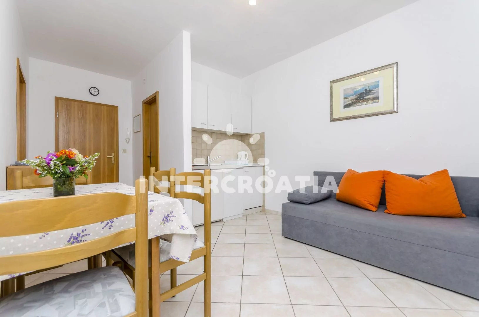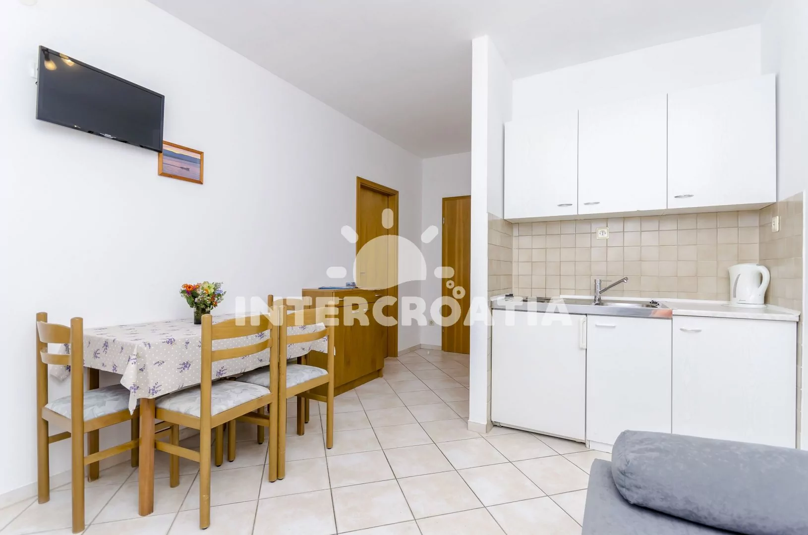 Apartmán (30 m2) s balkonem, posezením a výhledem na moře se nachází v 1. patře domu. Apartmán má 1 ložnici a je vhodný pro 2 až 4 osoby. Obývací pokoj je spojený s kuchyní. Kuchyňská linka je vybavena dvouplotýnkovým vařičem, rychlovarnou konvicí, nádobím a lednicí s mrazákem (na požádání kávovar). Obývací pokoj s jídelním stolem pro 4 osoby, pohovkou (rozložitelná na extra lůžko pro 2 osoby), televizí se satelitním programem, klimatizací a vstupem na balkon. Ložnice s jedním dvoulůžkem. Koupelna se sprchovým koutem, umyvadlem a wc. Hostům je k dispozici parkování u objektu zdarma.