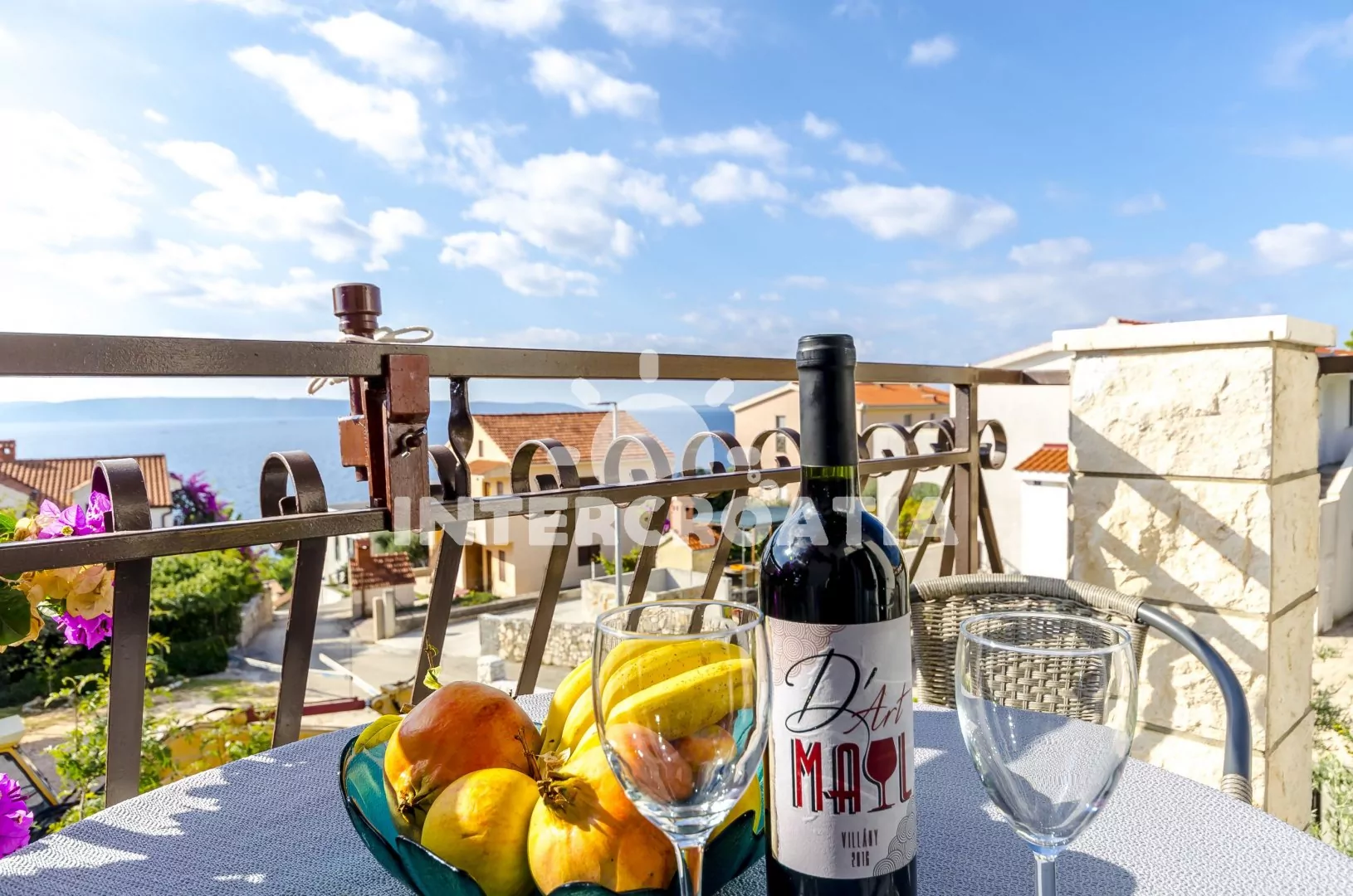 Apartmán (30 m2) s terasou, posezením a výhledem na moře se nachází v 1. patře domu. Apartmán má 1 ložnici a je vhodný pro 2 až 4 osoby. Obývací pokoj je spojený s kuchyní. Kuchyňská linka je vybavena dvouplotýnkovým vařičem, rychlovarnou konvicí, nádobím a lednicí s mrazákem (na požádání kávovar). Obývací pokoj s jídelním stolem pro 4 osoby, pohovkou (rozložitelná na extra lůžko pro 2 osoby), televizí se satelitním programem a klimatizací. Ložnice s dvoulůžkem a vstupem na terasu. Koupelna se sprchovým koutem, umyvadlem a wc. Hostům je k dispozici parkování u objektu zdarma.