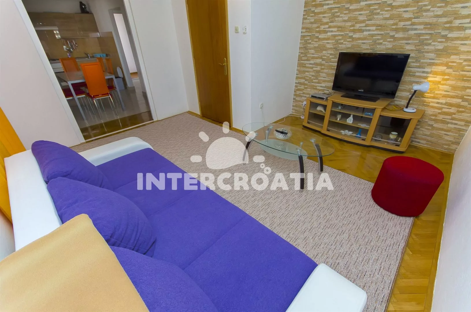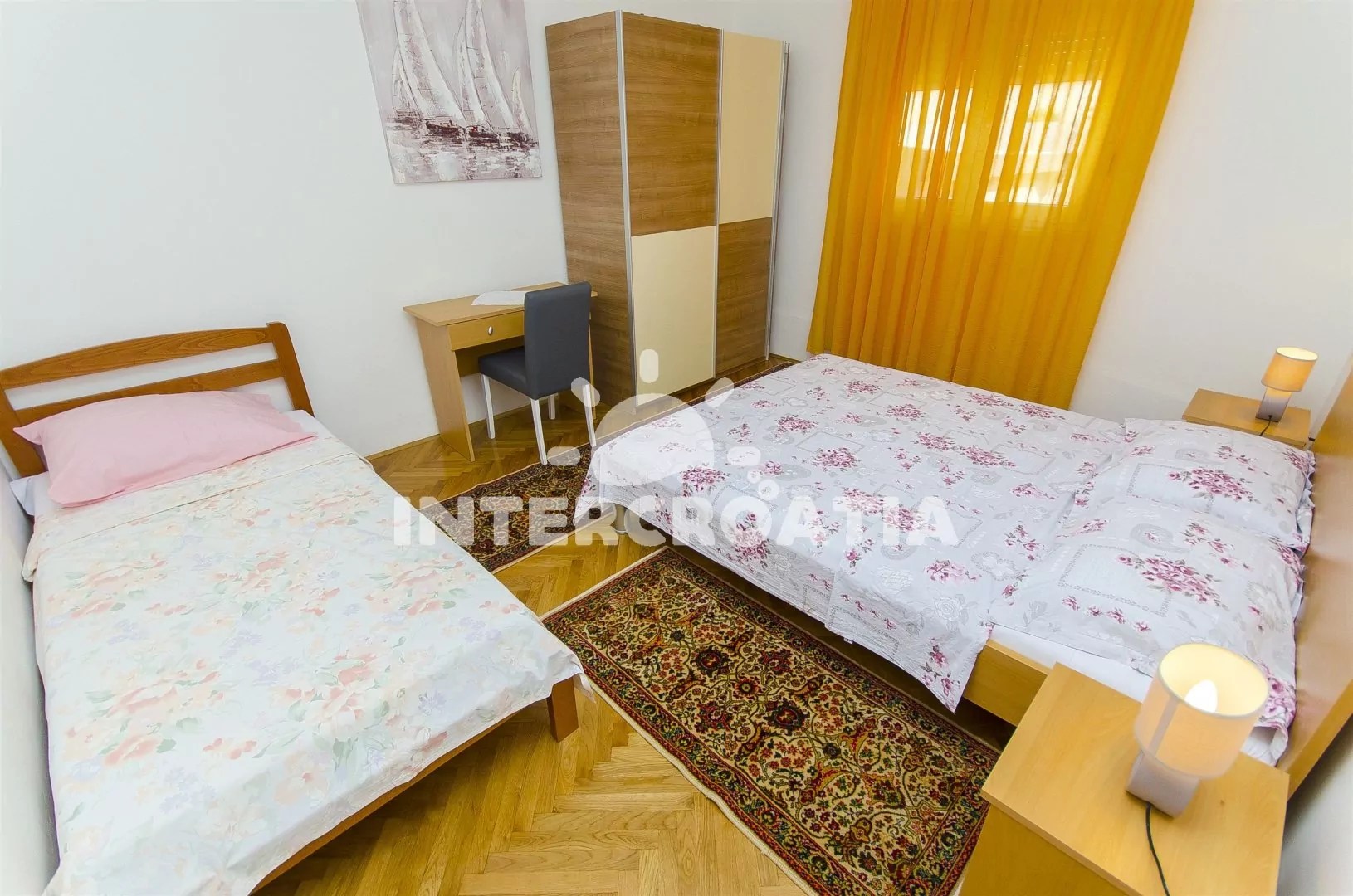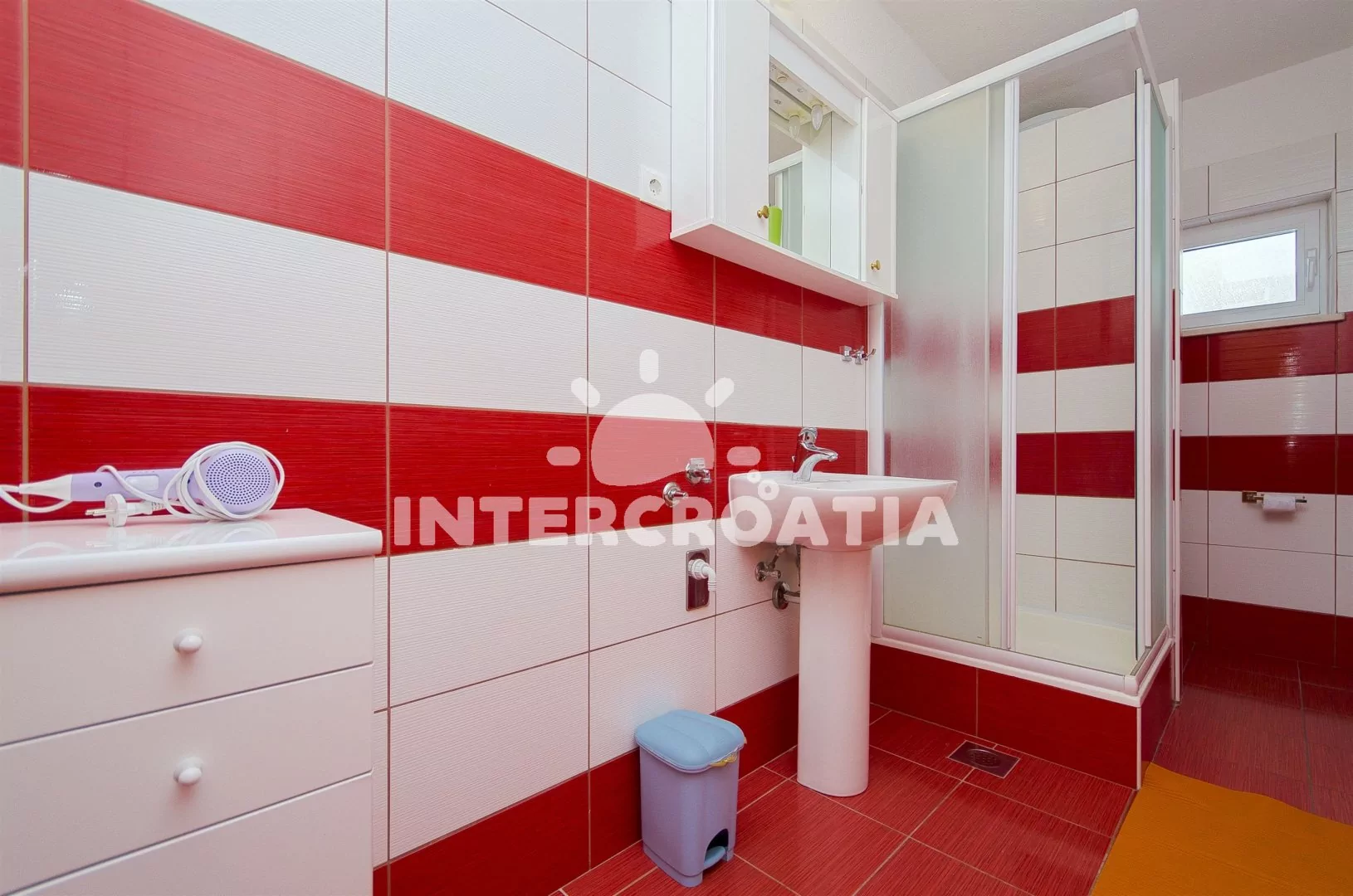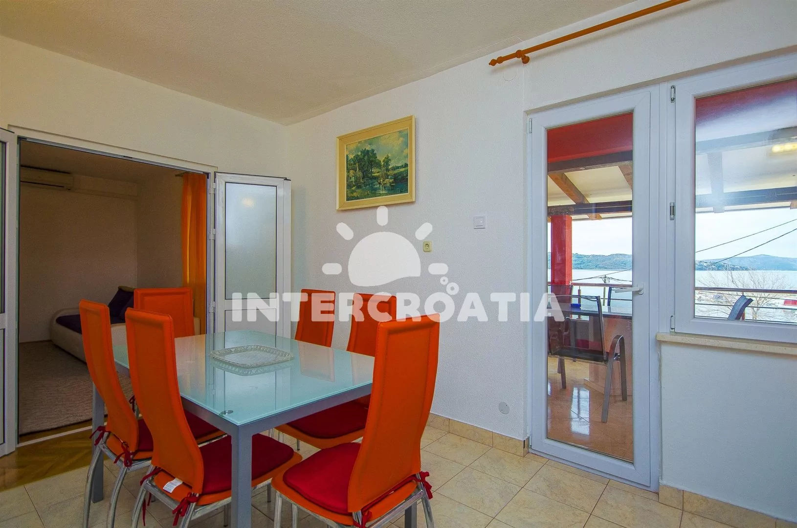 Apartmán (90 m2) s vlastní terasou, nádherným výhledem na moře a venkovním posezením se nachází v 1. patře domu. Apartmán má 2 ložnice a je vhodný pro 4 až 6 osob. Kuchyňská linka je vybavena varnou deskou, digestoří, vestavěnou troubou, rychlovarnou konvicí, kávovarem, toustovačem, nádobím a lednicí s mrazákem. Dále jídelní stůl pro 6 osob a vstup na terasu. Obývací pokoj s pohovkou (rozložitelná na extra lůžko pro 1 osobu), televizí se satelitním programem a klimatizací. První ložnice s dvoulůžkem. Druhá ložnice s dvoulůžkem a jedním jednolůžkem. Koupelna se sprchovým koutem, umyvadlem, fénem a wc. Hostům je k dispozici parkování u objektu zdarma.