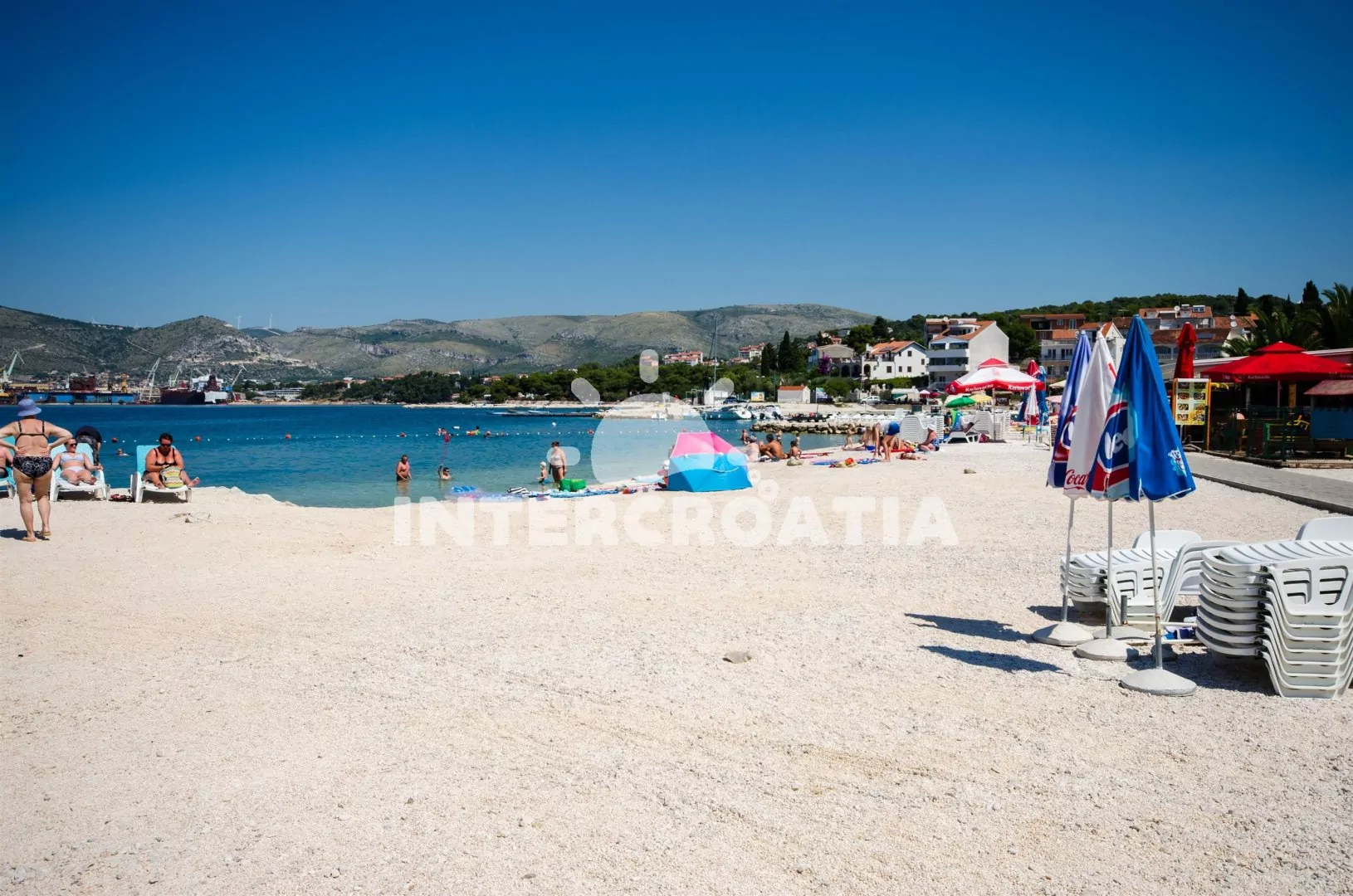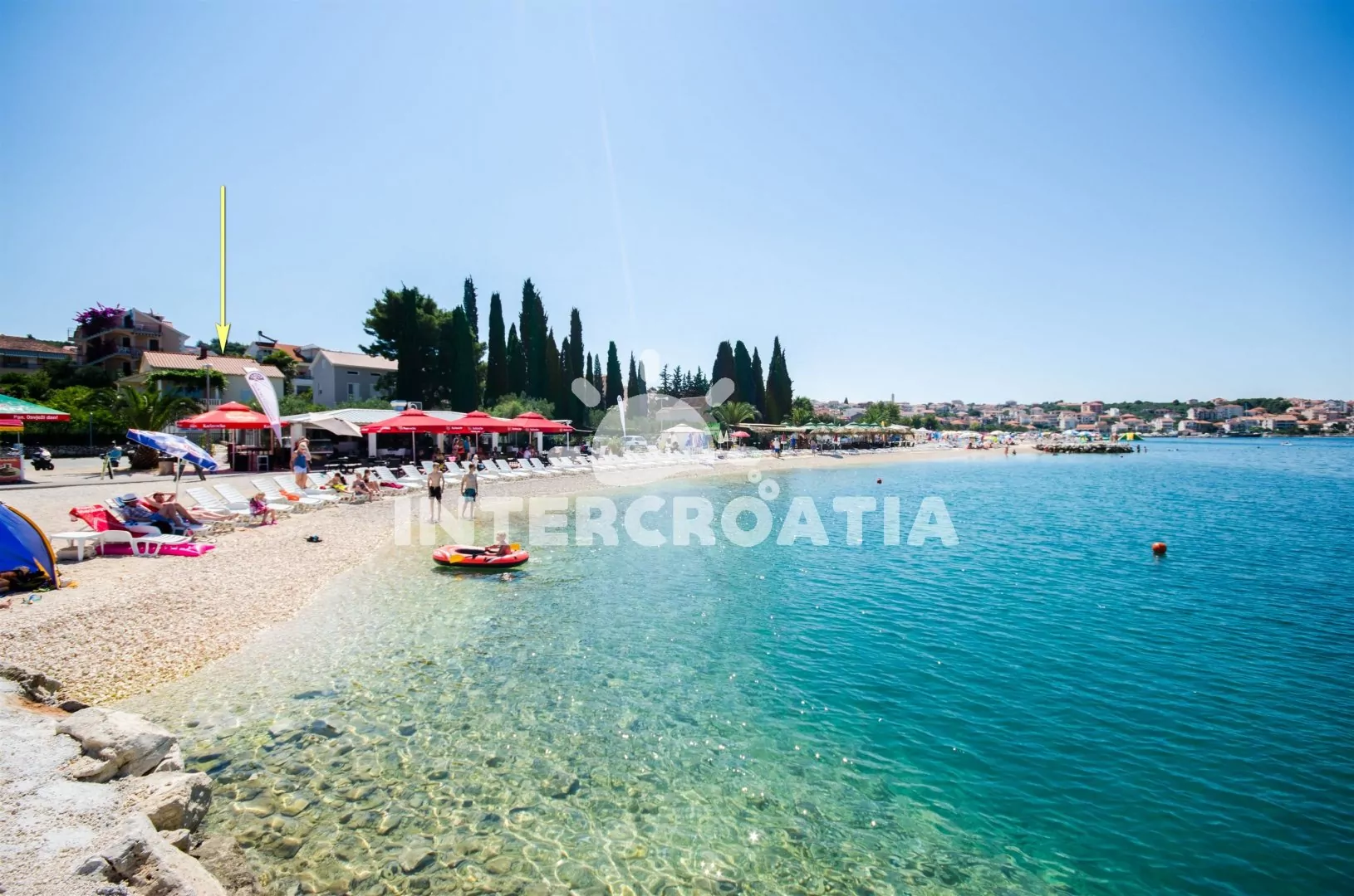 Vzdálenosti: Moře a oblázková pláž 15 m, supermarket, bar 20 m, restaurace 50 m, veřejná doprava 100 m, půjčovna cyklistických kol 100 m, směnárna a přístav 700 m, ambulance, lékárna a pošta 1 km, centrum 2,5 km, čerpací stanice 3 km, potápěčský klub 2 km, banka, muzeum a diskotéka 2,5 km, letiště (Split) 7 km, trajekt 27 km.
