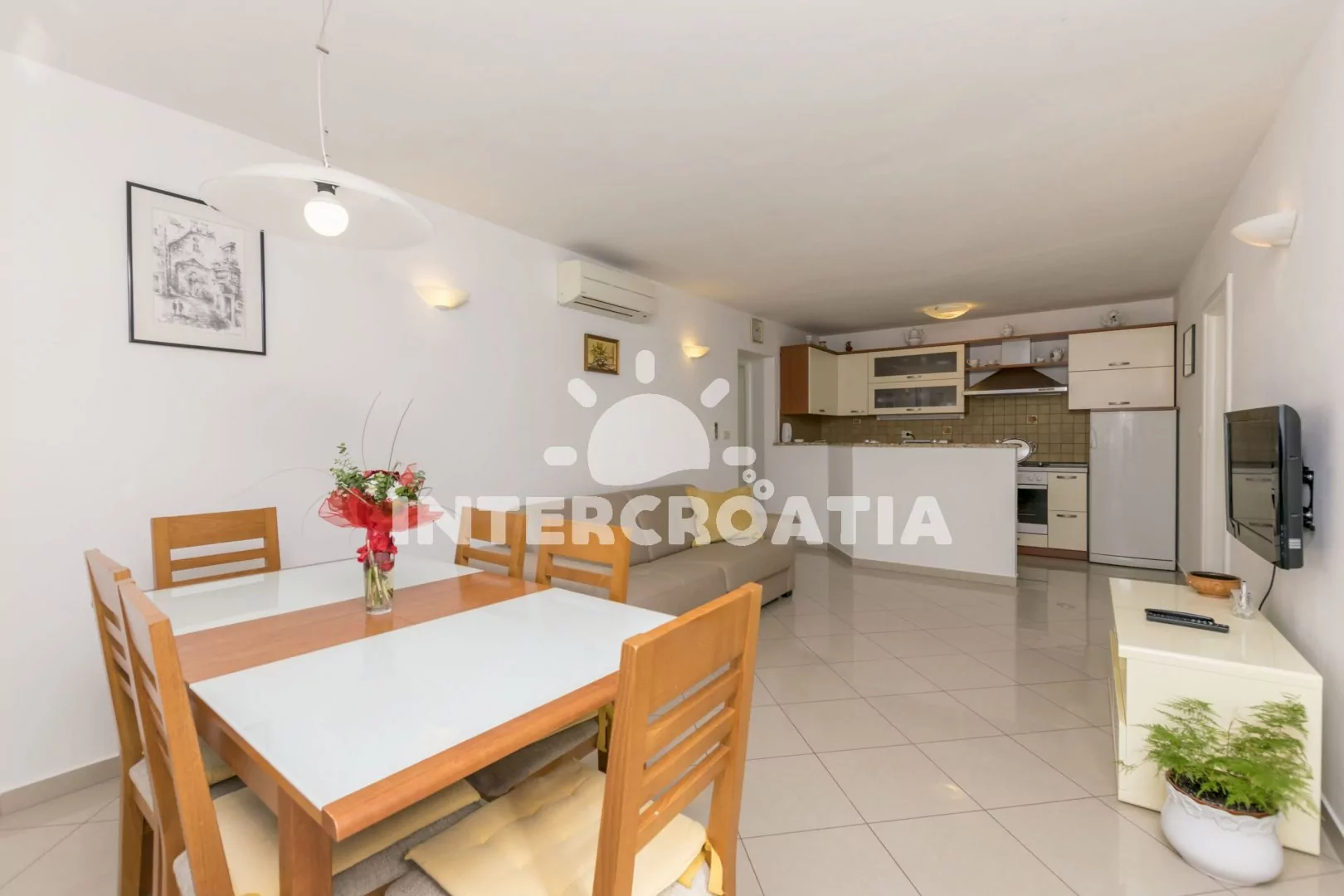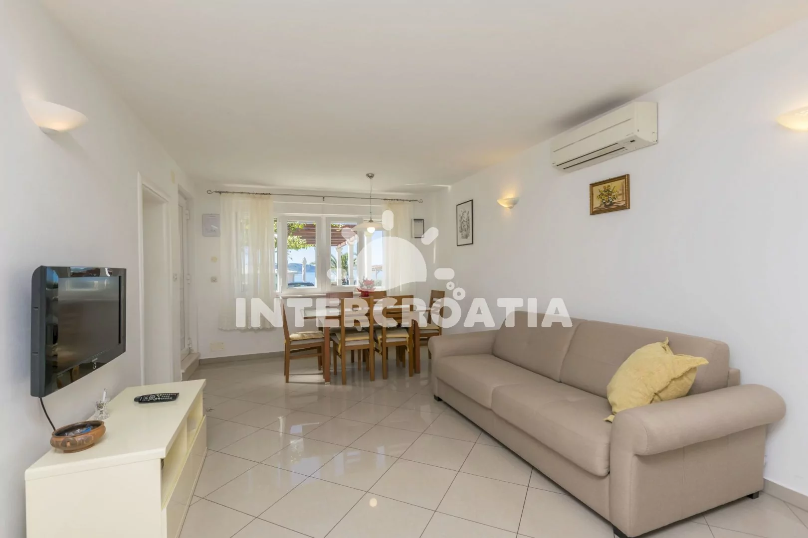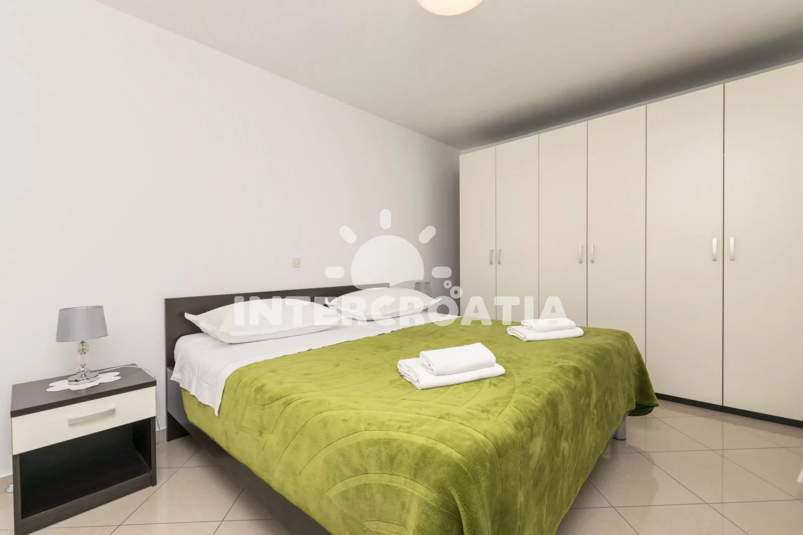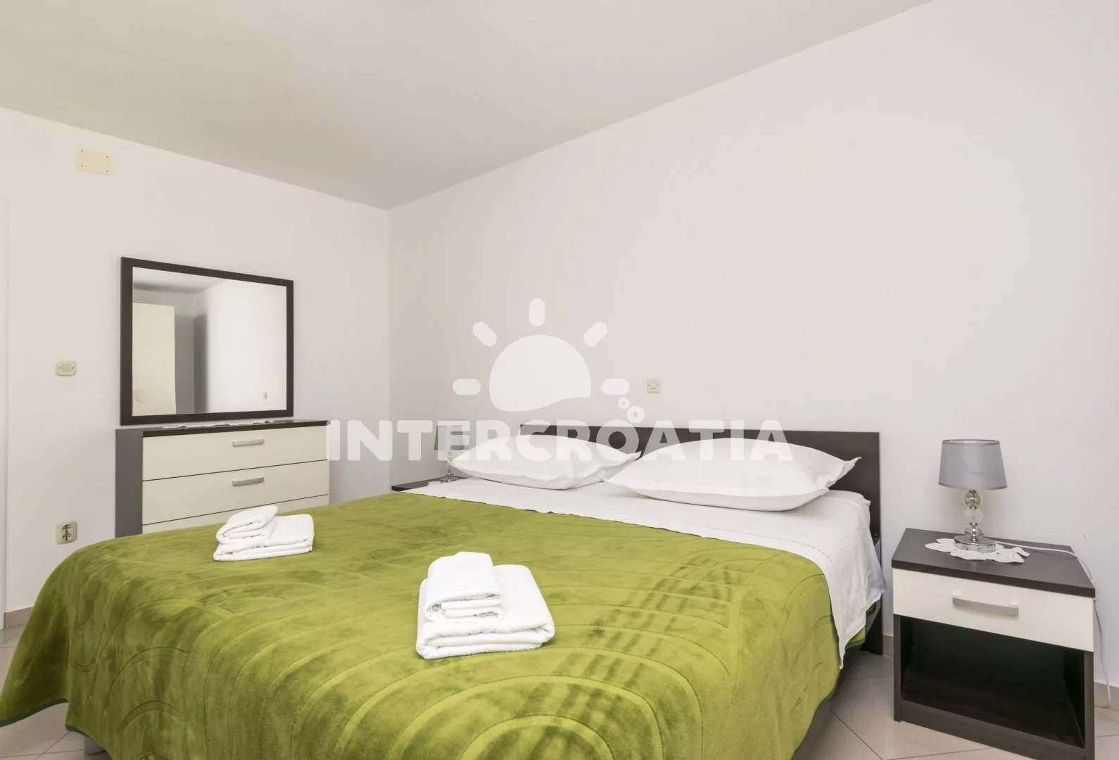 Apartmán (65 m2) s balkonem a výhledem na moře se nachází v přízemí domu. Apartmán má 2 ložnice a je vhodný pro 4 až 5 osob. Obývací pokoj je spojený s kuchyní. Kuchyňská linka je vybavena varnou deskou, digestoří, vestavěnou troubou, myčkou na nádobí, kávovarem, mikrovlnnou troubou, nádobím a lednicí s mrazákem. Obývací pokoj s jídelním stolem, pohovkou (rozložitelná na extra lůžko pro 1 osobu), televizí se satelitním programem a klimatizací. První ložnice s dvoulůžkem. Druhá ložnice s dvoulůžkem. Koupelna se sprchovým koutem, umyvadlem, pračkou, fénem a wc. Hostům je k dispozici parkování u objektu zdarma.