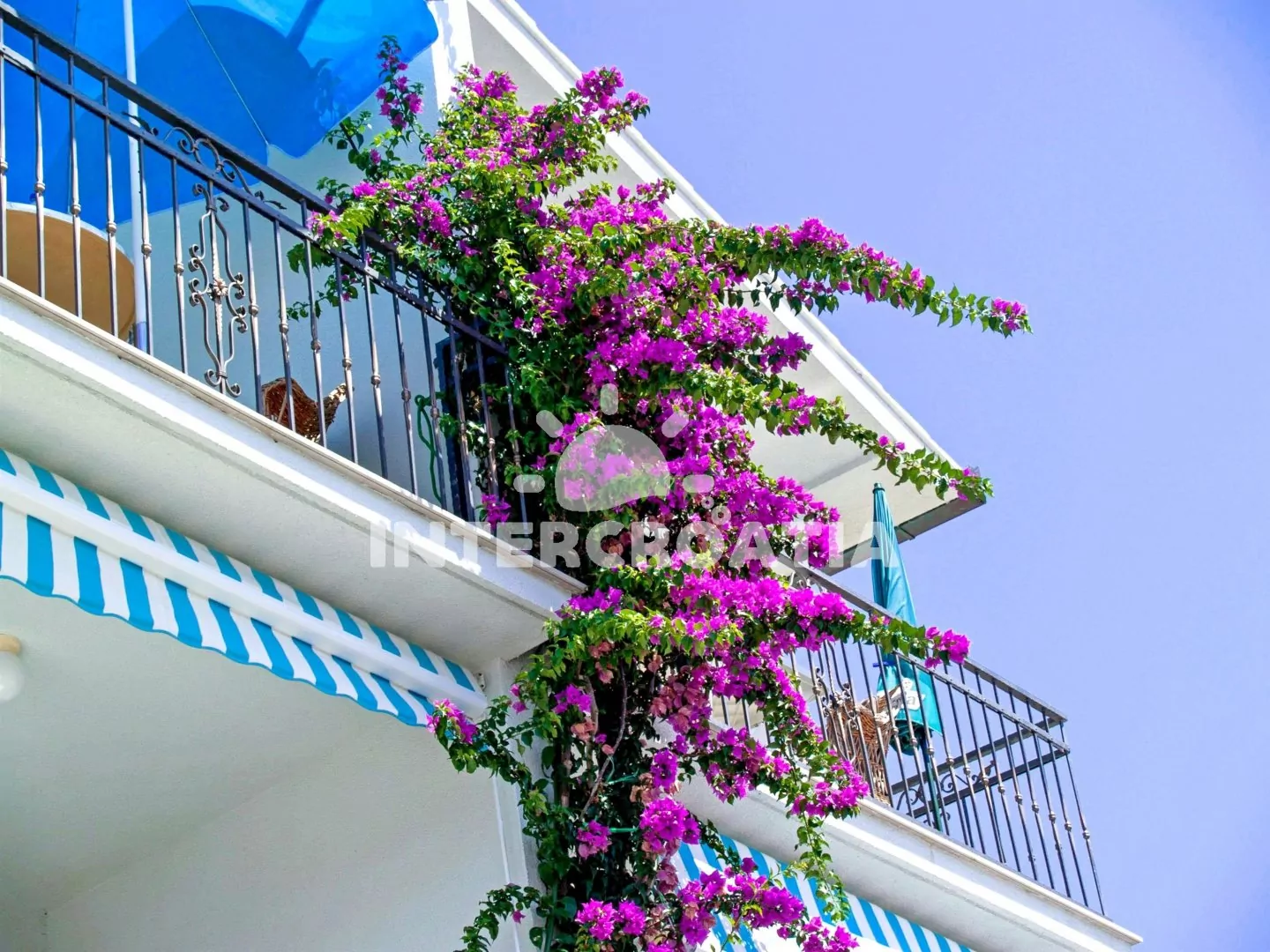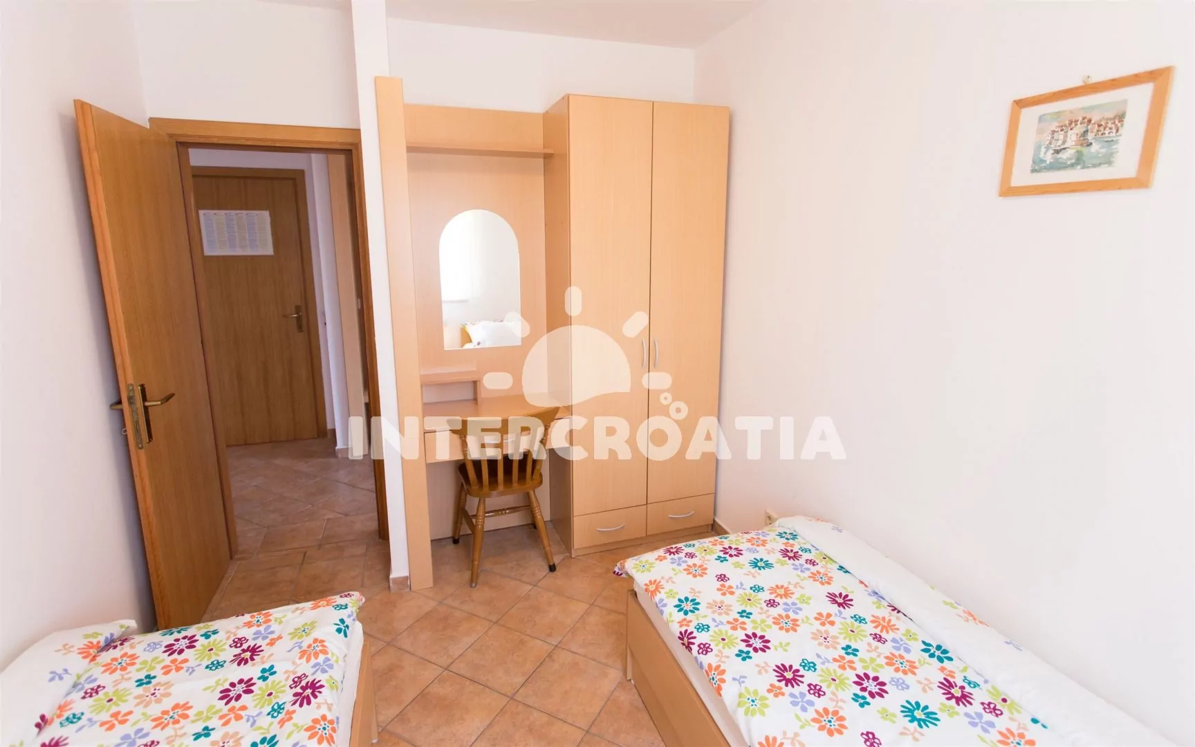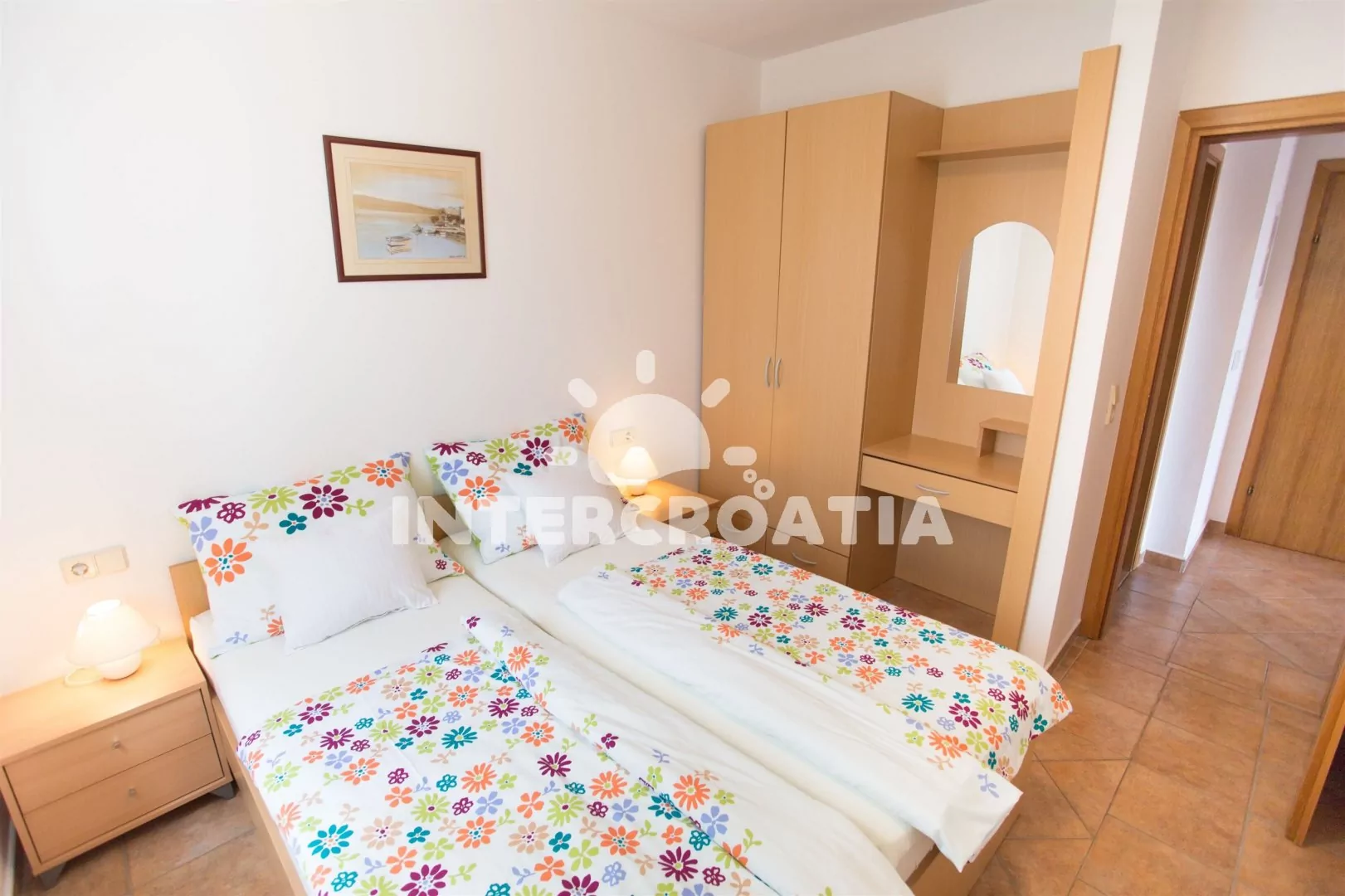 Apartmán (55 m2) s terasou a výhledem na moře se nachází v 1. patře domu. Apartmán má 2 ložnice a je vhodný pro 4 až 5 osob. Obývací pokoj je spojený s kuchyní. Kuchyňská linka je vybavena sklokeramickou varnou deskou, digestoří, vestavěnou troubou, myčkou na nádobí, mikrovlnnou troubou, rychlovarnou konvicí, kávovarem, nádobím a lednicí s mrazákem. Obývací pokoj s jídelním stolem, pohovkou (rozložitelná na extra lůžko pro 1 osobu), televizí se satelitním programem, klimatizací a vstupem na terasu. První ložnice s dvoulůžkem. Druhá ložnice s dvěma jednolůžky. Koupelna se sprchovým koutem, umyvadlem a wc. Hostům je k dispozici parkování u objektu zdarma.