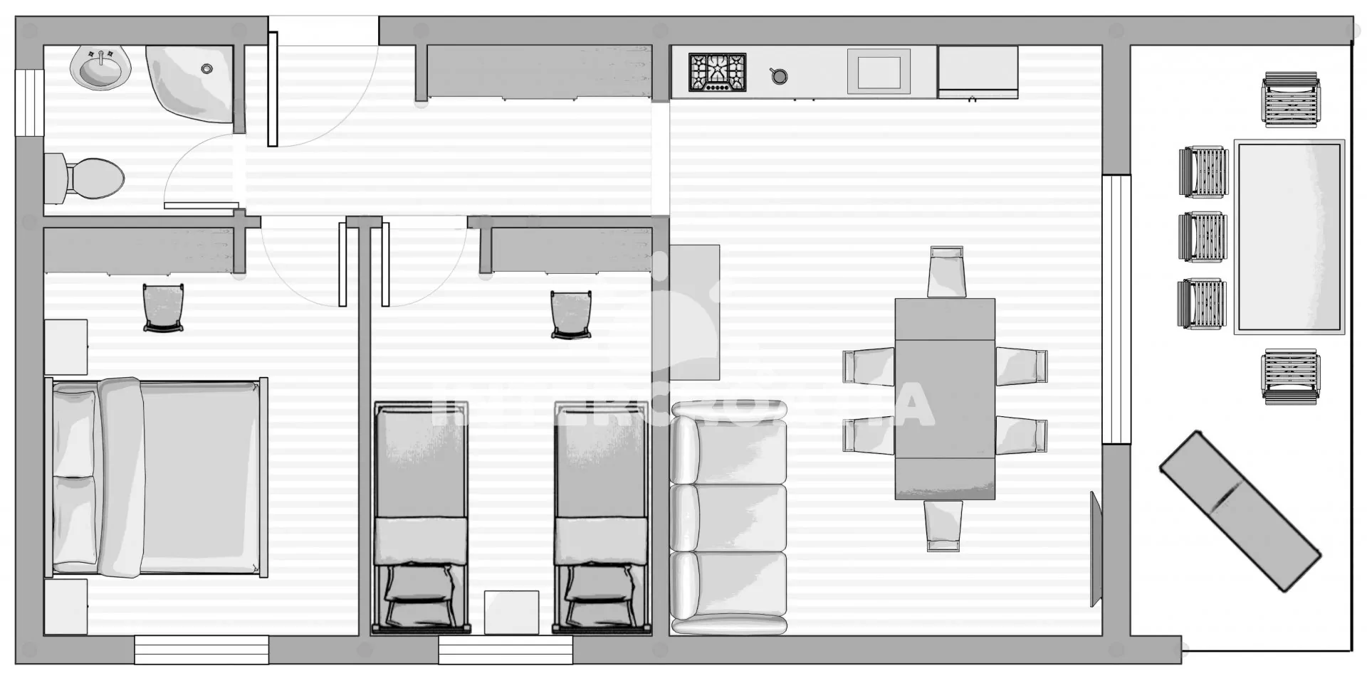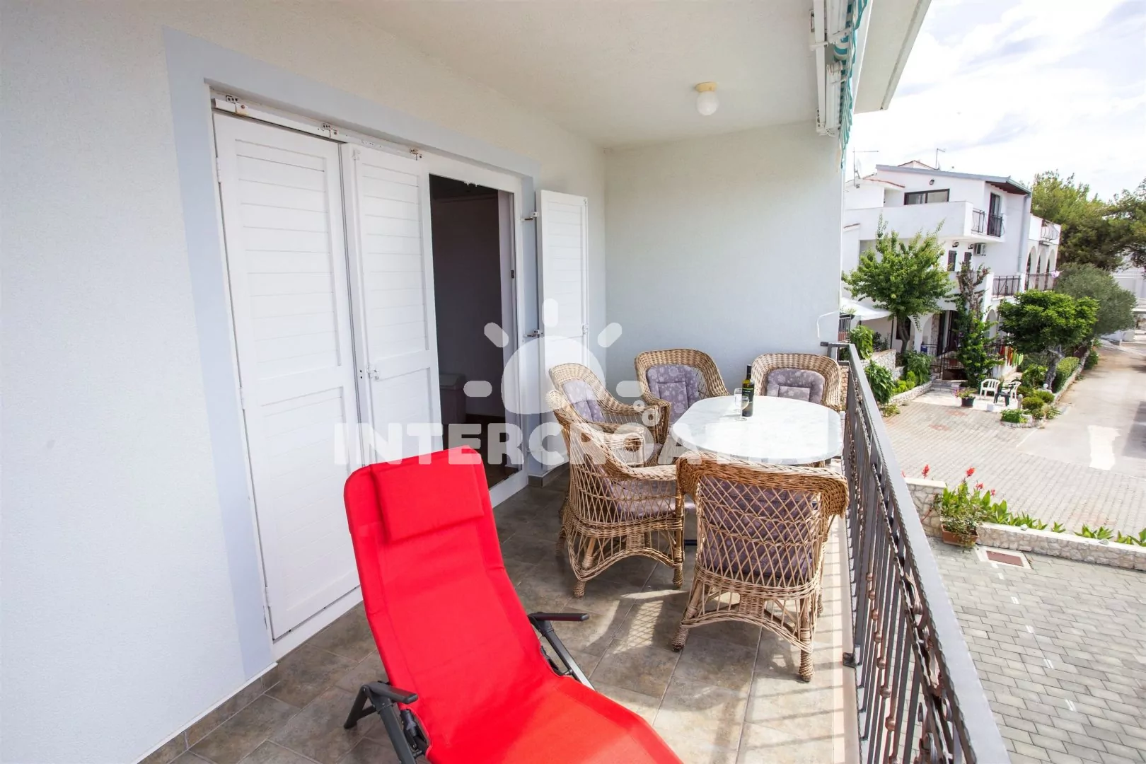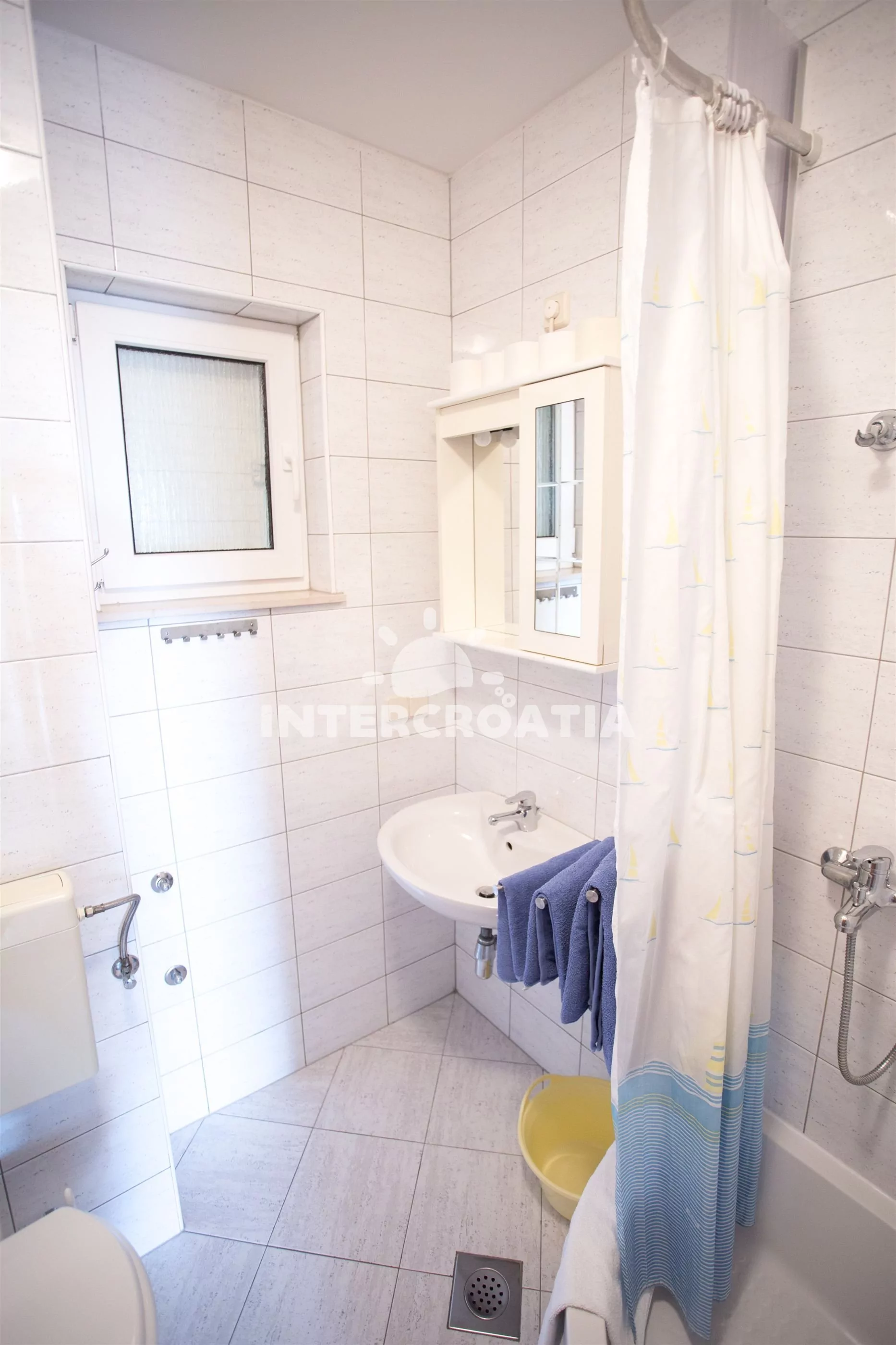 Apartmán (55 m2) s terasou a výhledem na moře se nachází v 1. patře domu. Apartmán má 2 ložnice a je vhodný pro 4 až 5 osob. Obývací pokoj je spojený s kuchyní. Kuchyňská linka je vybavena sklokeramickou varnou deskou, digestoří, vestavěnou troubou, myčkou na nádobí, mikrovlnnou troubou, rychlovarnou konvicí, kávovarem, nádobím a lednicí s mrazákem. Obývací pokoj s jídelním stolem, pohovkou (rozložitelná na extra lůžko pro 1 osobu), televizí se satelitním programem, klimatizací a vstupem na terasu. První ložnice s dvoulůžkem. Druhá ložnice s dvěma jednolůžky. Koupelna se sprchovým koutem, umyvadlem a wc. Hostům je k dispozici parkování u objektu zdarma.