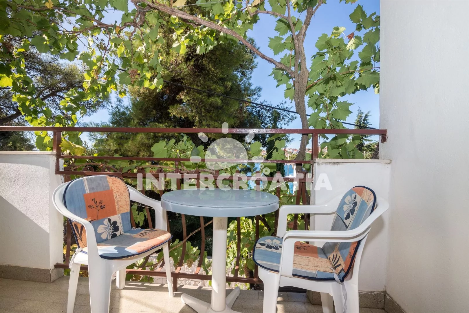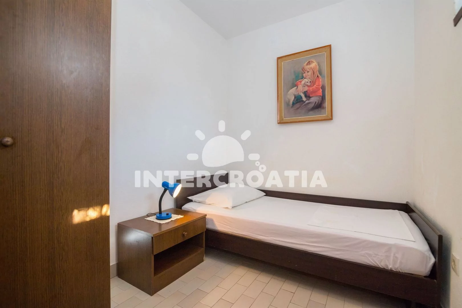 Apartmán (55 m2) s terasou, posezením a výhledem na moře se nachází v 1. patře domu. Apartmán má 2 ložnice, 2 koupelny a je vhodný pro až 5 osob. Obývací pokoj je spojený s kuchyní. Kuchyňská linka je vybavena sporákem s troubou, digestoří, nádobím a lednicí s mrazákem. Obývací pokoj s jídelním stolem, televizí se satelitním programem, klimatizací, dvěma jednolůžky a vstupem na balkon. První ložnice s dvoulůžkem a vstupem na balkon. Druhá ložnice s jedním jednolůžkem. Dvě koupelny se sprchovým koutem, umyvadlem a wc. Hostům je k dispozici parkování u objektu zdarma.