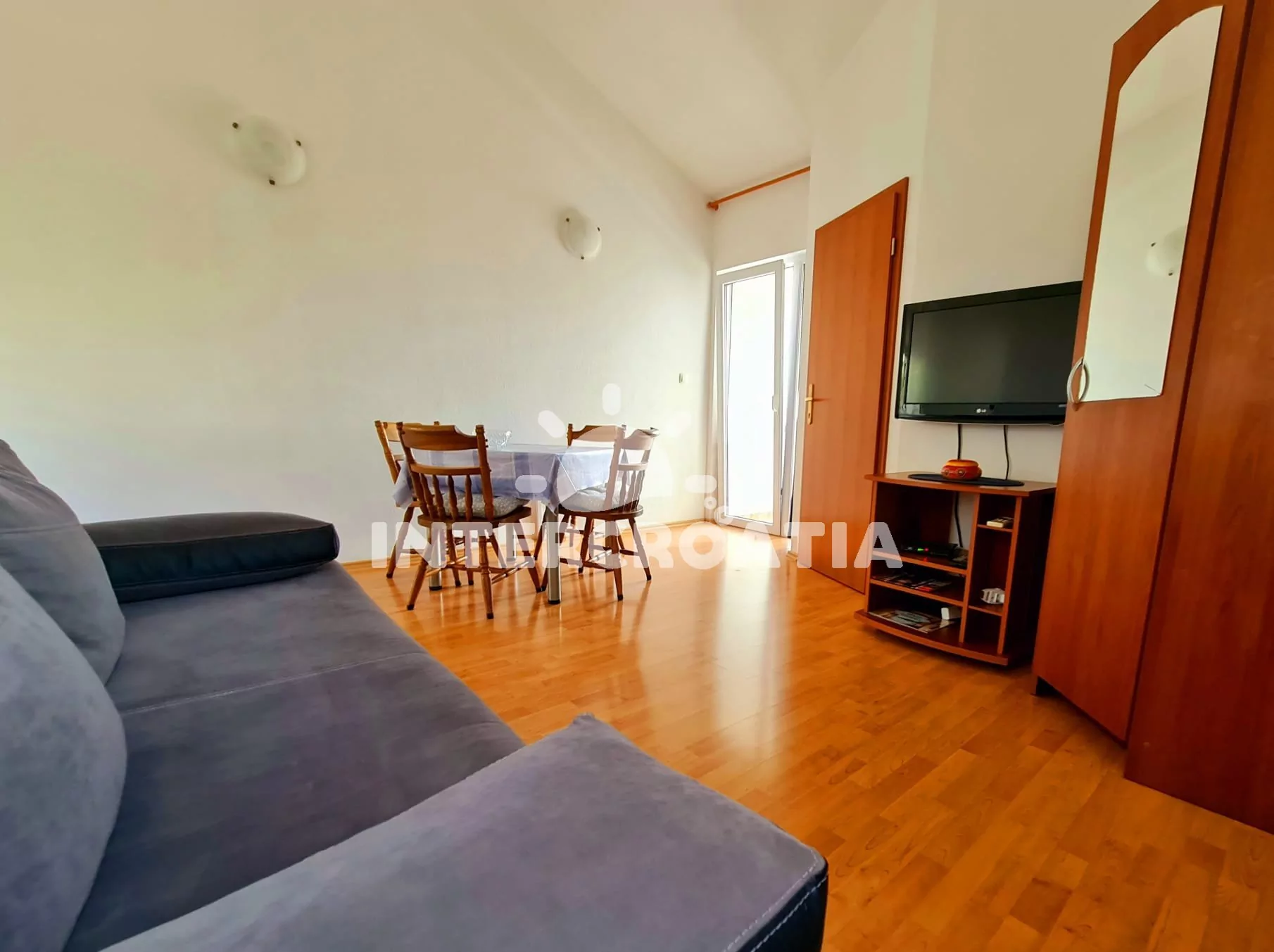 Apartmán (32 m2) s balkonem, posezením a výhledem na moře se nachází ve 2. patře domu. Apartmán má 1 ložnici a je vhodný pro 2 až 4 osoby. Obývací pokoj je spojený s kuchyní. Kuchyňská linka je vybavena dvouplotýnkovým vařičem, rychlovarnou konvicí, toustovačem, kávovarem, nádobím a lednicí s mrazákem. Obývací pokoj s jídelním stolem, pohovkou (rozložitelná na extra lůžko pro 2 osoby), televizí se satelitním programem, klimatizací a vstupem na balkon. Ložnice s dvoulůžkem. Koupelna se sprchovým koutem, umyvadlem a wc. Hostům je k dispozici parkování u objektu zdarma.